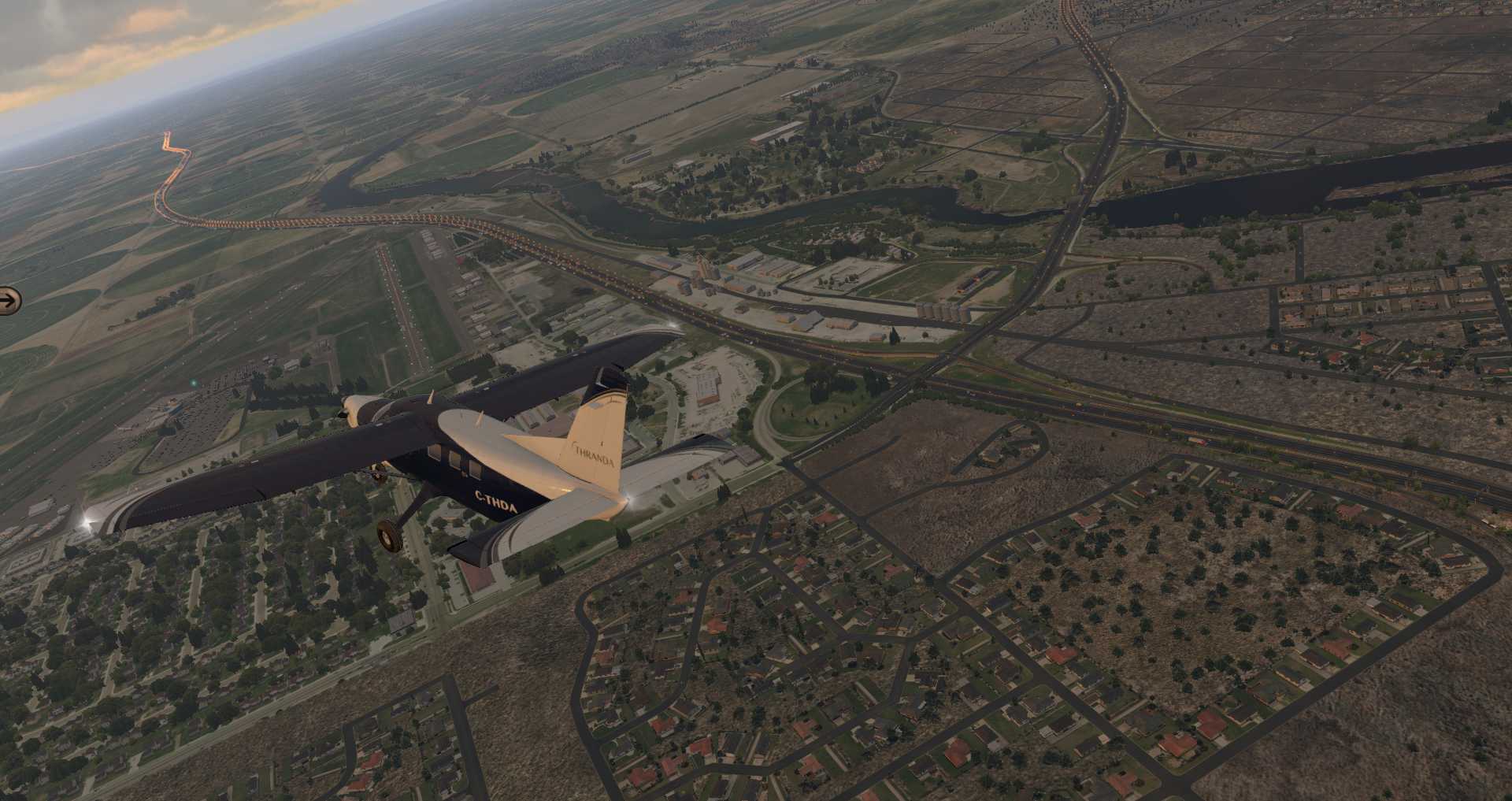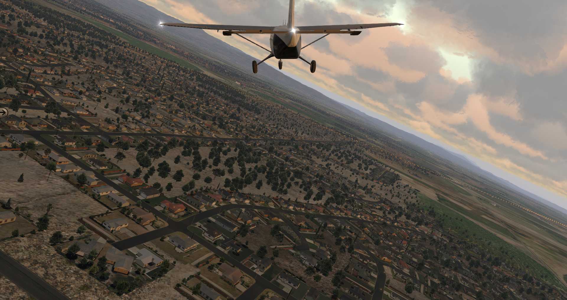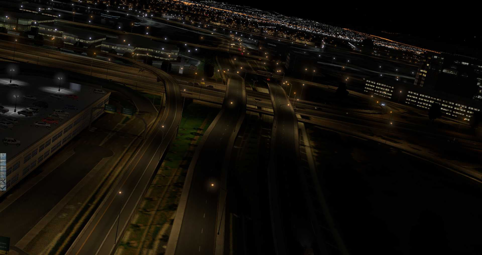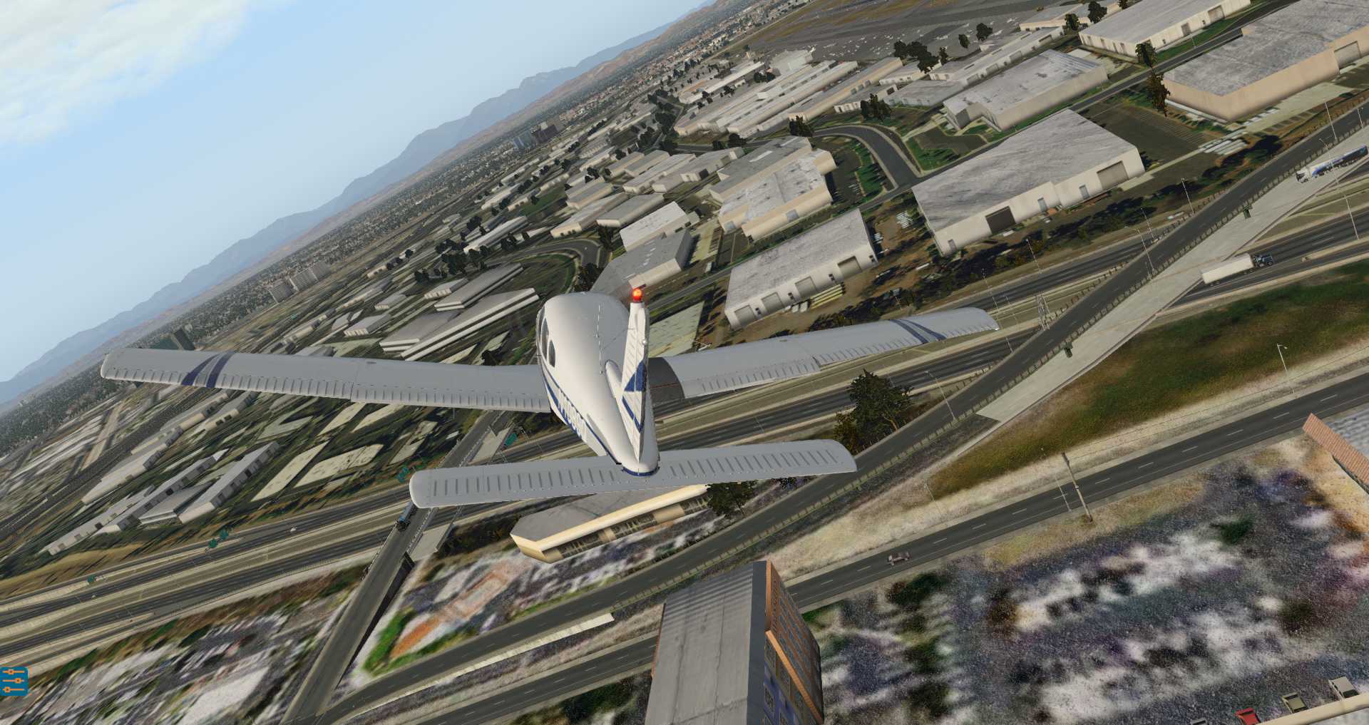 Nach dem Start sehen wir die weitaus besseren Custom-Gebäude, eingerahmt in eine hoch aufgelöste Fototextur. Irgendwann hören die Custom-Gebäude auf, während die Fototextur vom AutoGen bedeckt wird. Doch damit haben wir ein kleines Problem. Wir wissen nicht wo die Fototextur endet, denn wie ich damals schrieb ist bei mir Kalifornien mit einer Fototextur bedeckt. Sie reicht also so weit aus Auge reicht.