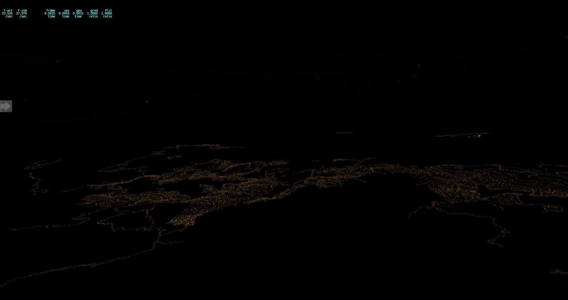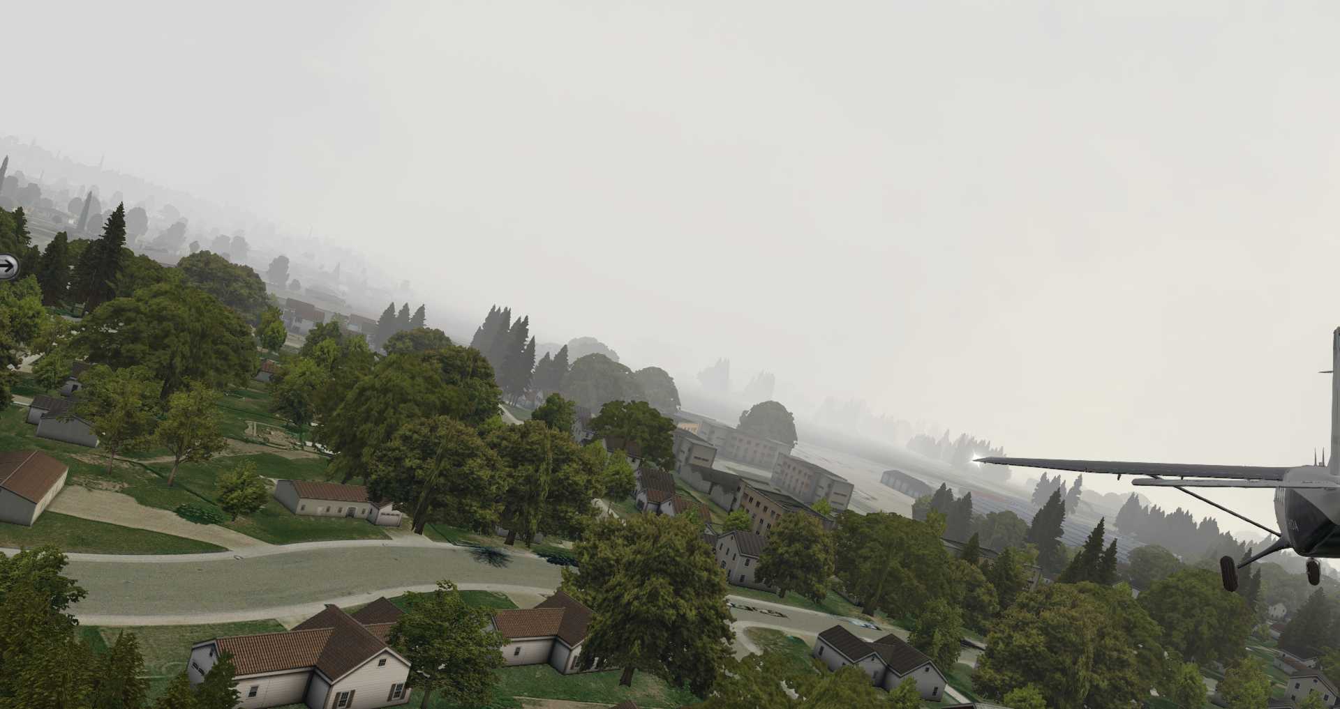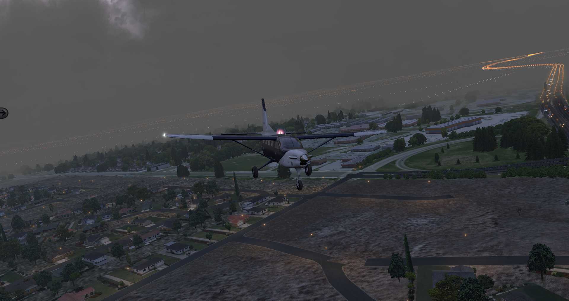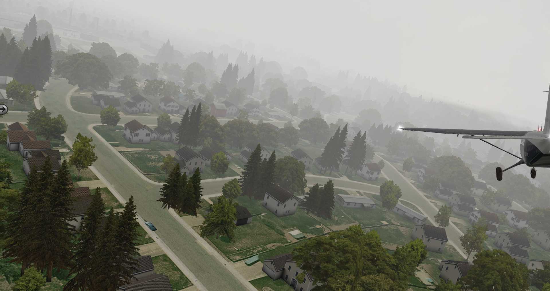 Nach dem Start sehen wir die weitaus besseren Custom-Gebäude, eingerahmt in eine hoch aufgelöste Fototextur. Irgendwann hören die Custom-Gebäude auf, während die Fototextur vom AutoGen bedeckt wird. Doch damit haben wir ein kleines Problem. Wir wissen nicht wo die Fototextur endet, denn wie ich damals schrieb ist bei mir Kalifornien mit einer Fototextur bedeckt. Sie reicht also so weit aus Auge reicht.