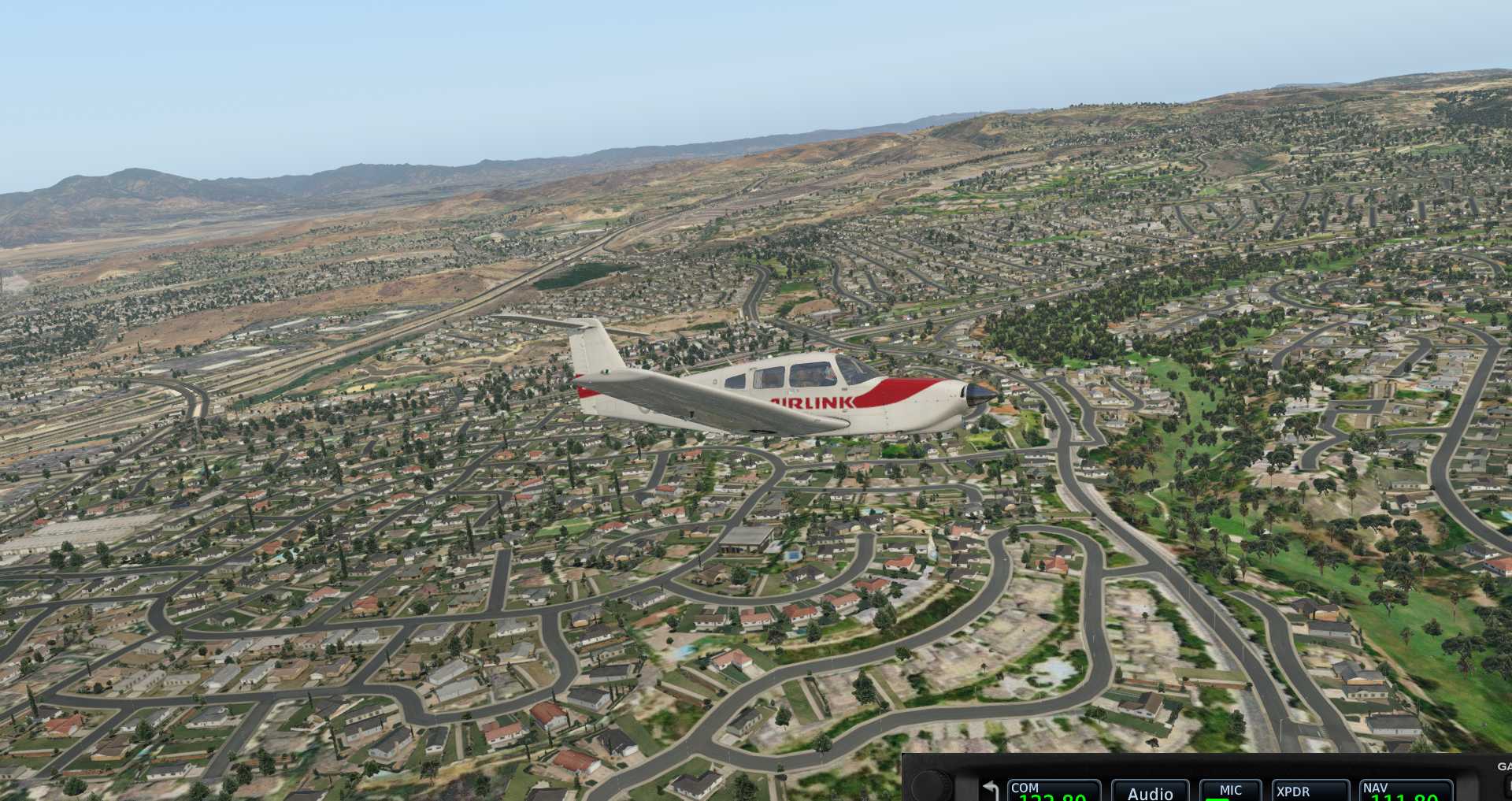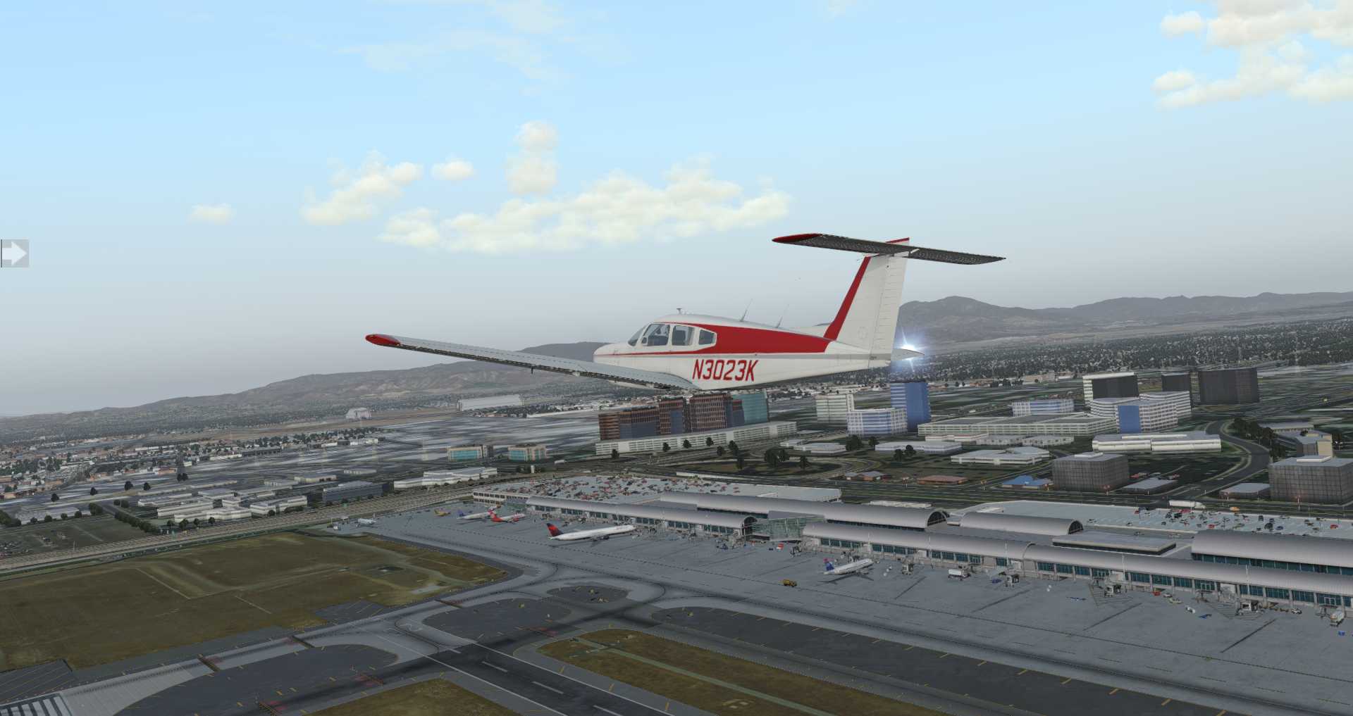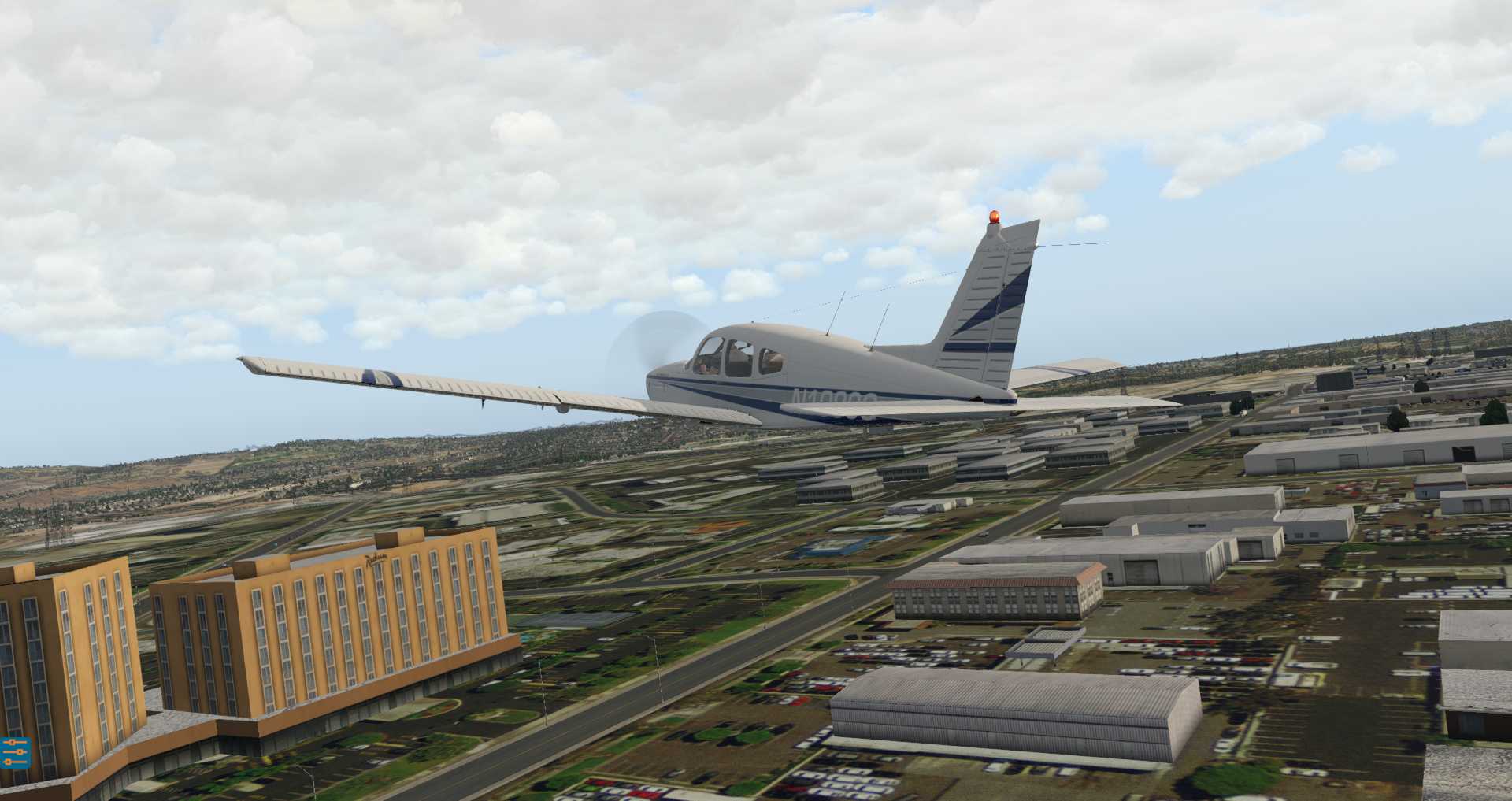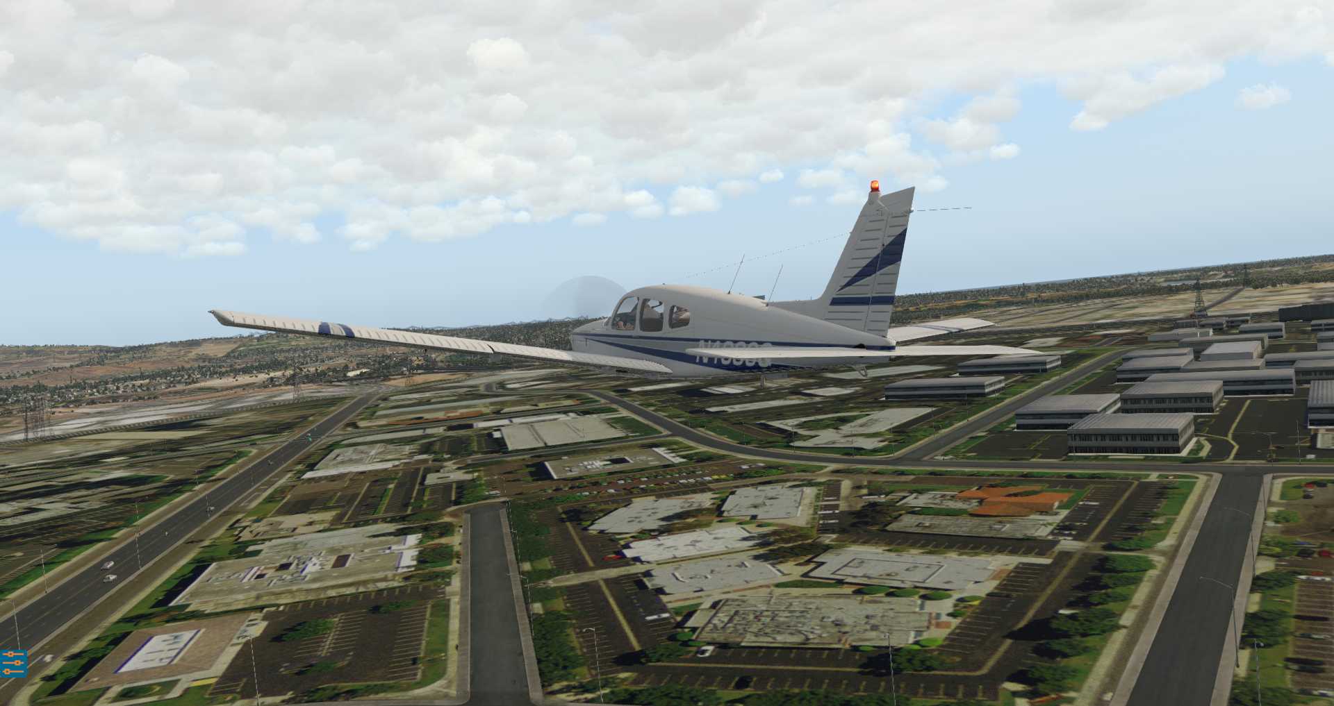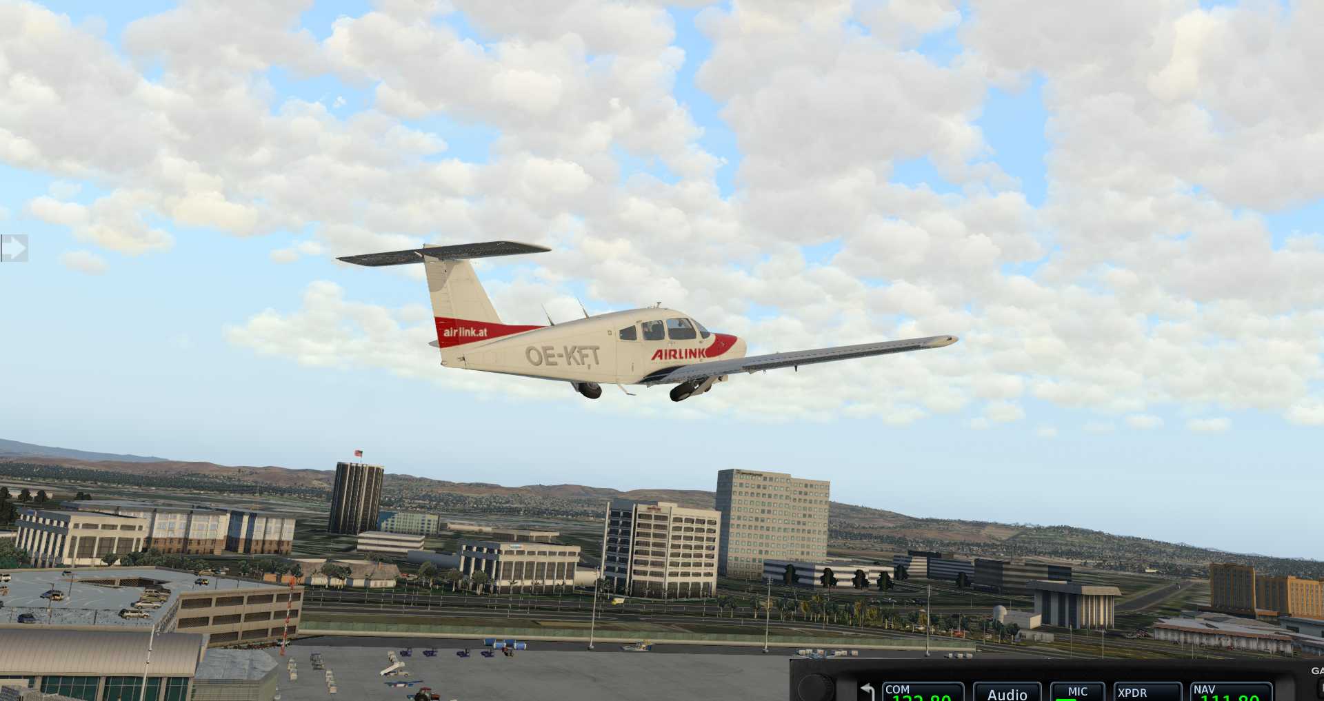 Schon im Auslieferungszustand von X-Plane 11 kann sich der Flughafen durchaus sehen lassen, wie wir hier bei einem Flug mit einer JustFlight Piper Arrow III sehen:
