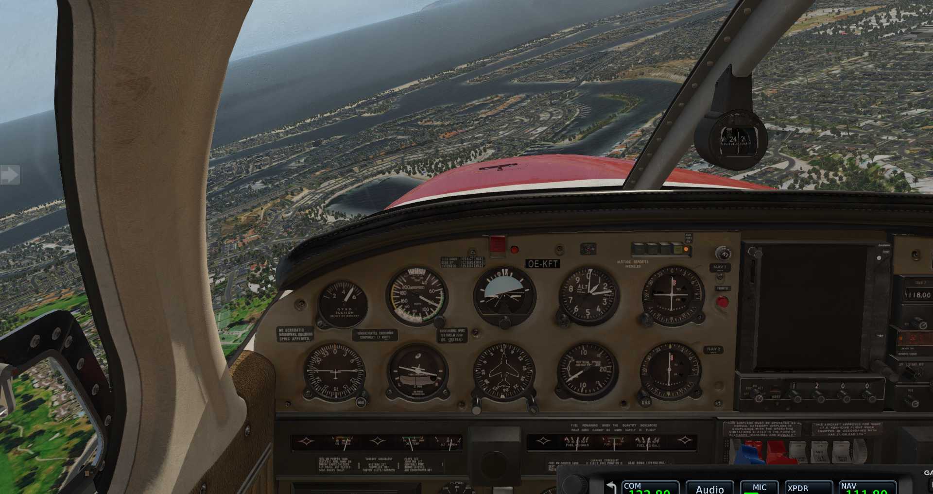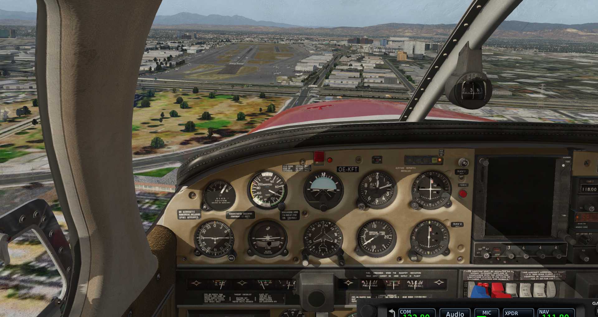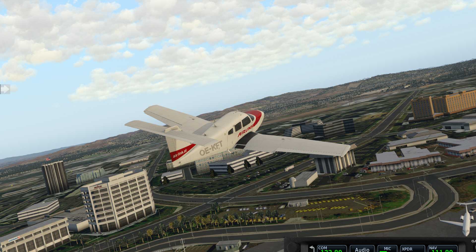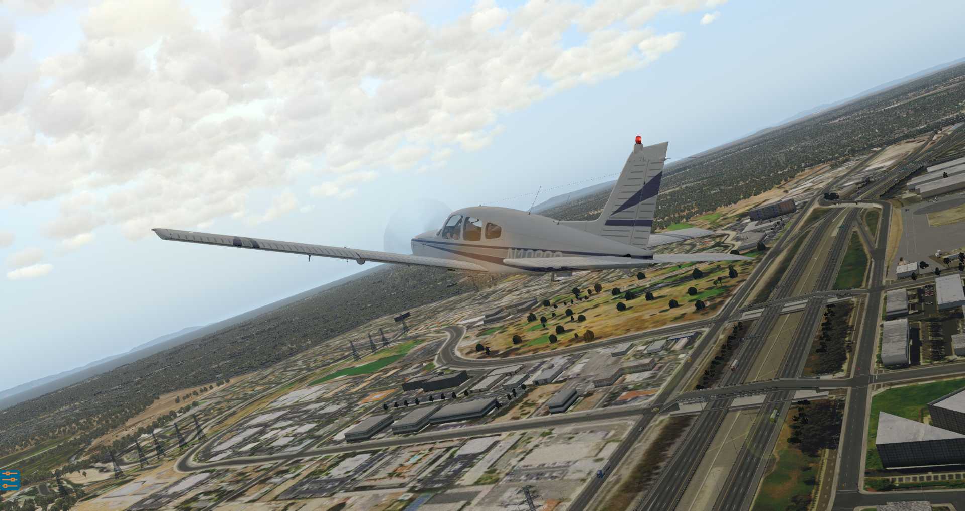 Schon im Auslieferungszustand von X-Plane 11 kann sich der Flughafen durchaus sehen lassen, wie wir hier bei einem Flug mit einer JustFlight Piper Arrow III sehen: