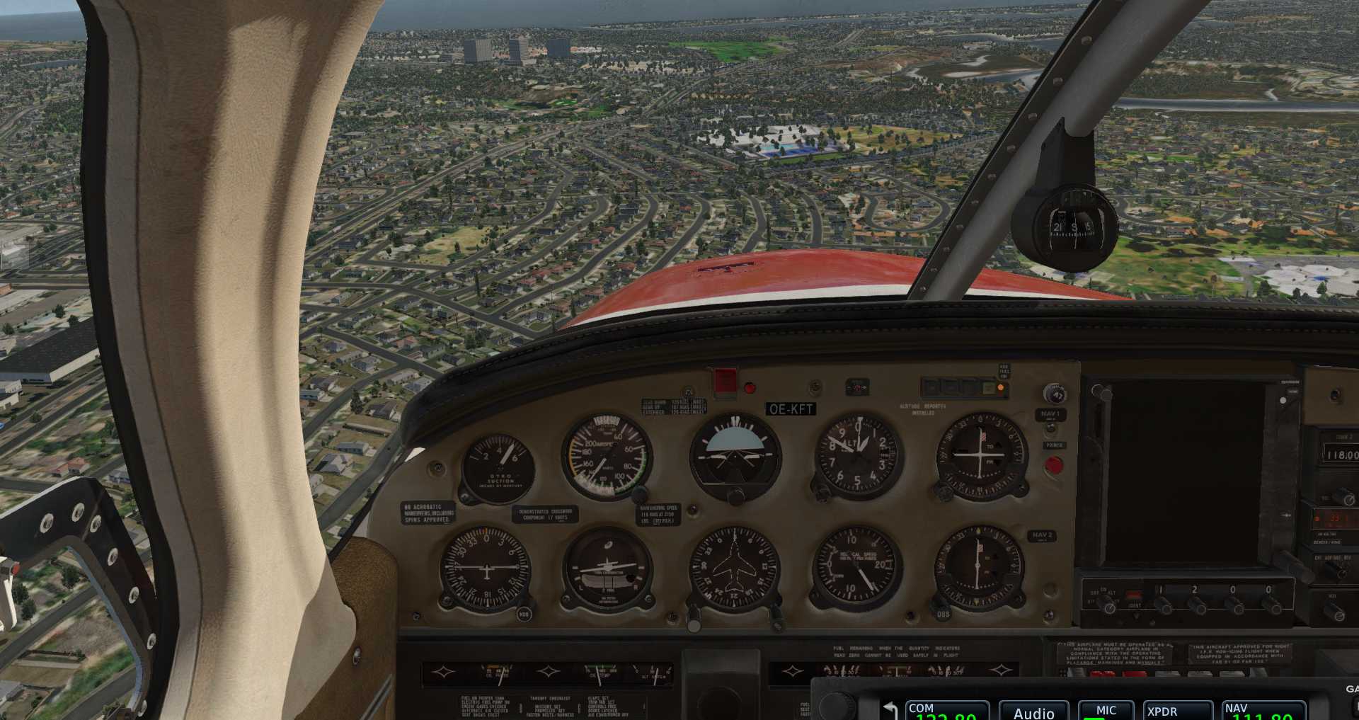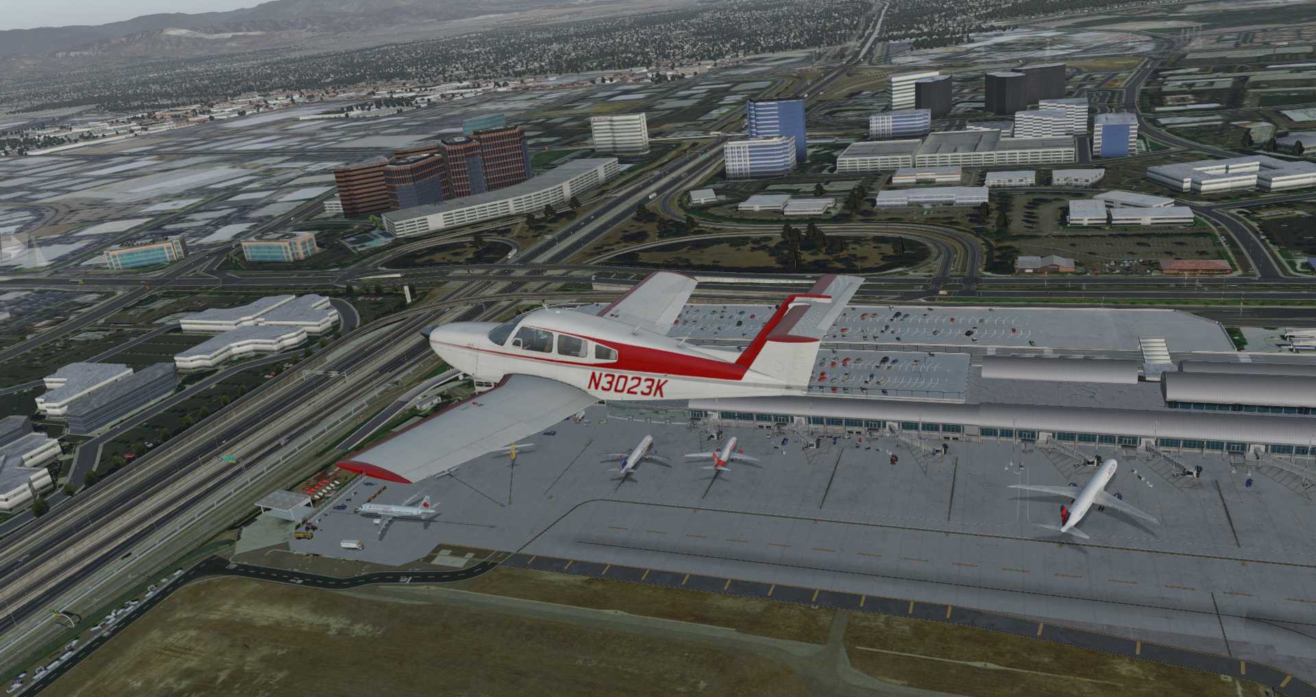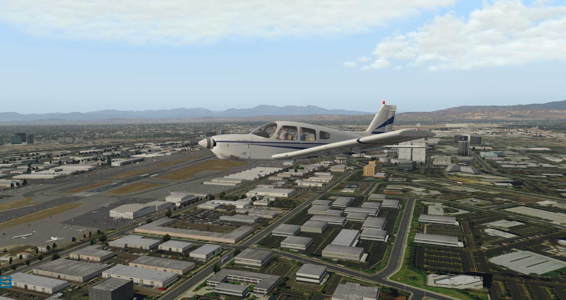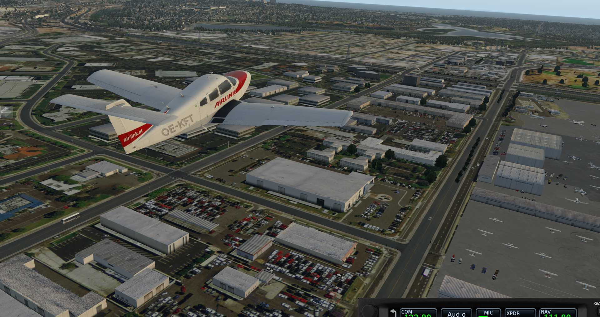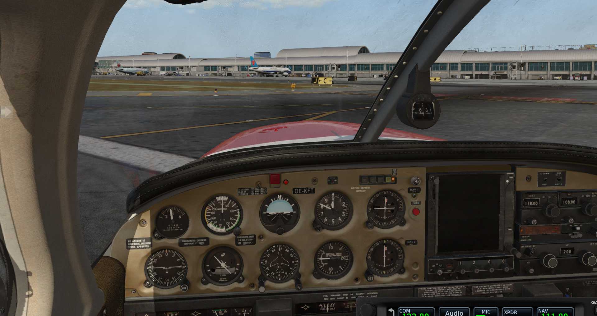 Schon im Auslieferungszustand von X-Plane 11 kann sich der Flughafen durchaus sehen lassen, wie wir hier bei einem Flug mit einer JustFlight Piper Arrow III sehen: