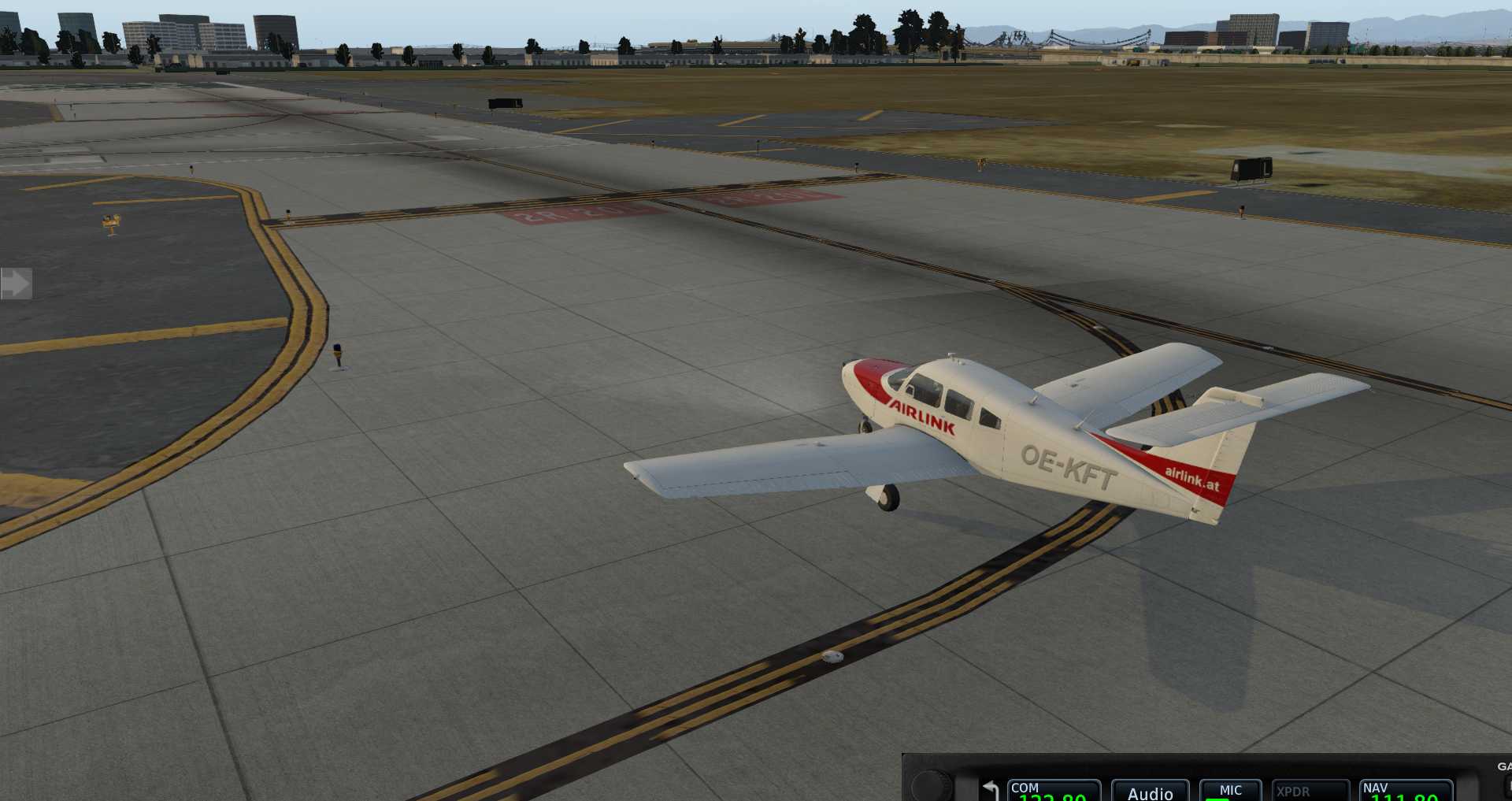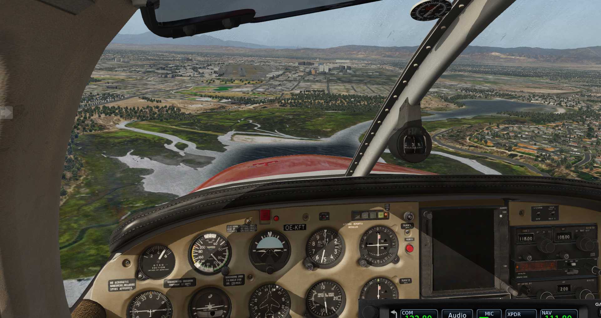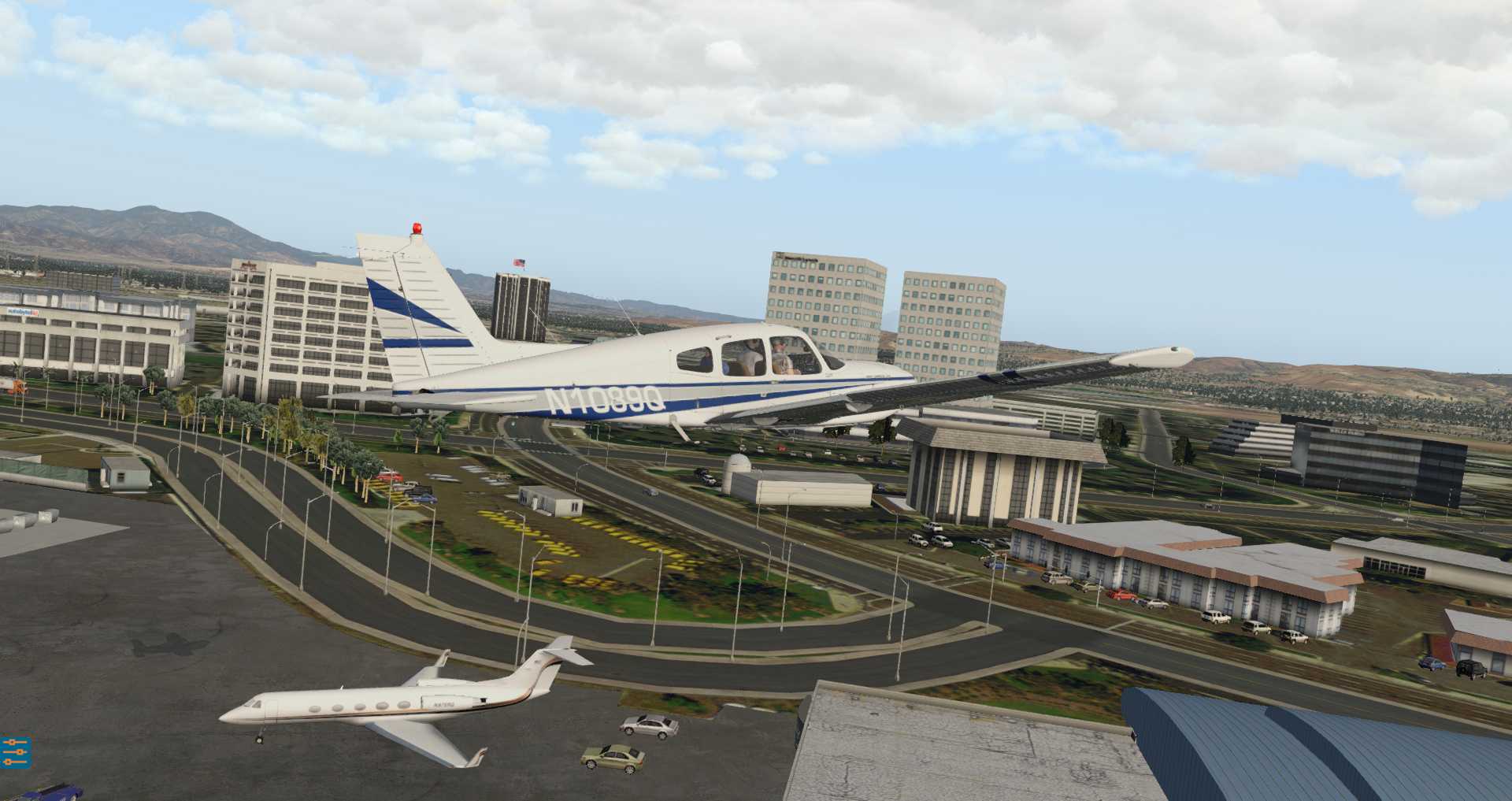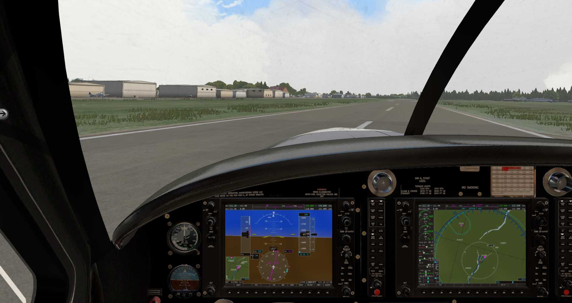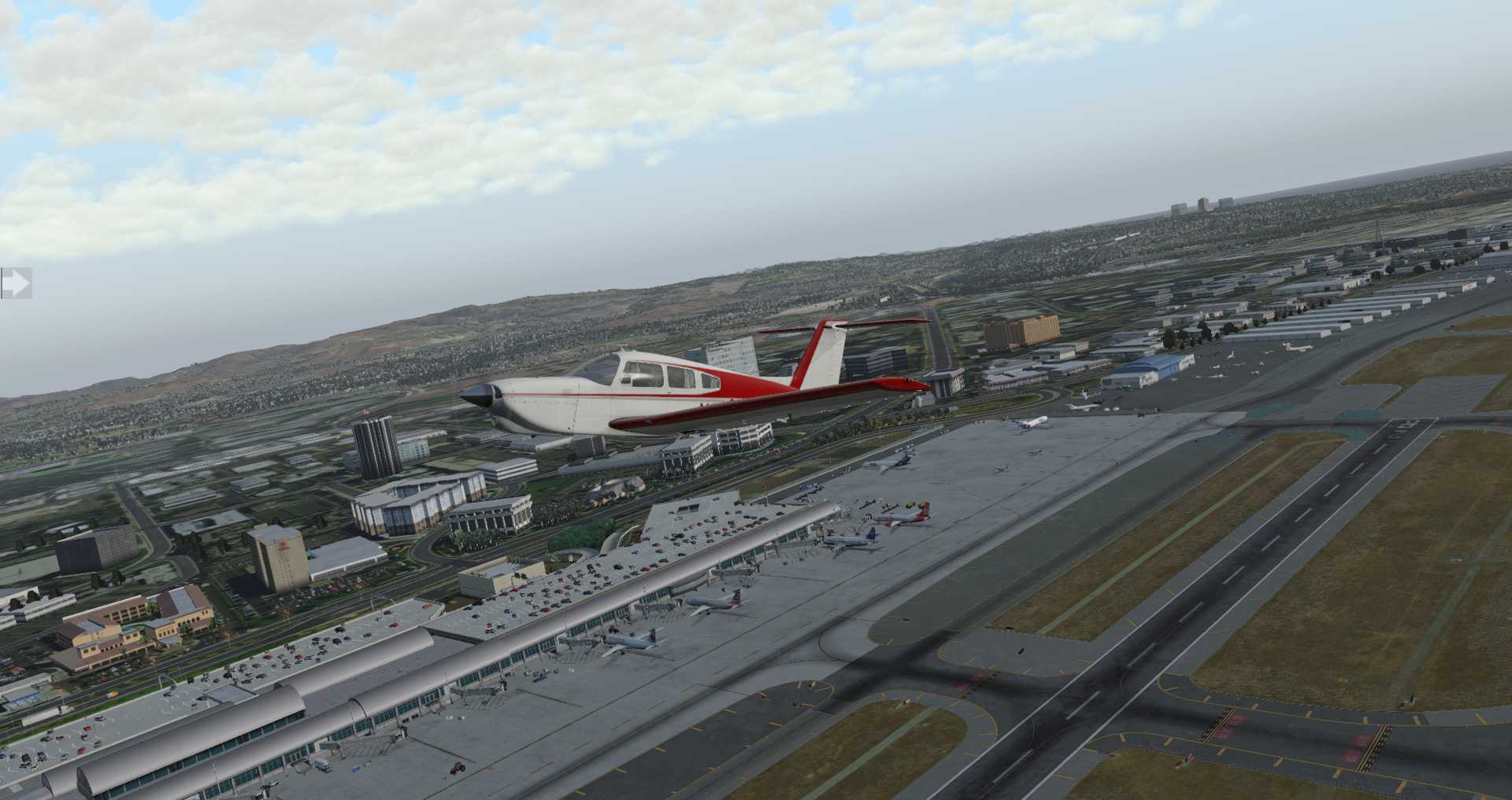 Schon im Auslieferungszustand von X-Plane 11 kann sich der Flughafen durchaus sehen lassen, wie wir hier bei einem Flug mit einer JustFlight Piper Arrow III sehen: