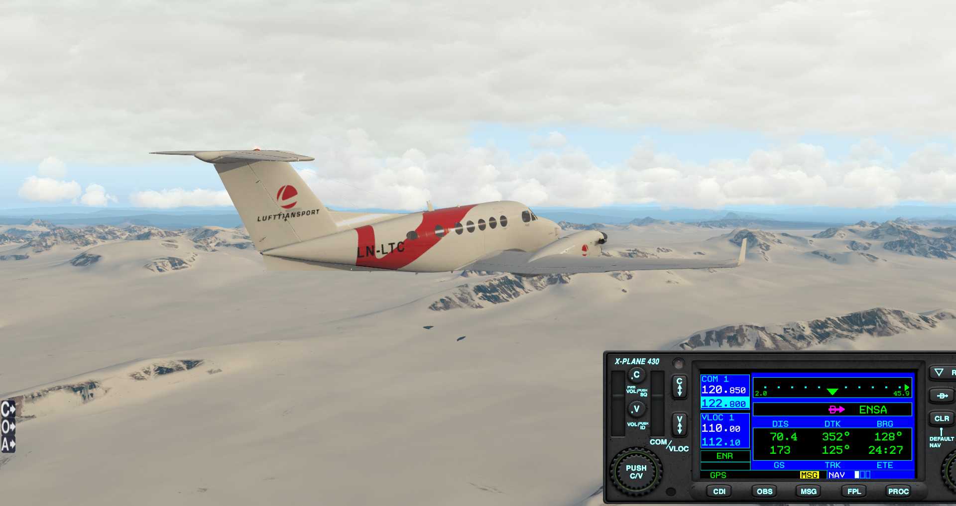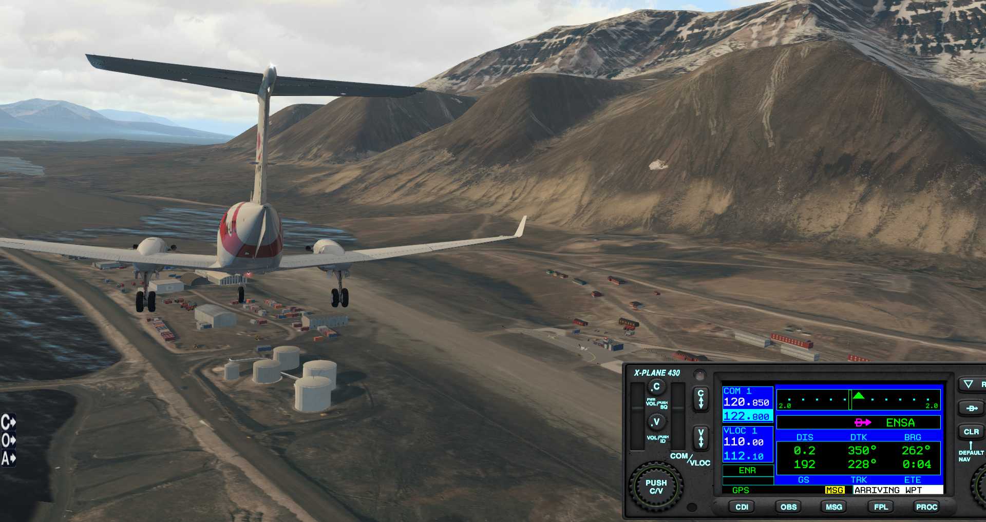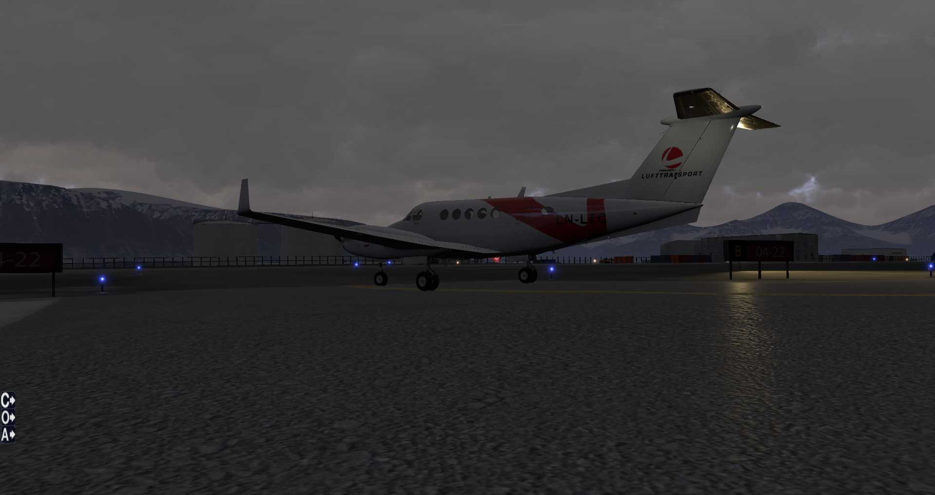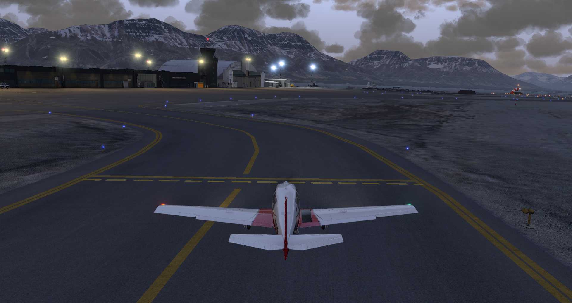 Als erstes starten wir mit einer Carenado B-200 mit der mitgelieferten Livery von Ny-Alesund (ENAS) nach Svea (ENSA).