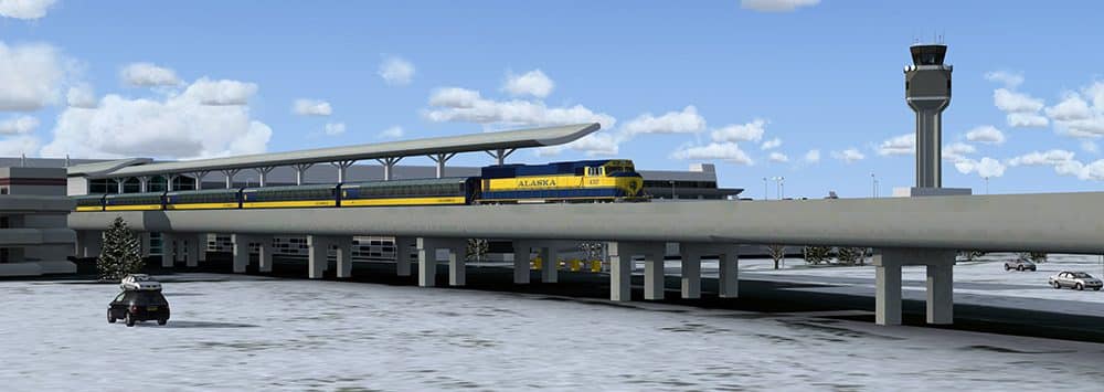 - Szenerie vom Anchorage Ted Stevens Airport mit allen Gebäuden und Einrichtungen (internationales Terminal, nationales Terminal, Cargo-Bereiche, Wartungs-Bereiche, Kulis Air National Guard Base, South Airpark etc.)