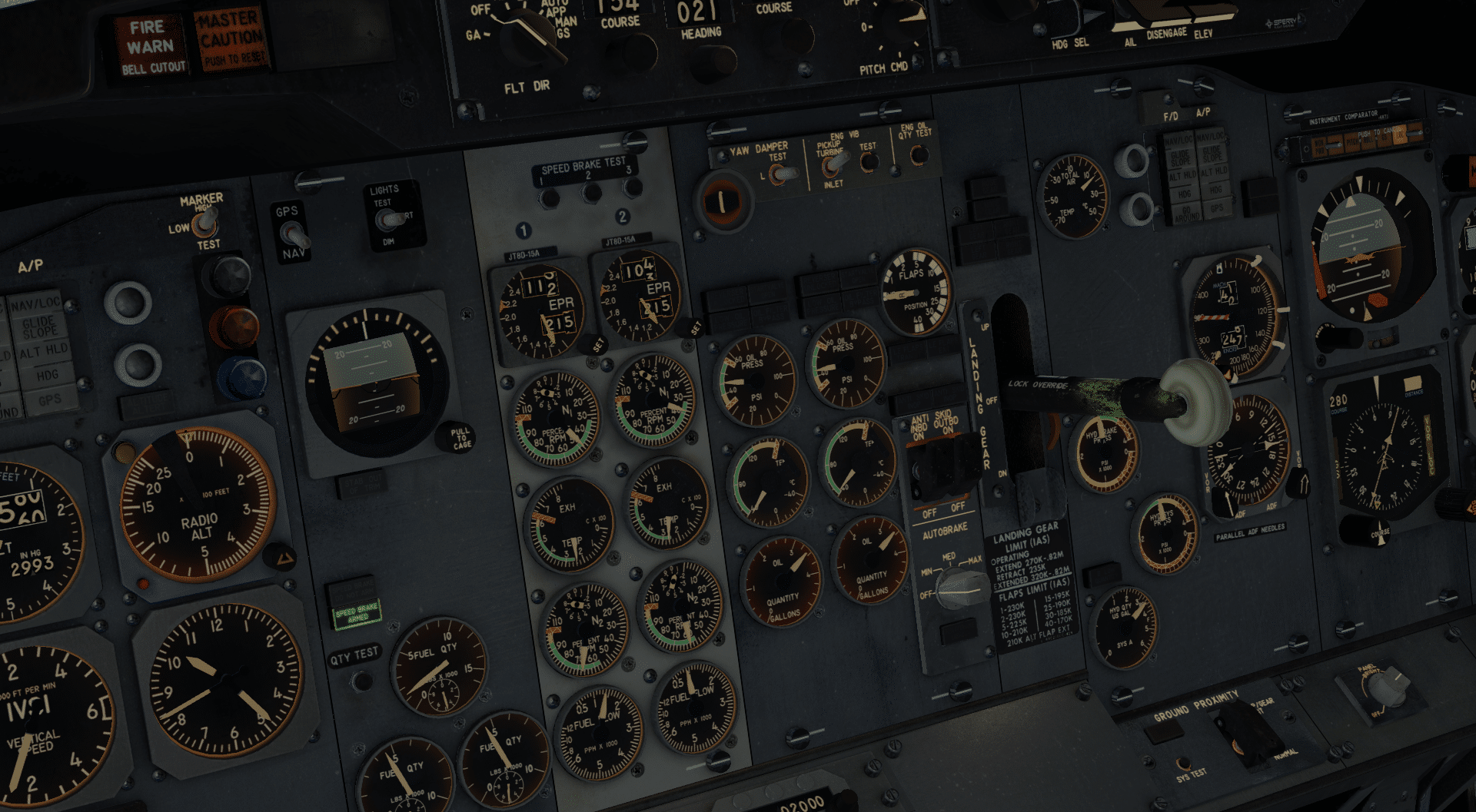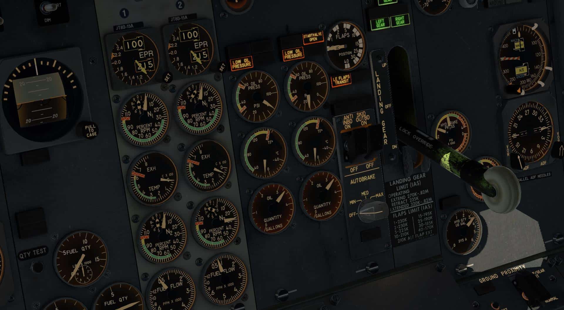 Was die Alternate Gear Extension angeht, so bin ich ein wenig ratlos gewesen, muss ich gestehen. Diese sollte, wie in allen 737 (und auch der 727), im Flight Deck hinter dem Pedestal per Bodenluke erreichbar sein, aber in dieser Umsetzung kann ich nichts erkennen. Die Beschreibung der Systeme durch FJS liefert auch keinen Anhaltspunkt, dass diese absichtlich nicht simuliert wurde. Insofern finde ich es ein wenig schade, dass diese augenscheinlich nicht berücksichtigt wurde.
