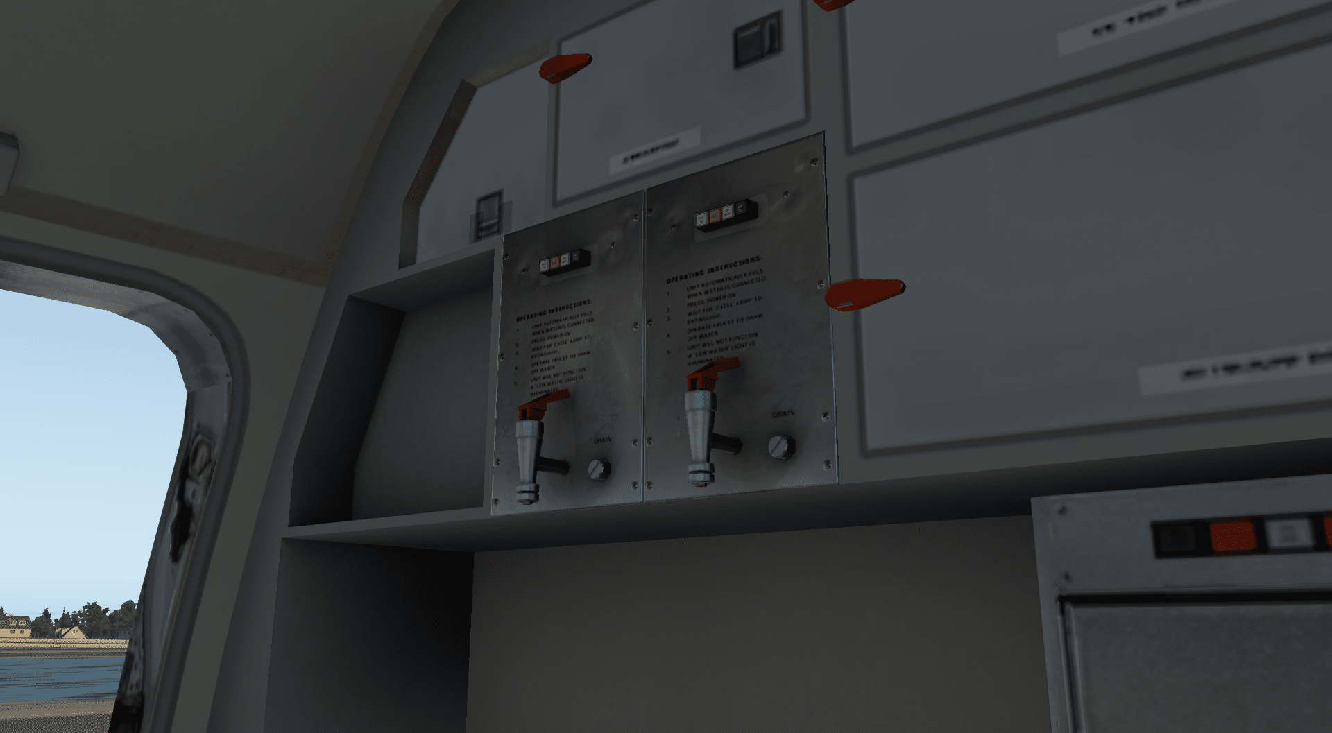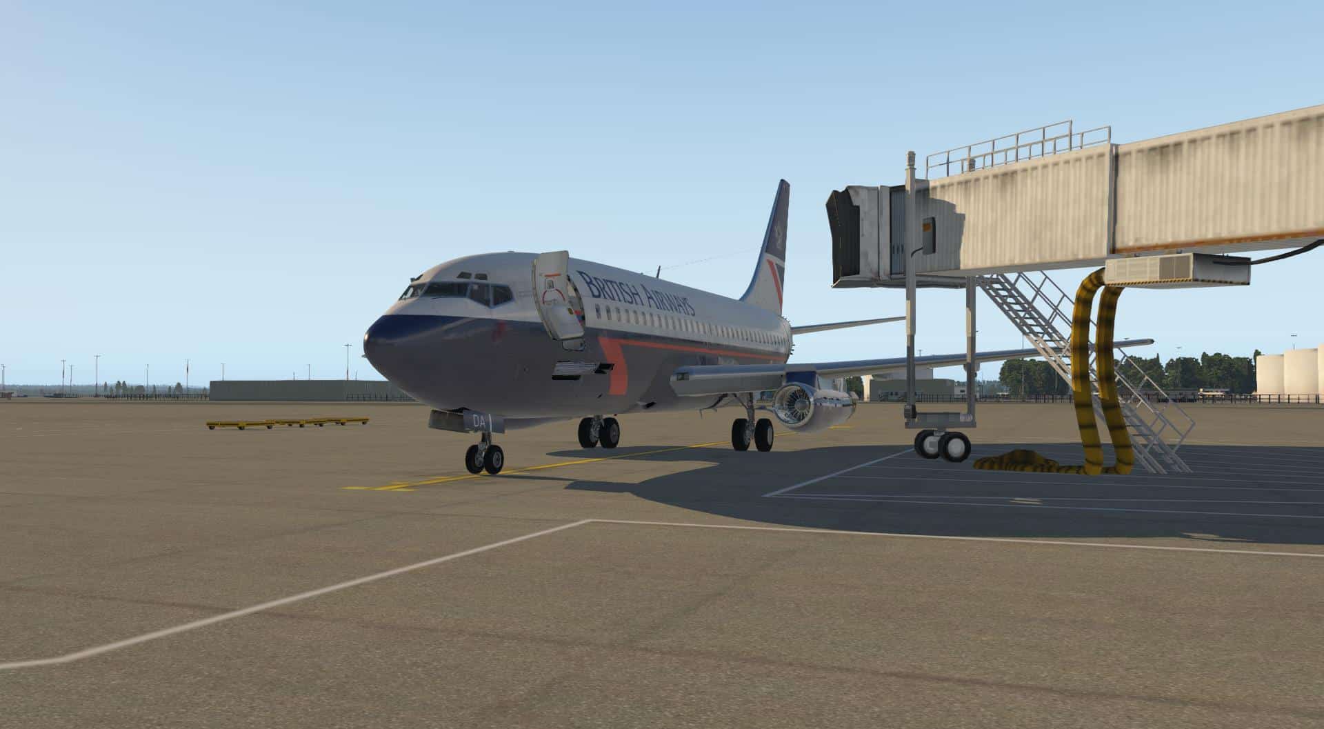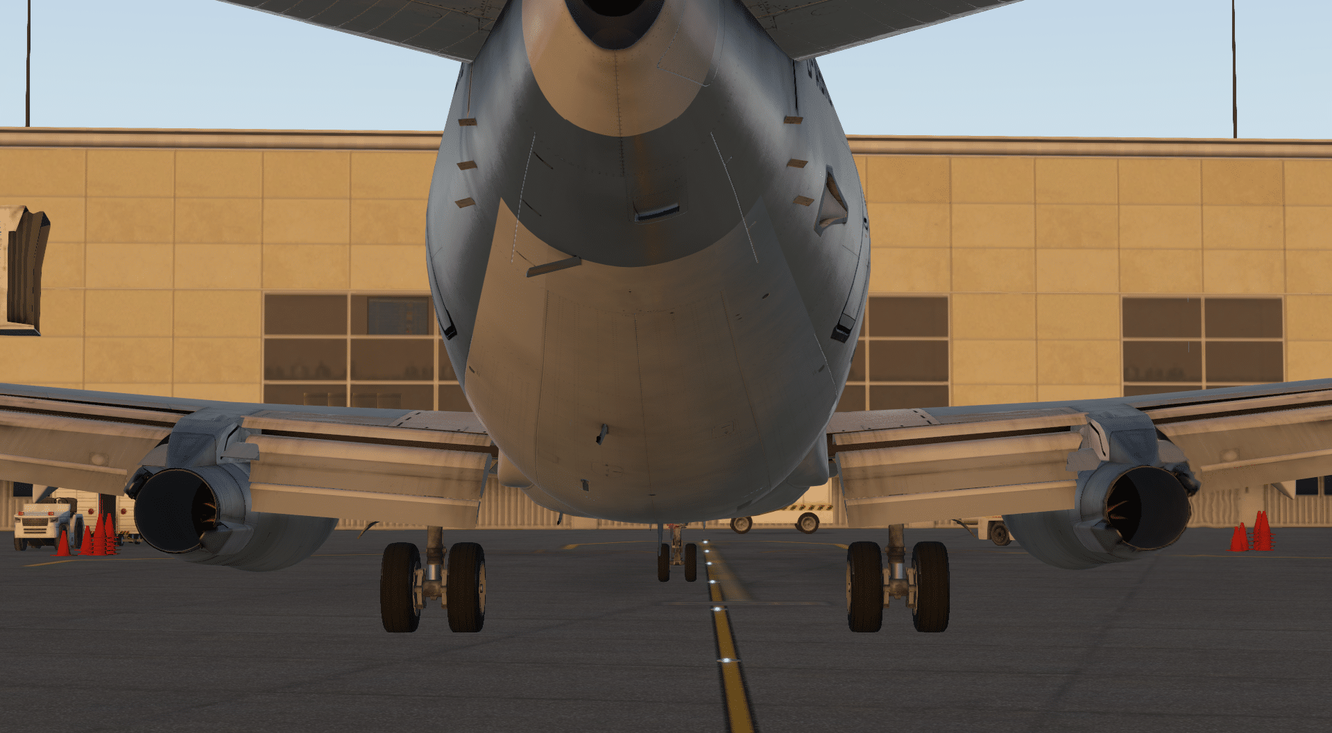Die Texturen sind sehr scharf, das Modell sehr eindrucksvoll modelliert. Eine entsprechende Lichtstimmung, wie etwa in der Abenddämmerung, hilft da natürlich sehr gut weiter, wenn man gerade jemanden beeindrucken möchte. Über die Menüs an der linken Seite des Bildschirms öffnen wir einmal alle Türen und Luken und aktivieren die GPU und den Air Cart. Beide sind nicht sichtbar, sondern versorgen das Flugzeug aus dem Nichts mit Strom und Luft.