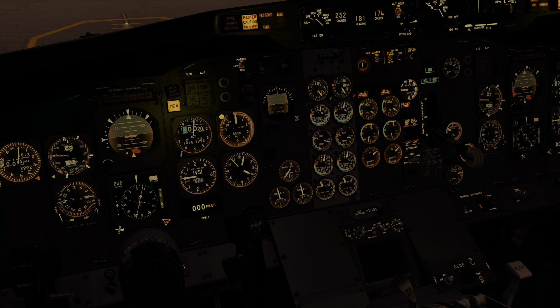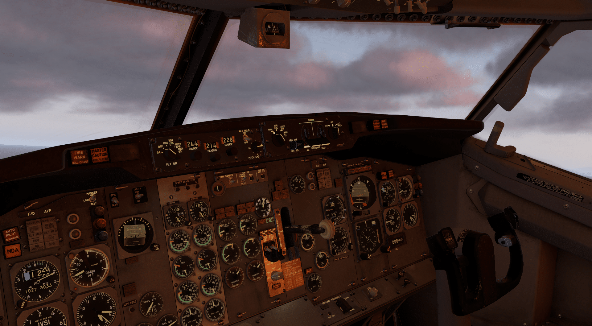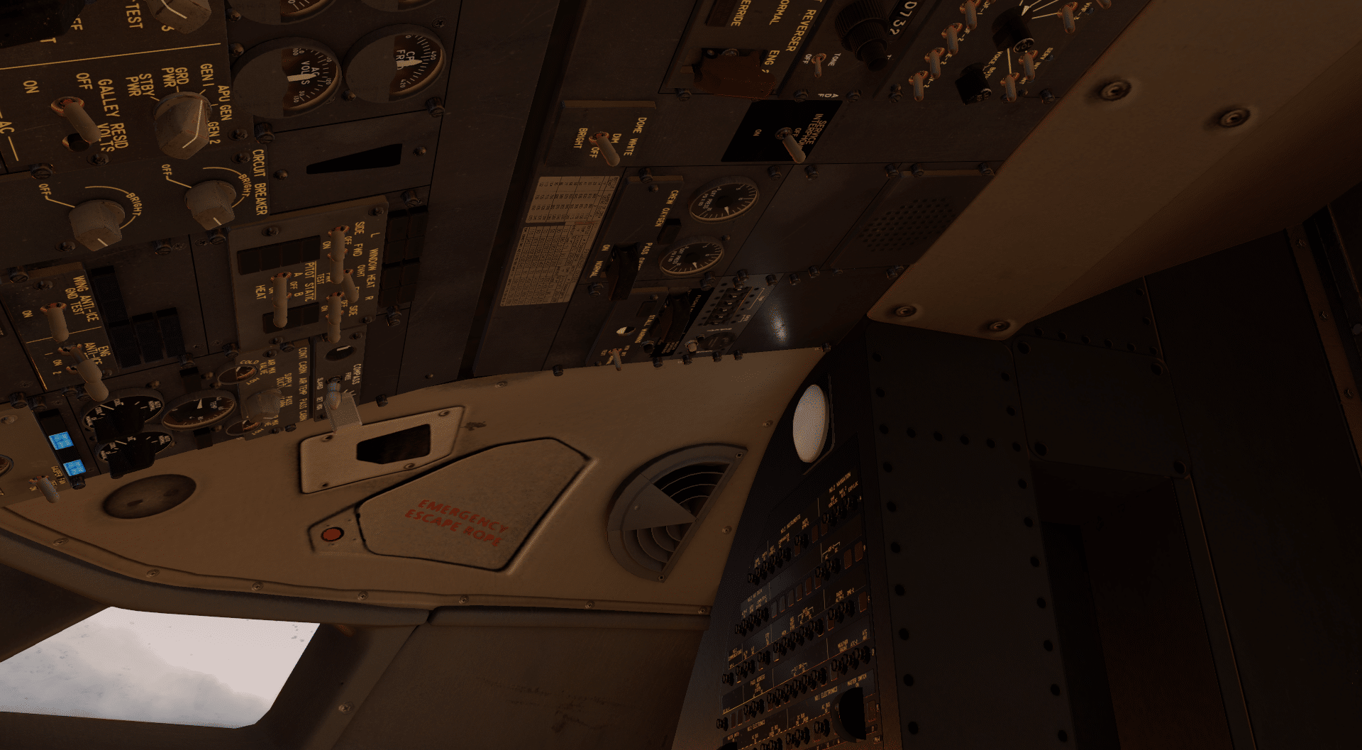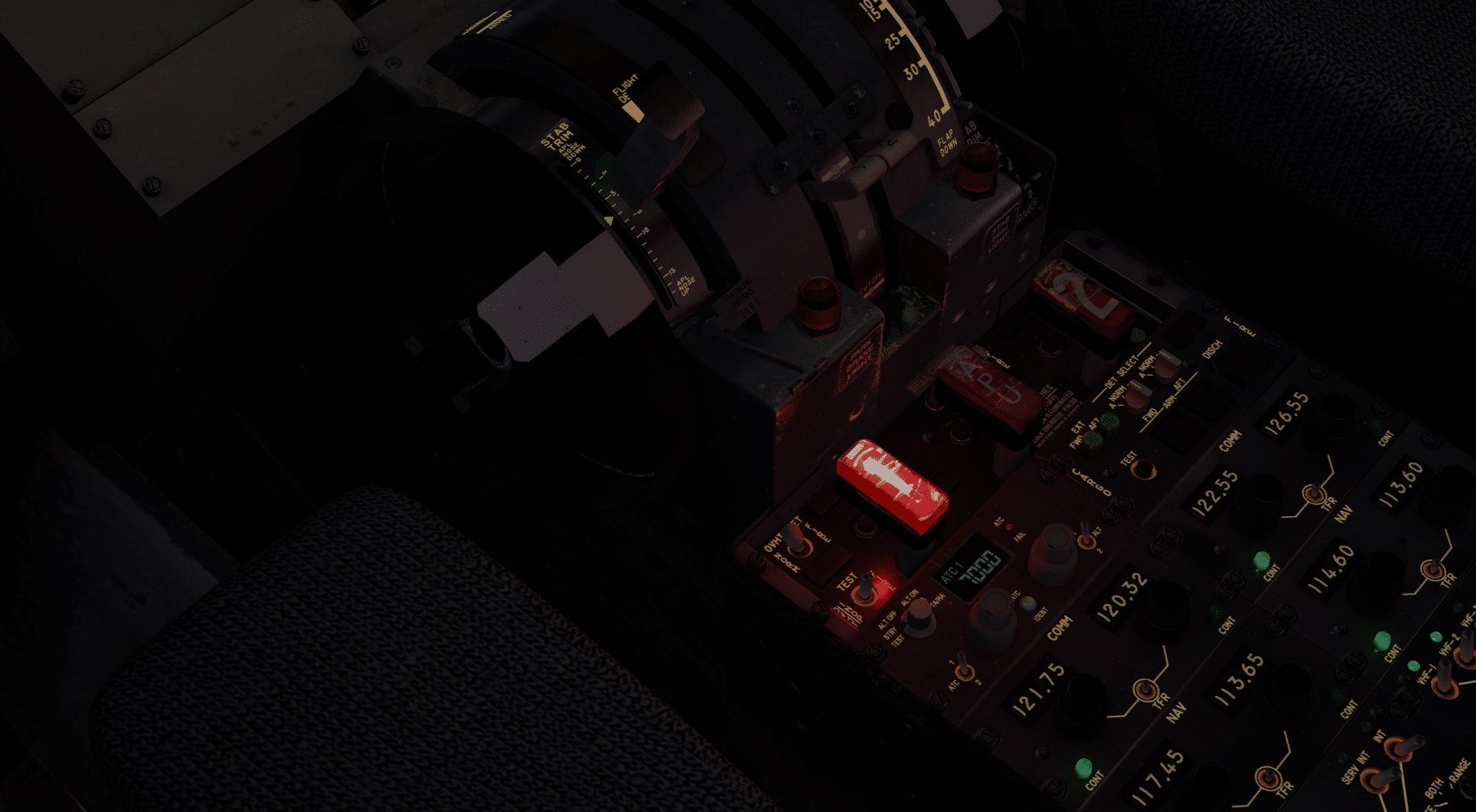 Nun mag manch einer sagen, dass das eben beschriebene ja nun auch das Mindeste sei. Und während das technisch stimmt, kann man hier auch einiges falsch machen. Aber nun, es ist auch nicht so, als wäre das Ende der Fahnenstange erreicht. Über dem Arbeitsplatz des Kapitäns und Ersten Offiziers befinden sich jeweils eine Kartenbeleuchtung, die man mit der Maus ausrichten und in der Intensität einstellen kann. Dazu sorgen einige Leuchten – insbesondere das Parking Brake Light und die Leuchte für das Erreichen der MDA – für einen hervorragend aussehenden Schein auf die umgebenden Oberflächen. Ein gelber Schein auf das Instrumentenpanel, ein roter am Pedestal. Eigentlich vielleicht eine Kleinigkeit, verleiht es dem Ganzen doch eine gewisse Plastizität, das Gefühl, dass dieses Cockpit hier mehr ist als als eine Aneinanderreihung von voneinander unabhängigen Schaltern und Instrumenten.