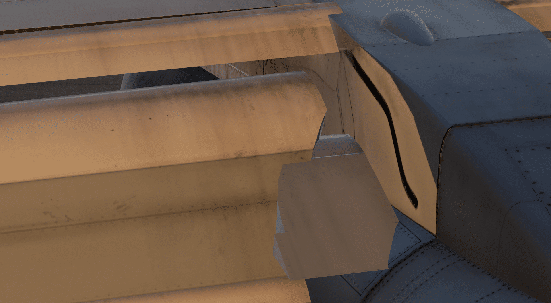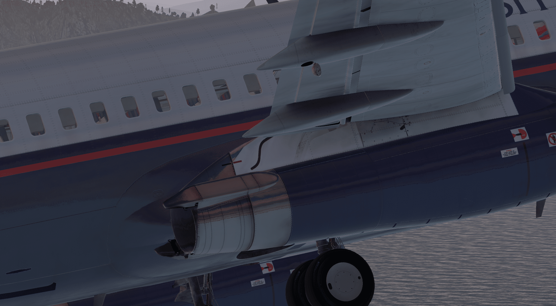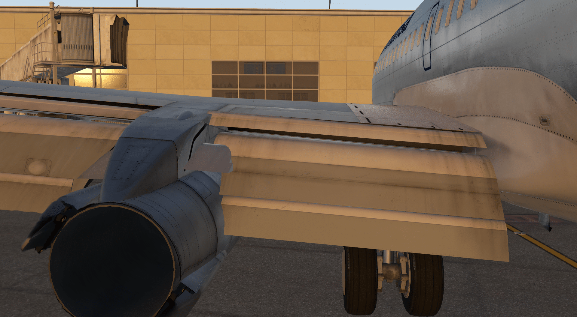 Was allerdings ein wenig eher auffällt und unschöner wirkt, sind die Landeklappen, die ich bisher nicht erwähnt habe. Auch dies ist mir eher durch Zufall und dann nach genauem Hinsehen aufgefallen. Grundsätzlich habe ich an ihnen wenig auszusetzen, auf den ersten Blick wirkt die Animation auch sehr schön und ich möchte darauf hinweisen, dass man in den üblichen Perspektiven und vor allem Brennweiten davon vermutlich nichts von dem, was jetzt folgt, wahrnimmt. Zum einen hängen die Abgasleitbleche an der Außenseite der inneren Landeklappen zu tief und letztere sind ein wenig zu breit. Das führt zu zwei Dingen. Erstens hängen Landeklappe und Abgasleitblech bei großen Flapssettings im Triebwerk. Zweitens hängt das Abgasleitblech in der Landeklappe, da zum einen die Form des Leitblechs und augenscheinlich die Breite der Landeklappe nicht ganz korrekt ist. Darüber hinaus hängen die Leitbleche auf beiden Seiten auf unterschiedlichen Höhen, während die Klappen dieselbe Einstellung haben. Auf der linken Seite ist das Abgasleitblech passend zur Führungsschiene der Landeklappen und reicht damit hier auch nicht ins Triebwerk rein, während auf der rechten Seite das Abgasleitblech deutlich tiefer ausgerichtet ist – und damit auch unter der Führungsschiene. Ein recht unelegantes, aber nicht zwangsläufig auffälliges Problem, das allerdings Nachbesserung verdienen würde.