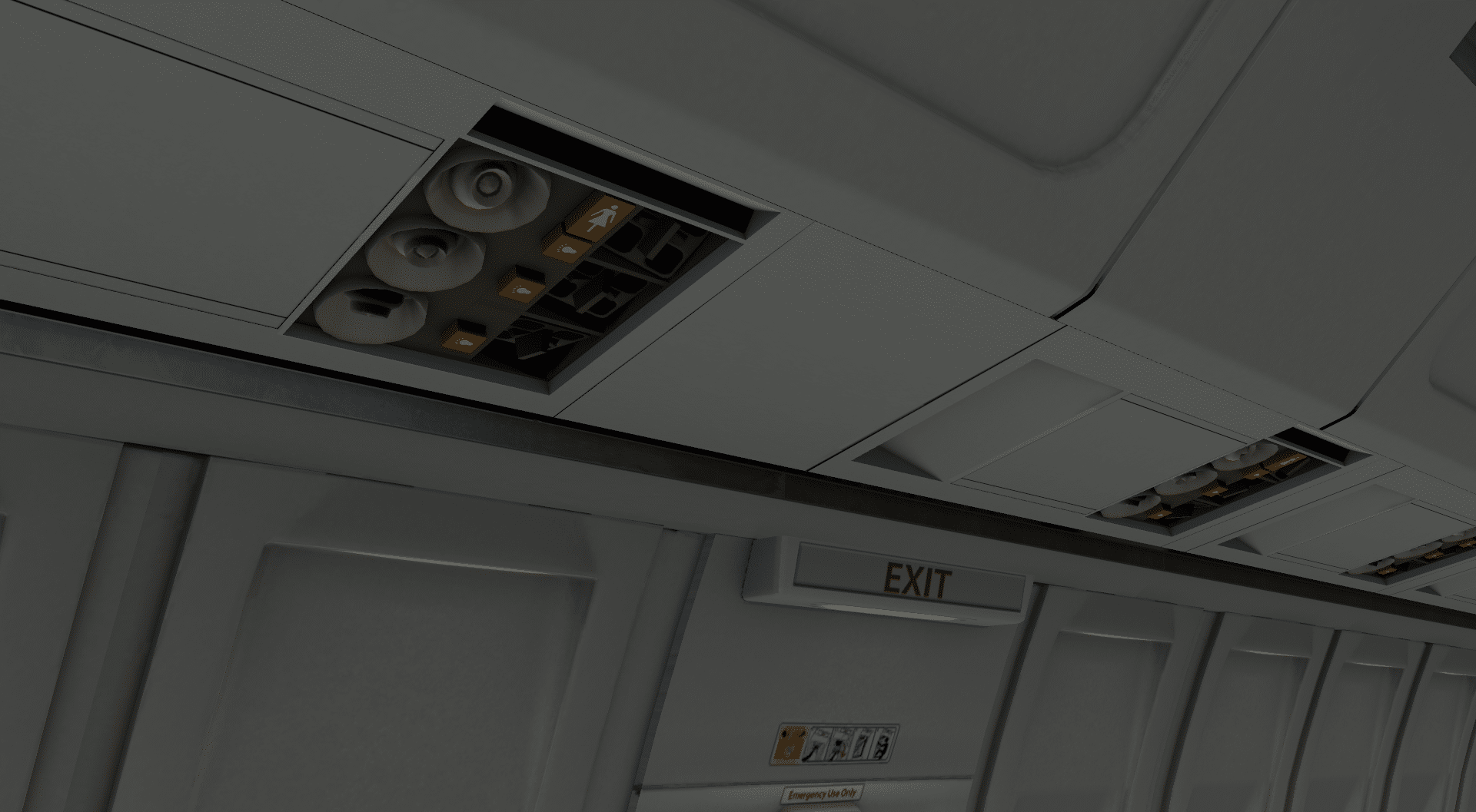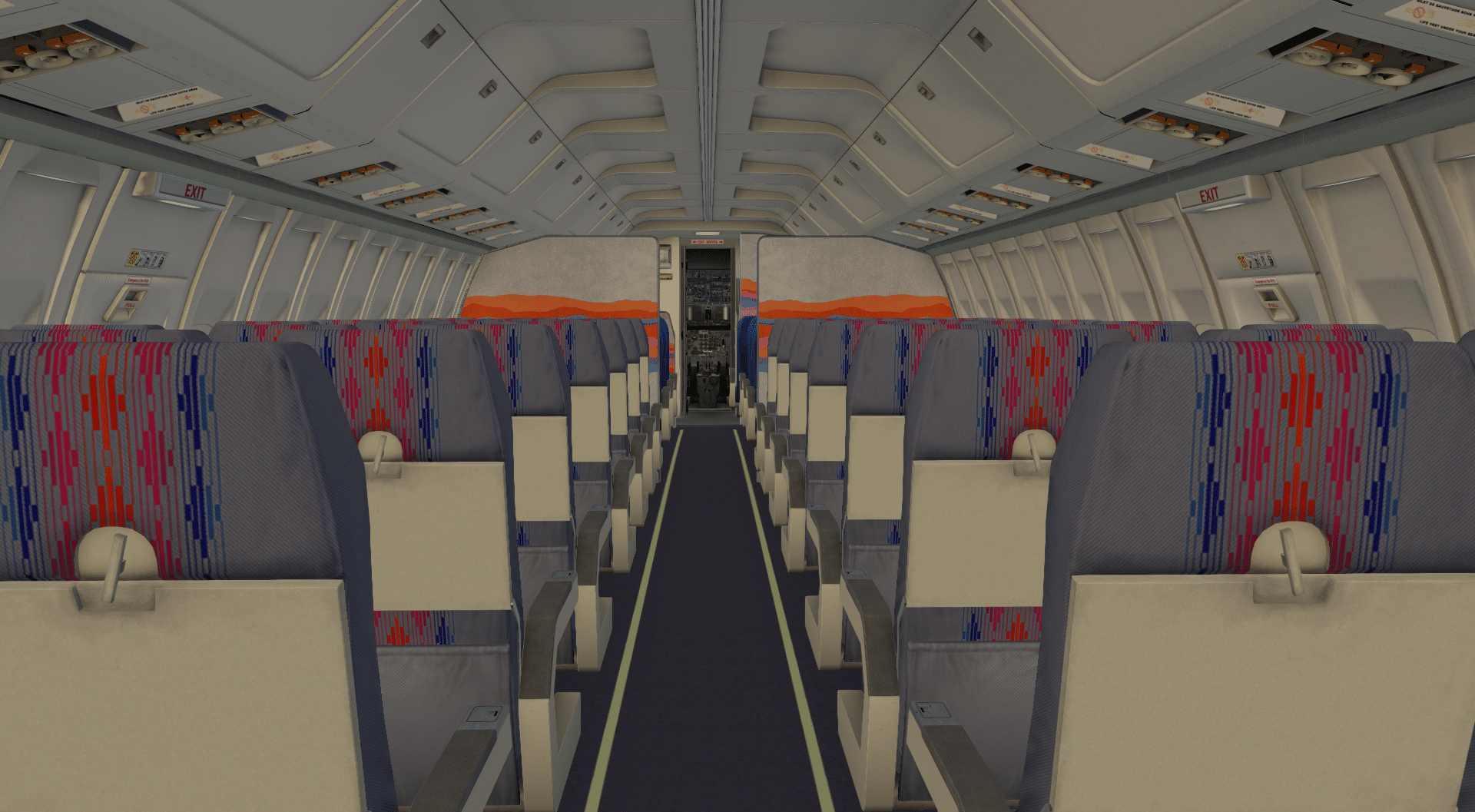 In der Kabine setzt sich der positive Eindruck fort. Über die Inneneinrichtung kann man natürlich streiten, die passt vielleicht am ehesten zu Aloha Airlines, aber man hat sich in jedem Fall Mühe gegeben. Die Bedienpanel über den Passagiersitzen sind ebenso ausmodelliert wie die Fensterblenden. Und wo wir schon bei denen sind… in meinen Augen eine reine Spielerei, aber doch nicht weniger beeindruckend: man kann jede einzelne Fensterblende mit der Maus stufenlos verstellen. So etwas kann einen nicht unbeträchtlichen Teil der realistischen Atmosphäre aus, wenn man von außen verschiedenste Stellungen der Blenden sieht.
