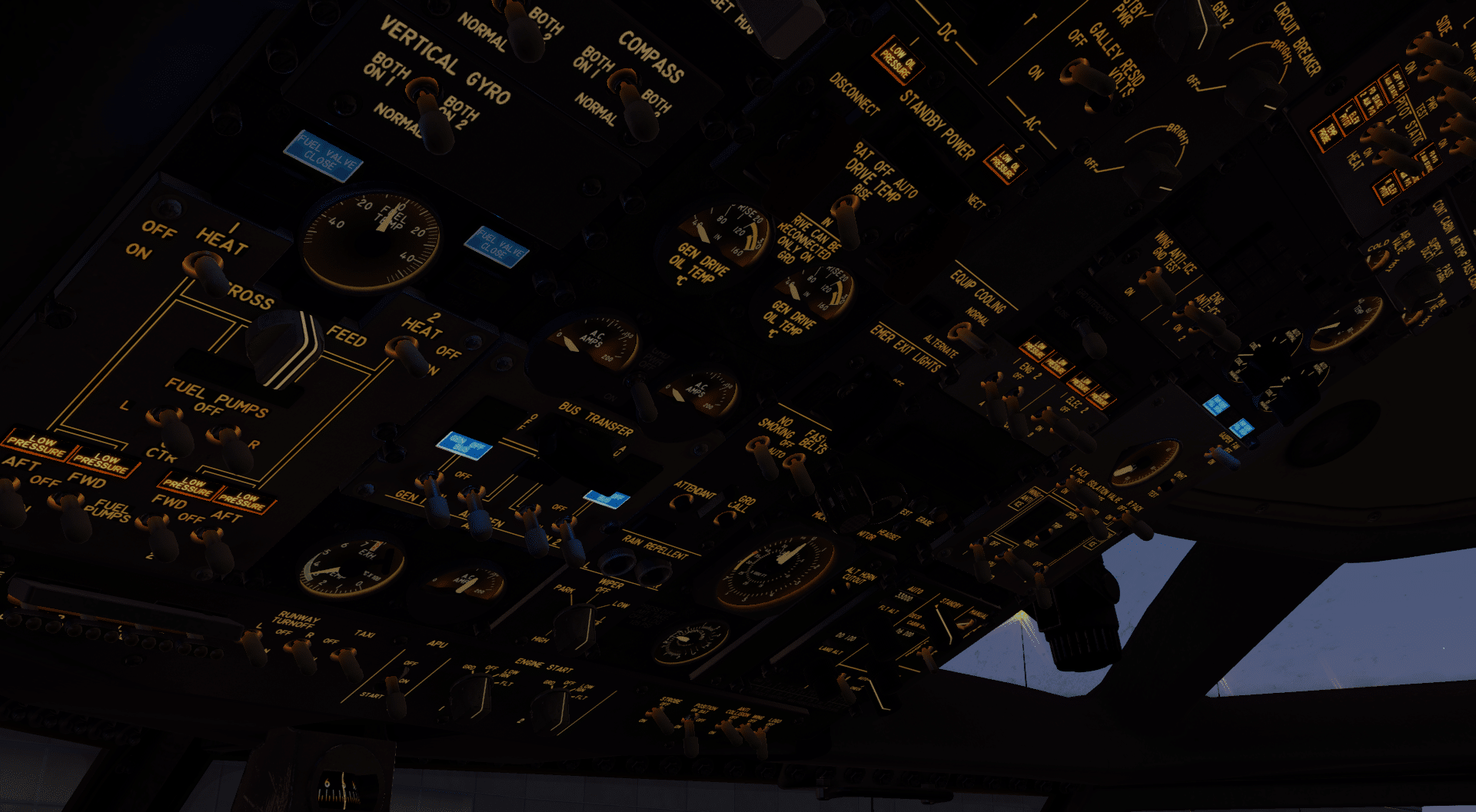 Wer sich in die Nacht katapultiert, kommt in einer anderen Welt an. Man hat draußen von der Szenerie nicht mehr viel zu sehen, aber noch ein wenig mehr am Flugzeug. Außen wird das Flugzeug durch die übliche Beleuchtung illuminiert, das Logolicht und die Landelichter strahlen den Rumpf und das Leitwerk wunderbar an. Die ausfahrbaren und recht filigran wirkenden Landelichter, die unter dem Flügel ausklappen sind ebenfalls umgesetzt und unterstützen die Landescheinwerfer in den Tragflächenwurzeln sehr gut. Im Cockpit ist die Lichtstimmung im Dunkeln noch beeindruckender. Die Instrumente werden alle akkurat beleuchtet und sind perfekt ablesbar, während die Instrumententafel durch das Flood Light angenehm angestrahlt wird. Bedienelemente auf Pedestal und Overheadpanel sind durch die dortigen Panel Lights ebenso gut ablesbar und zu erkennen. Und wem das nicht reicht, der kann das Dome Light in zwei Intensitäten dazu schalten, das das Flight Deck komplett illuminiert.