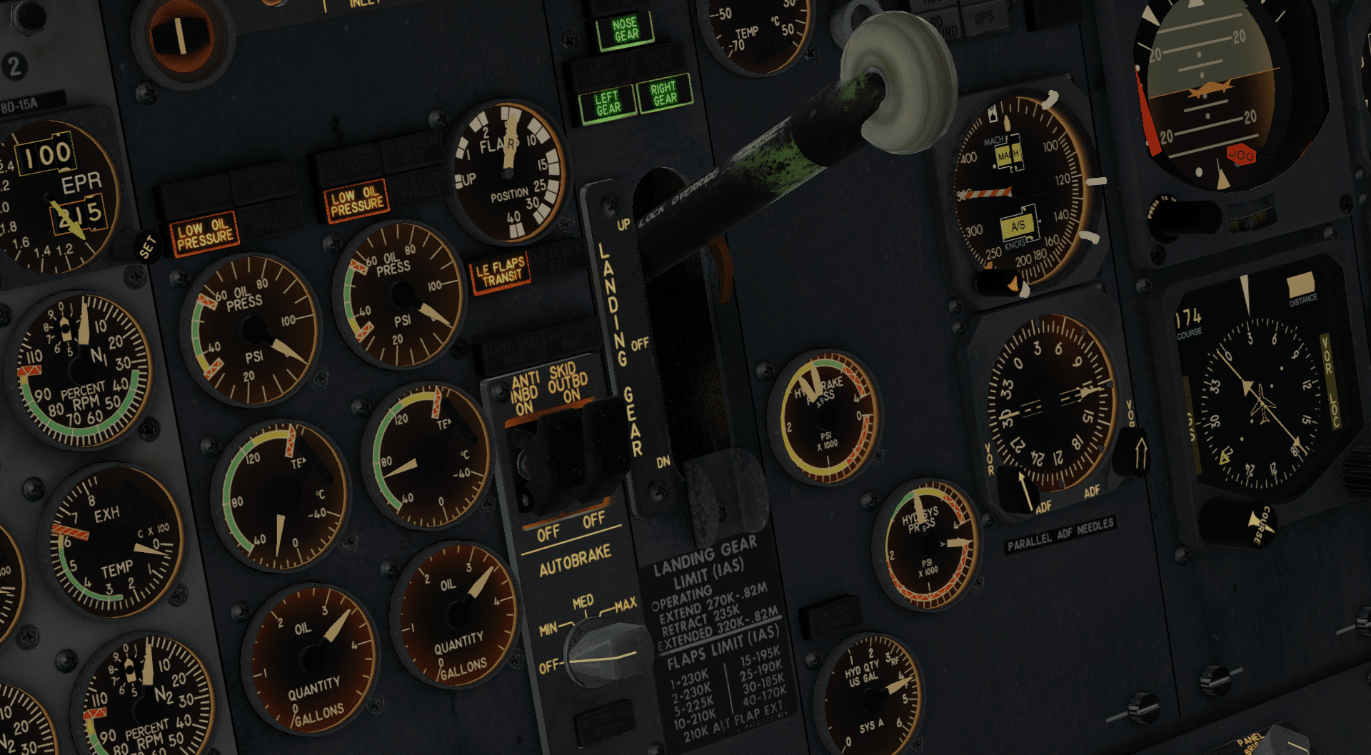 Achtung Klugscheißer: Der Gearlever hat keinen lock ausser die mechanische Kerbe. Und aus diesem Grund auch ist der Gearlevercheck so ziemlich am Anfang der Cockpit Prep Checklist noch bevor man der Mechaniker die Batterie einschaltet um den Flieger für die Cockpitcrew fit zu machen morgens (sonst wird’s unangenehm laut).