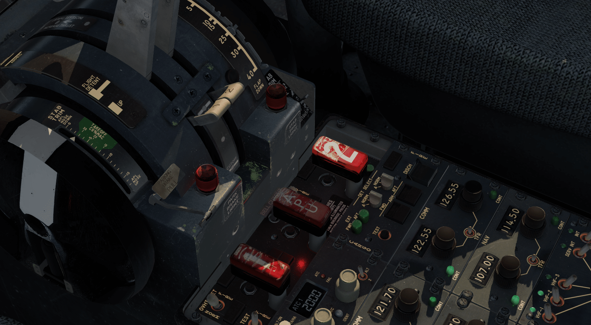 Schauen wir ins Cockpit und erblicken den im ersten Eindruck bereits erwähnten Uhrenladen. Und er sieht ganz wunderbar aus. FlyJSim hat sich ordentlich ins Zeug gelegt und alle Instrumente und Schalter modelliert. Selbst die Sicherungen hinter den Sitzen sind ausmodelliert, wenngleich auch nicht simuliert. Grandios sind auch die Texturen, die dem Cockpit den Touch geben, der diesem Flugzeug angemessen ist. 40 bis 50 Jahre haben diese Flugzeuge im Realen hinter sich und dementsprechend benutzt sehen die Oberflächen auch aus. Nicht heruntergekommen, aber ganz sicher auch nicht wie nach der Auslieferung.