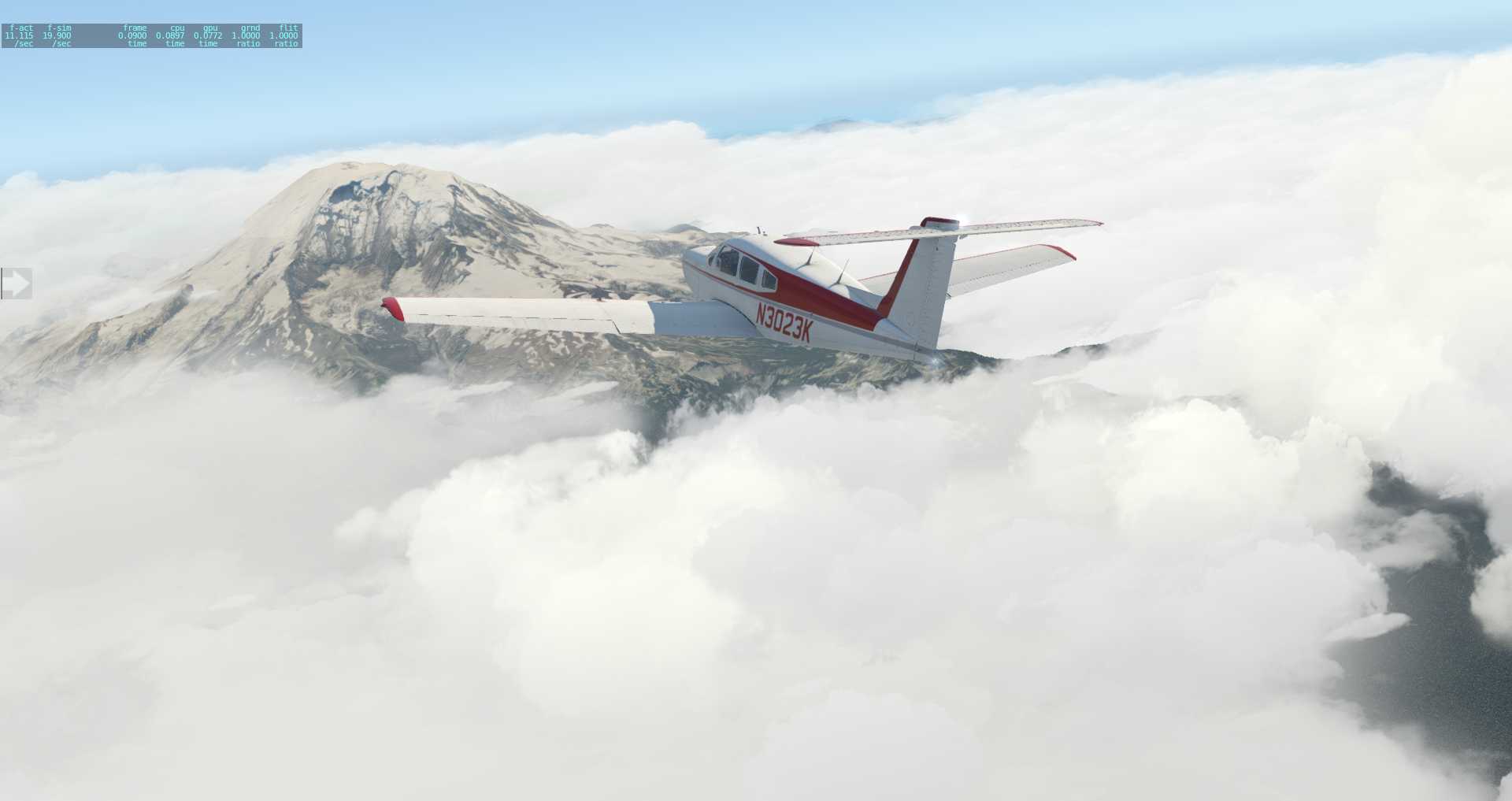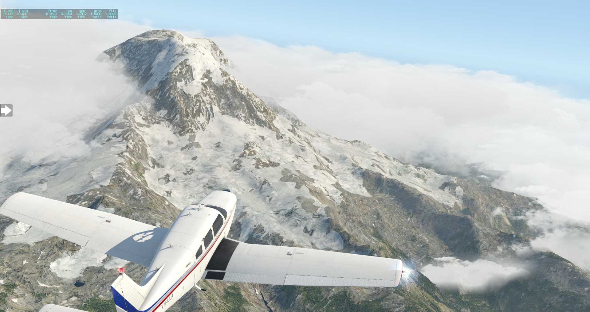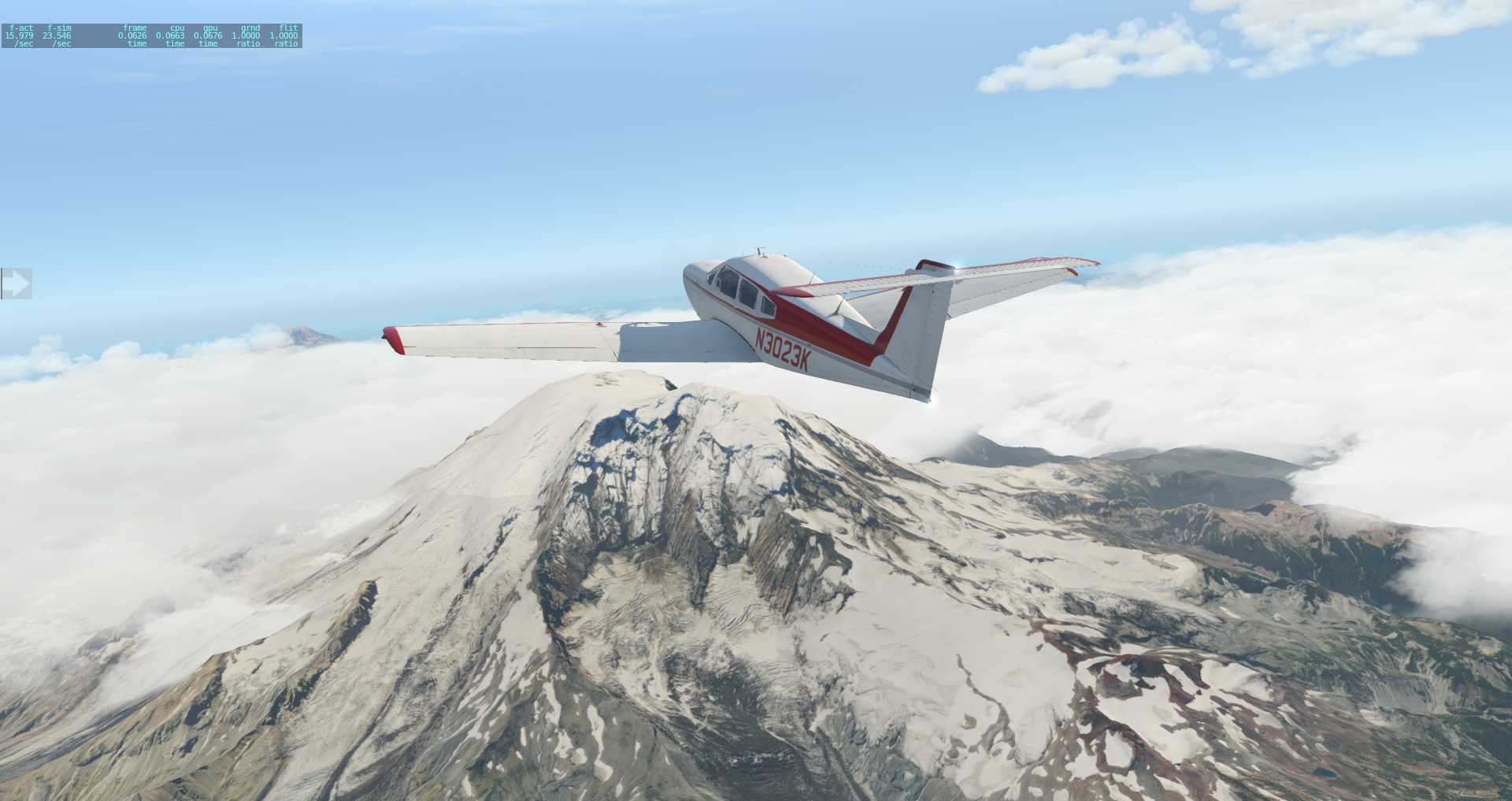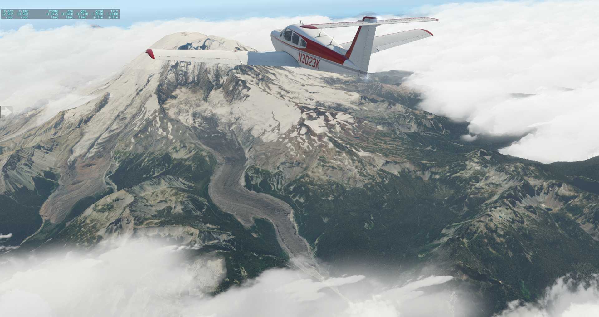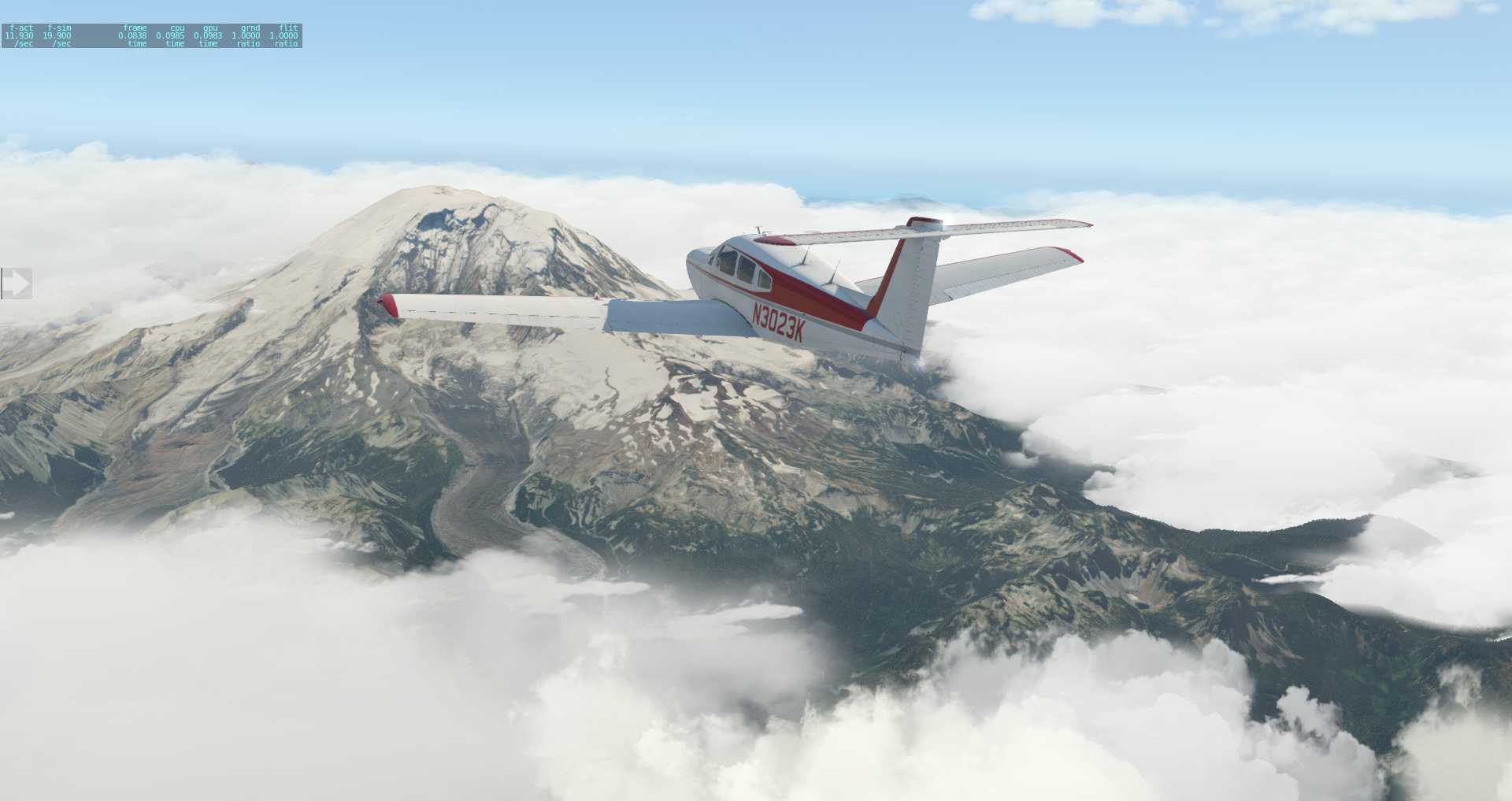 Wir starten jeweils vom Default-Flughafen Seattle International (KSEA) mit einer JustFlight Turbo Arrow und fliegen zum Mount Rainier. Dabei picken wir uns 3 spezielle Stellen heraus, wo wir die Szenerien miteinander vergleichen.