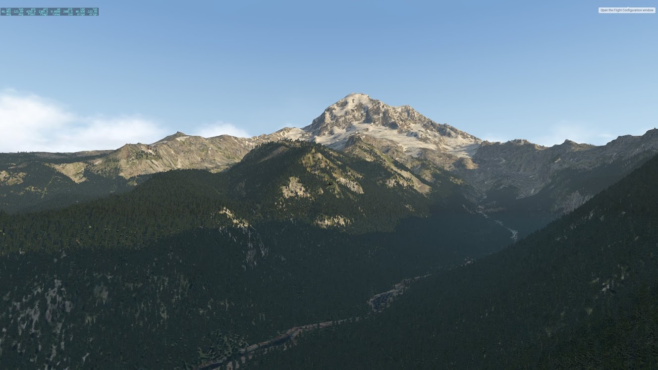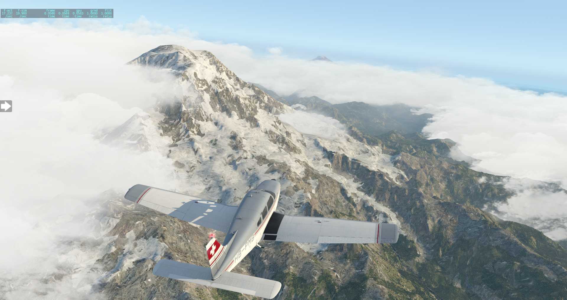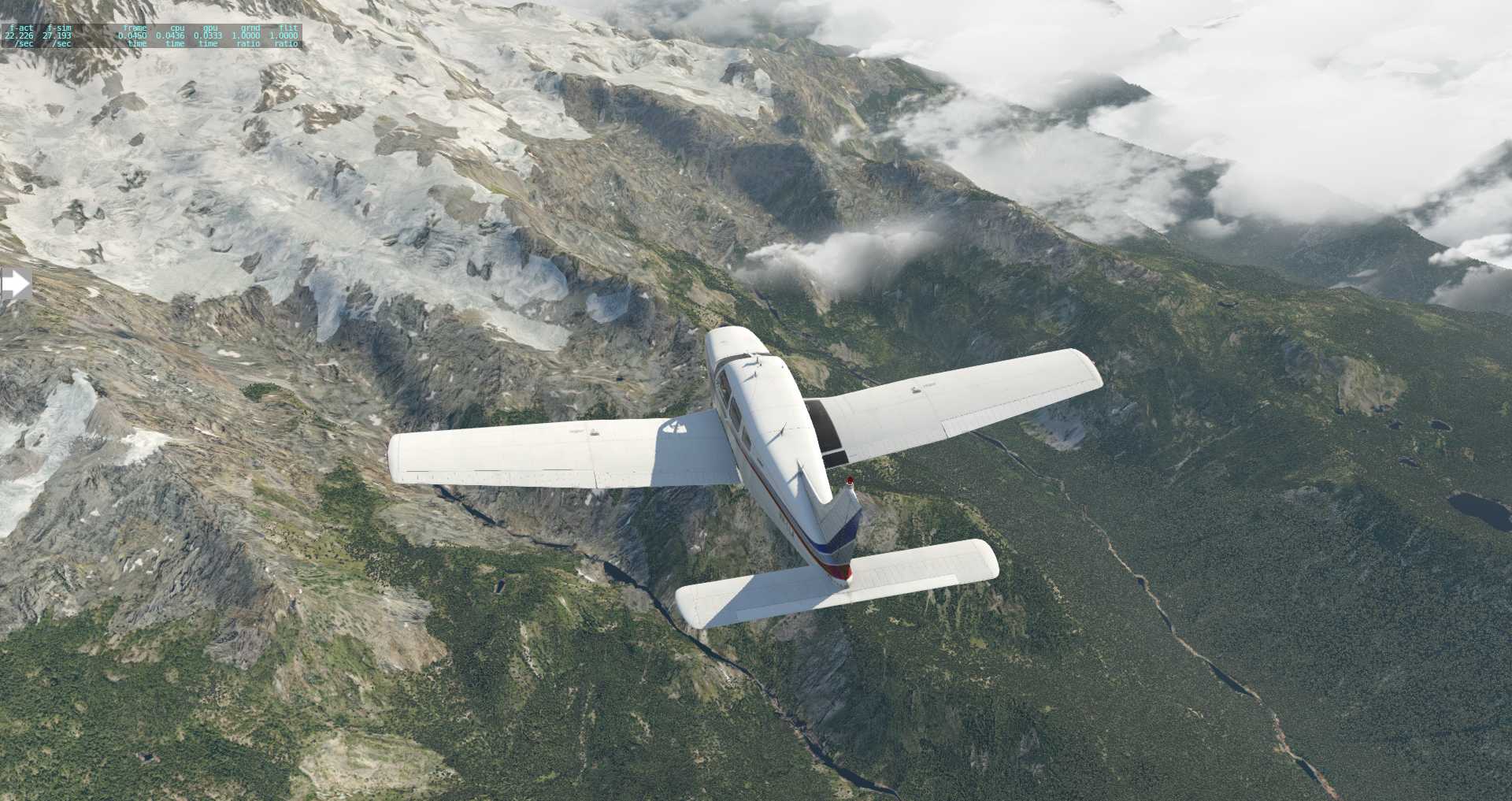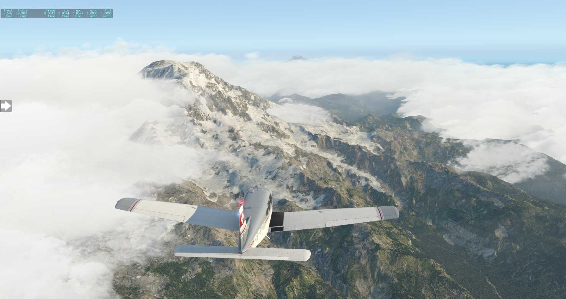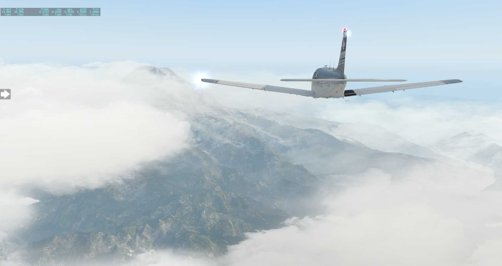Wir starten jeweils vom Default-Flughafen Seattle International (KSEA) mit einer JustFlight Turbo Arrow und fliegen zum Mount Rainier. Dabei picken wir uns 3 spezielle Stellen heraus, wo wir die Szenerien miteinander vergleichen.