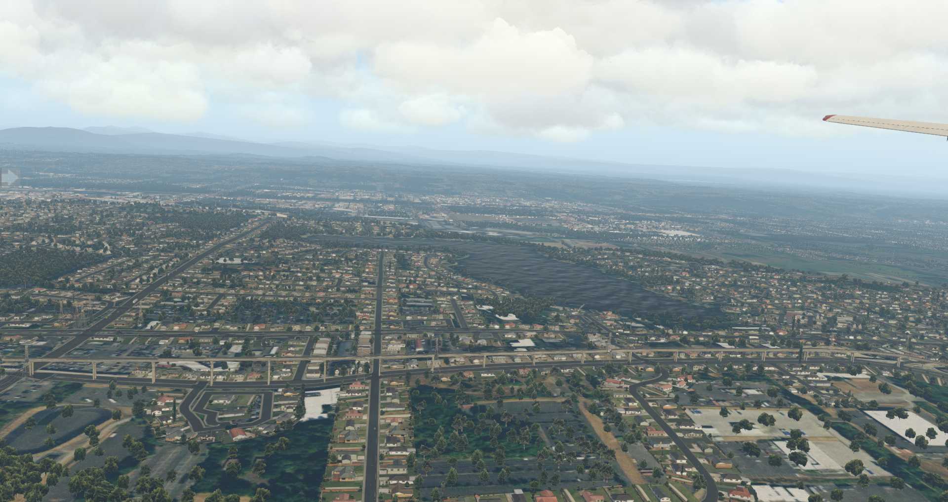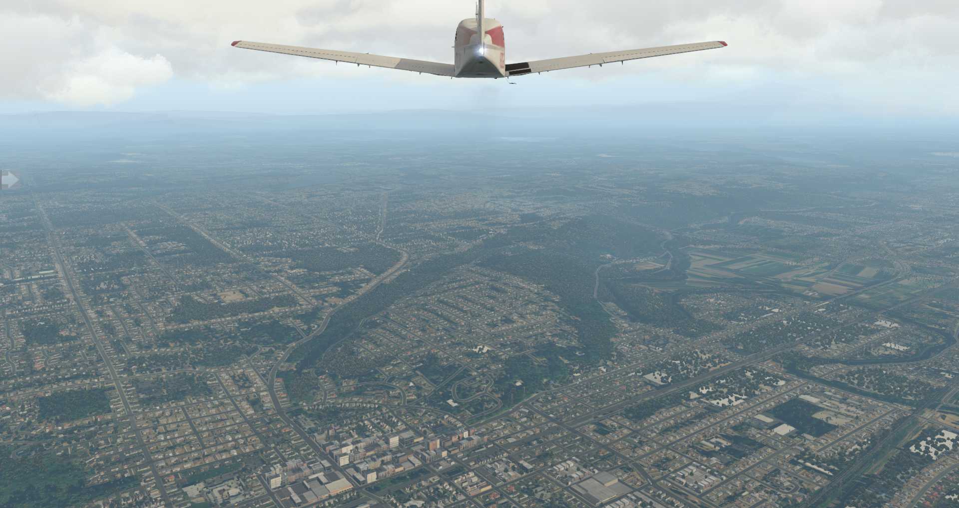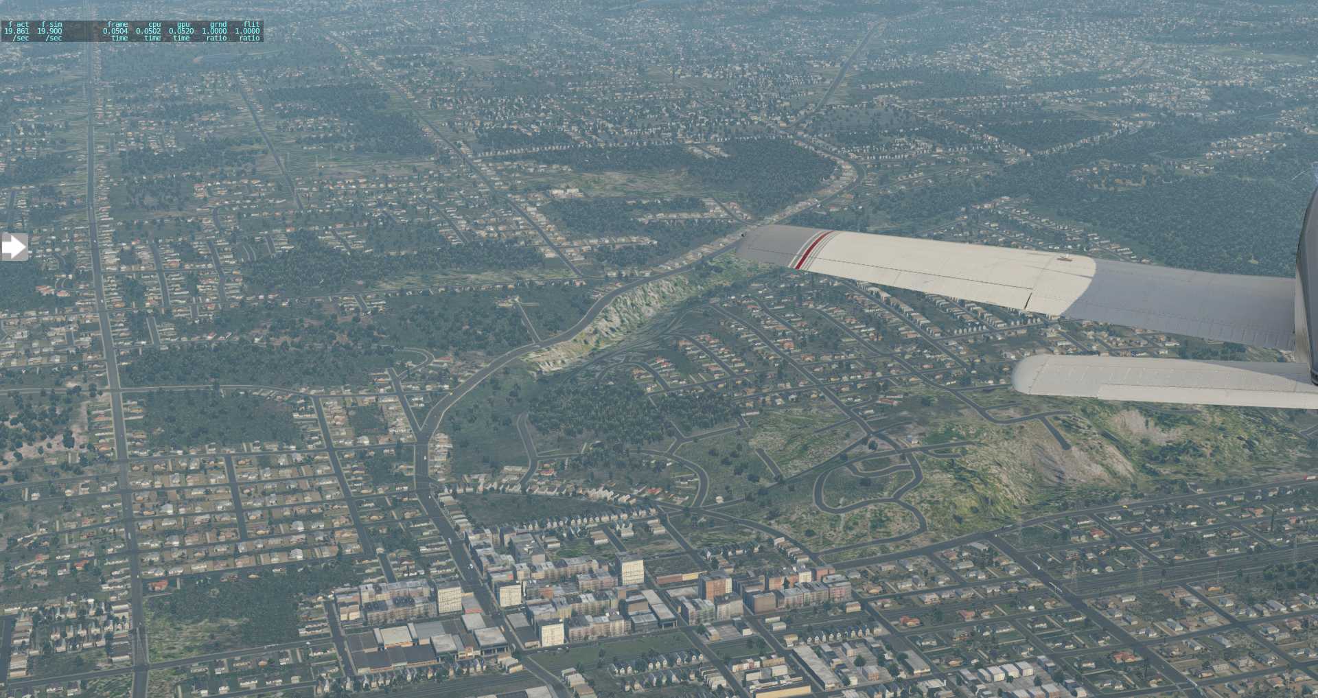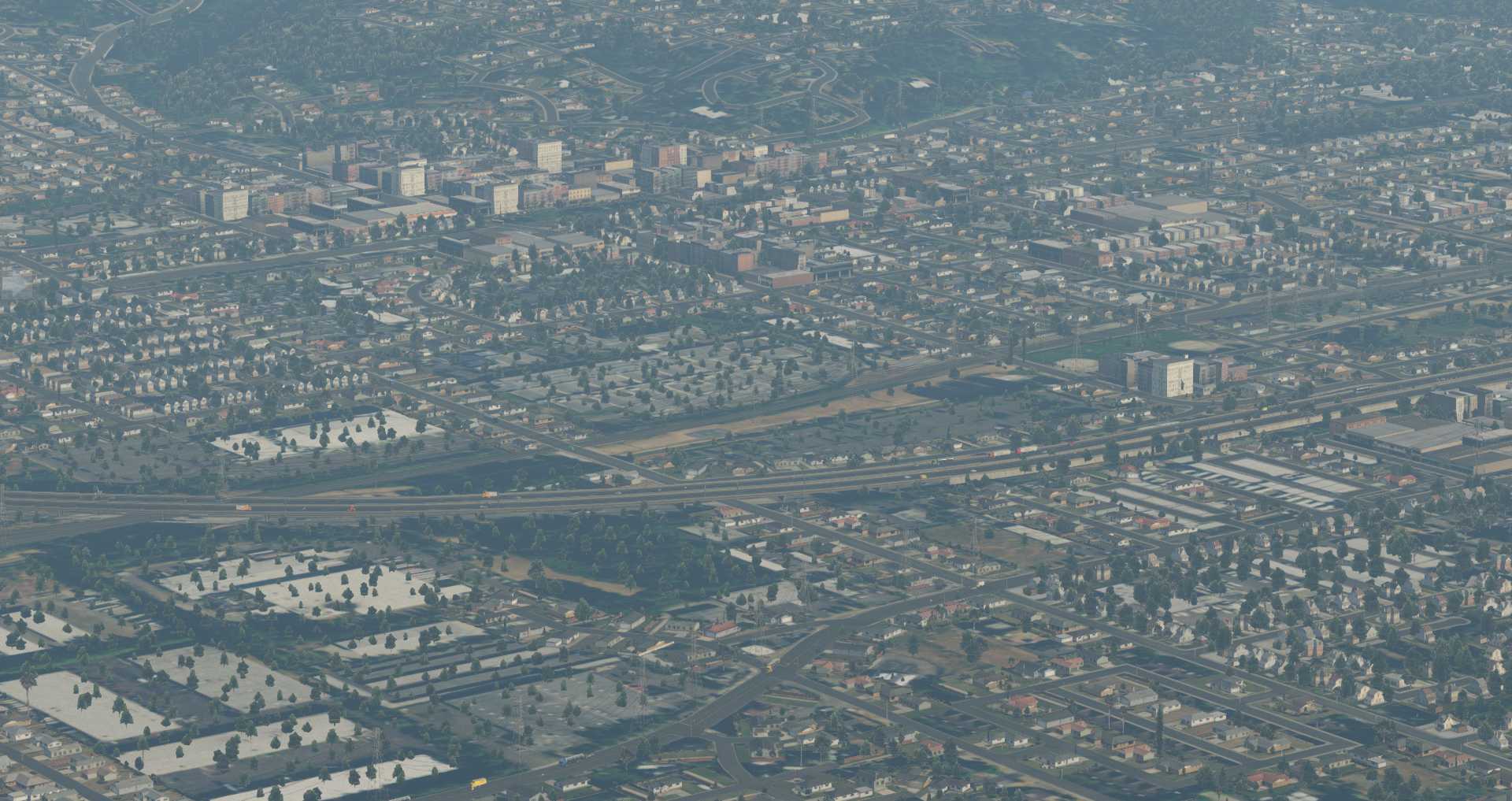 Von Anfang an merkt man wie die Fototextur einen deutlich anderen Eindruck erzeugt, obwohl es im wesentlichen die gleichen Gebäudetypen nutzt nur wurde in diesen Fall die Gebäudeverteilung vom HD Mesh v4 gesteuert. Doch wie wir im Video sehen ist vor allem das Bodenprofil ein vollkommen anderes. Im Vergleich zum Default Mesh wirkt der Flughafen ausgesprochen eben.