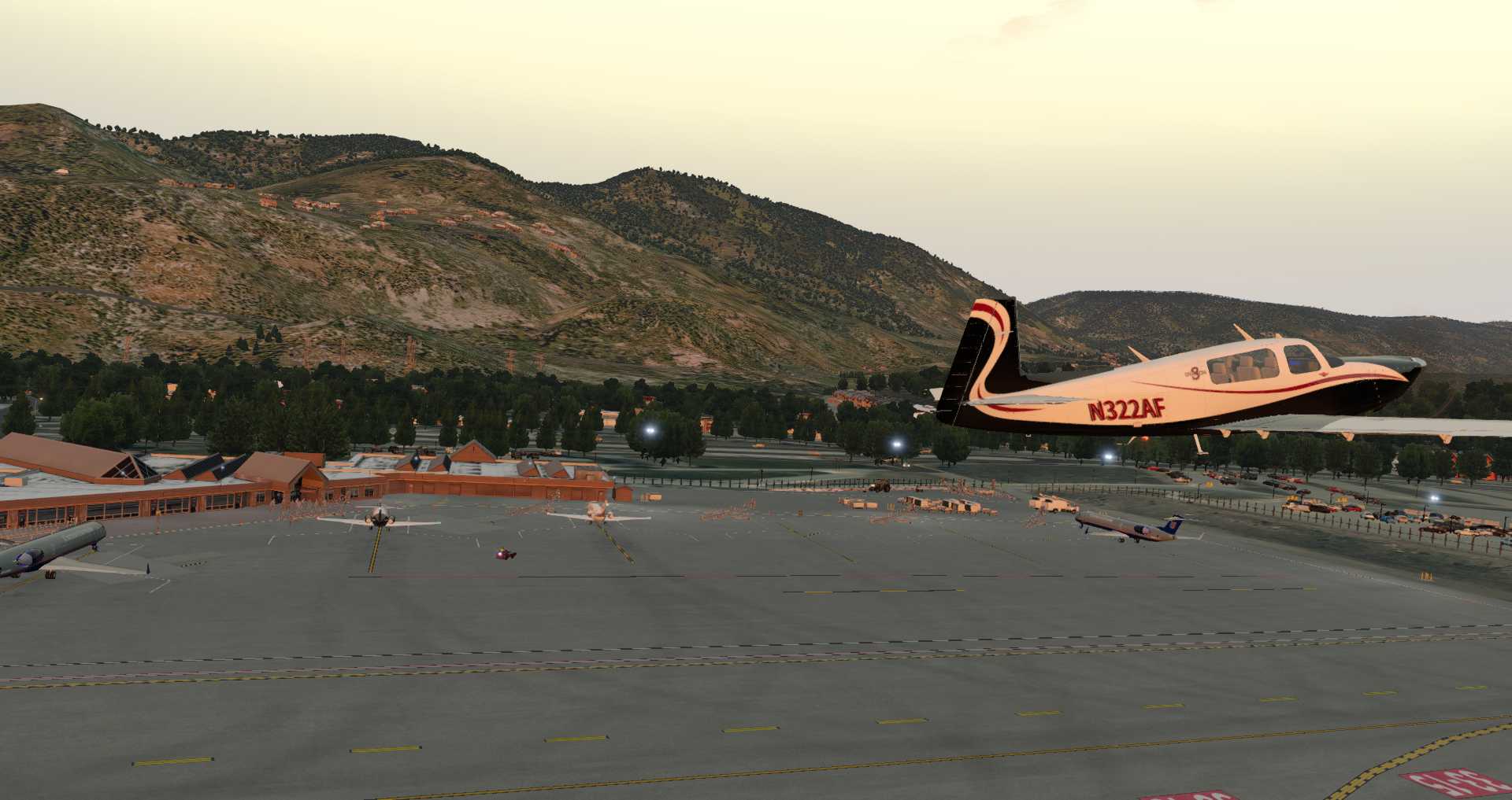 Der Flughafen kommt hier in Bezug auf das Licht noch einmal deutlich besser heraus. Allerdings zeigt sich auch, dass der Flughafen sehr windig ist und in Bezug auf Seitenwind hat X-Plane seit X-Plane 11.10 bei Tiefdeckern wie der Mooney massive Probleme. Doch Austin lässt sich mal wieder Zeit, das Verhalten soll erst in 11.30 repariert werden, was im Moment so manchen Start und so manche Landung zu einem Abenteuer macht, nicht nur in Aspen.