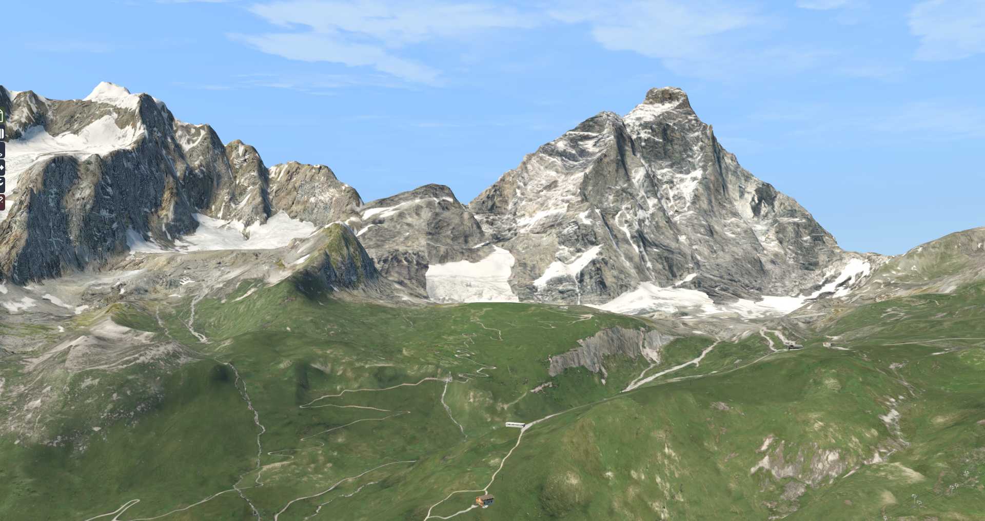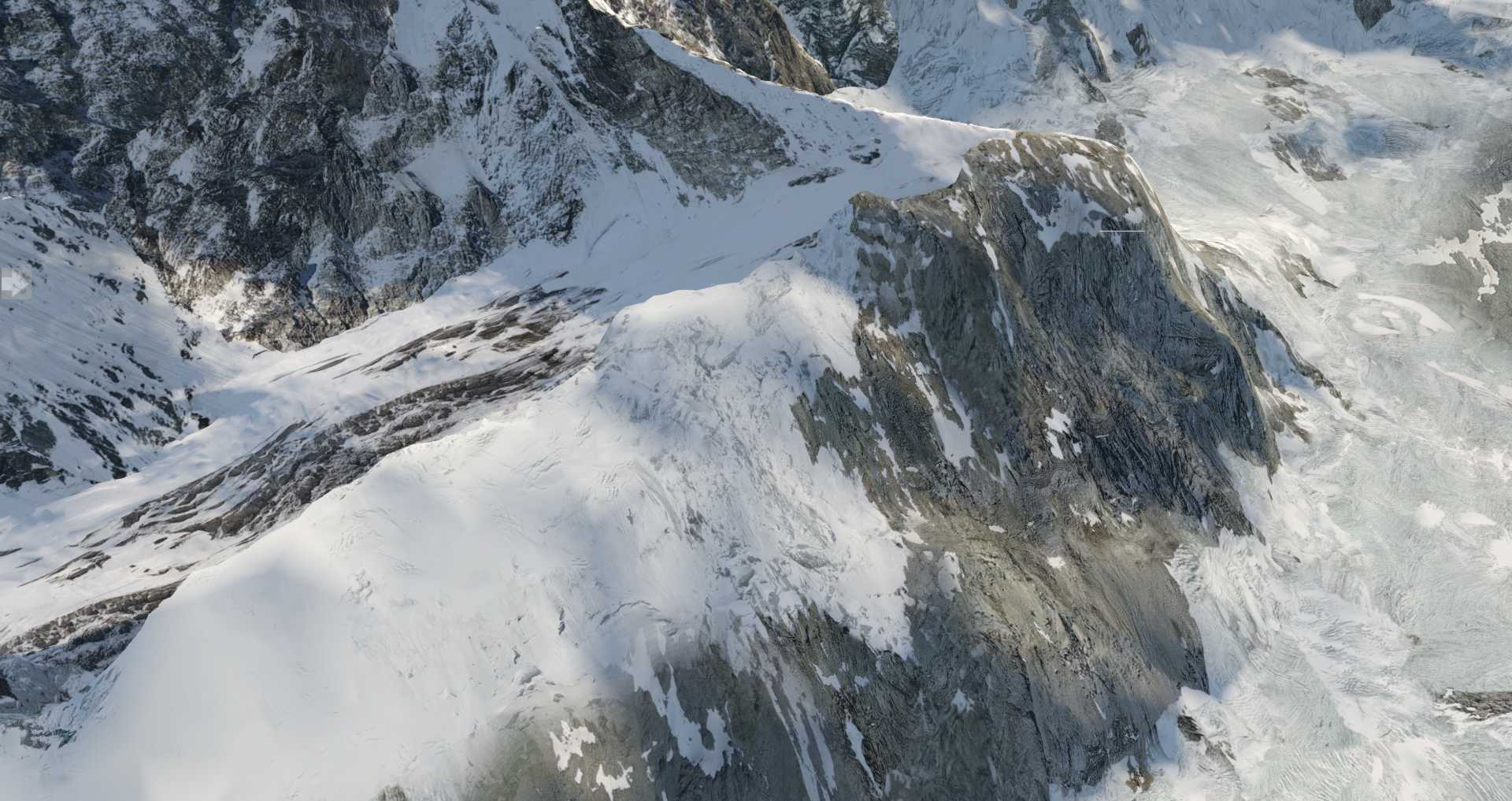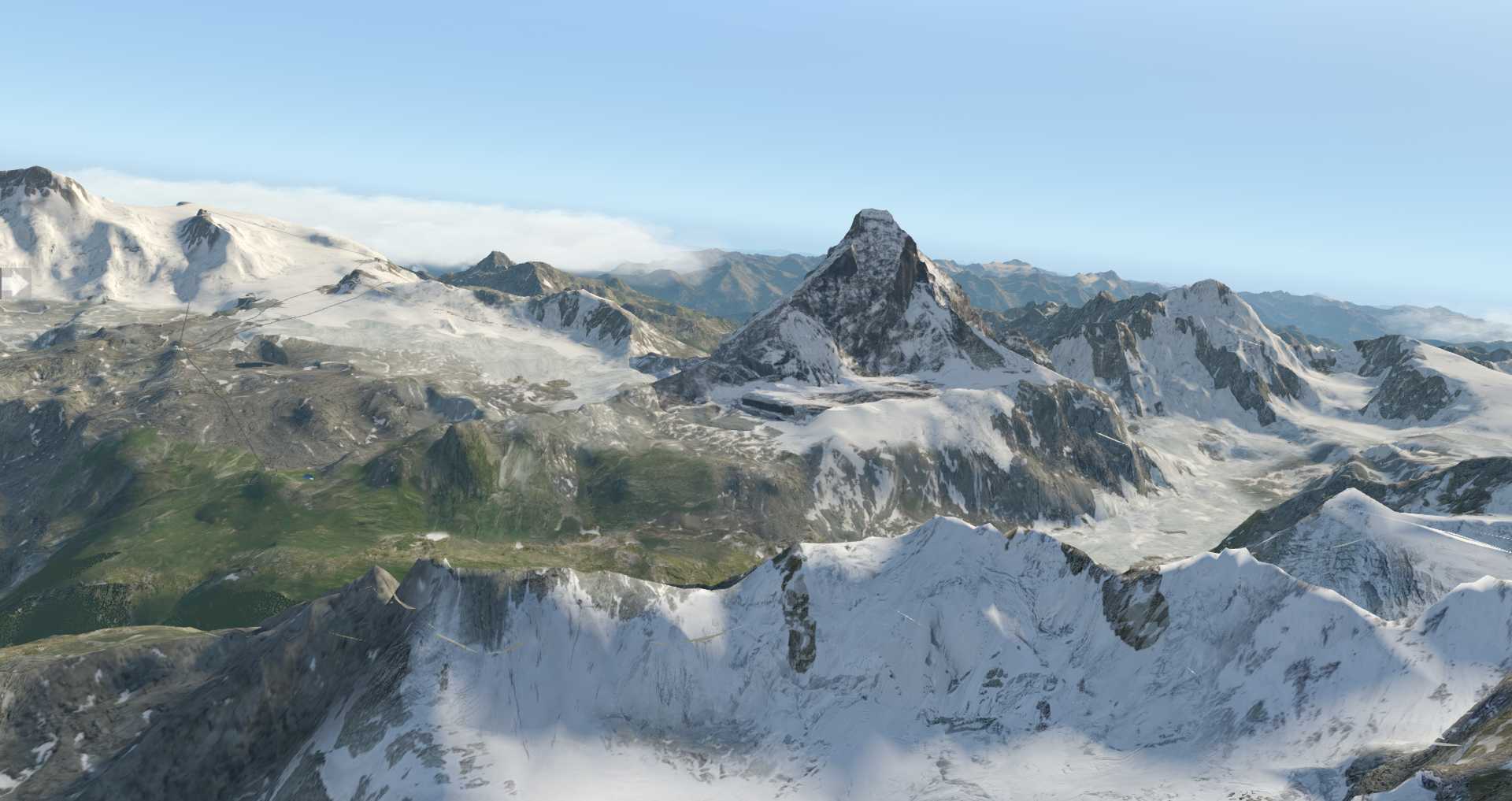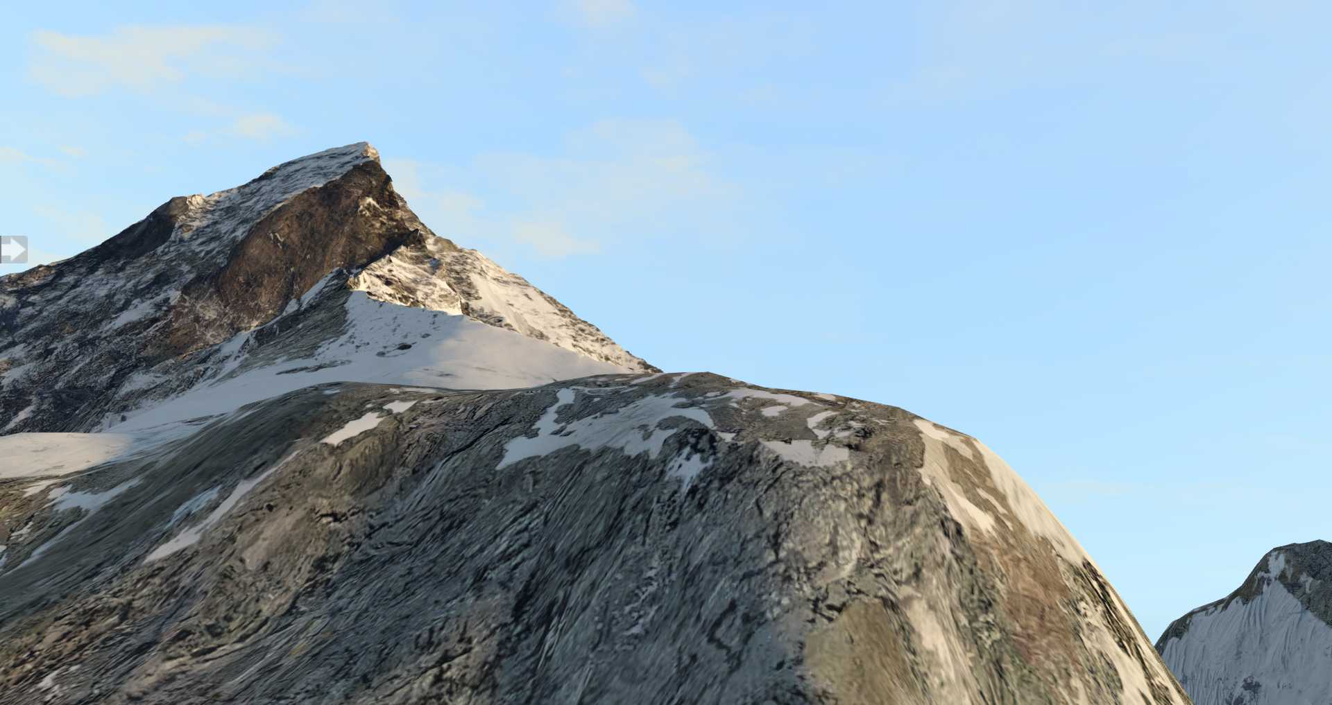 Während die normalen Texturen in Ordnung gehen, hat man sich gerade in den höheren Bereichen des Matterhorns ausgesprochen stark gepuzzelt. Der deutliche Vorteil: Auch wenn man eng an der Spitze vorbei fliegt, wirkt alles immer noch ausgesprochen scharf. Deutlich schärfer als es bei einer normalen Fototextur der Fall ist.