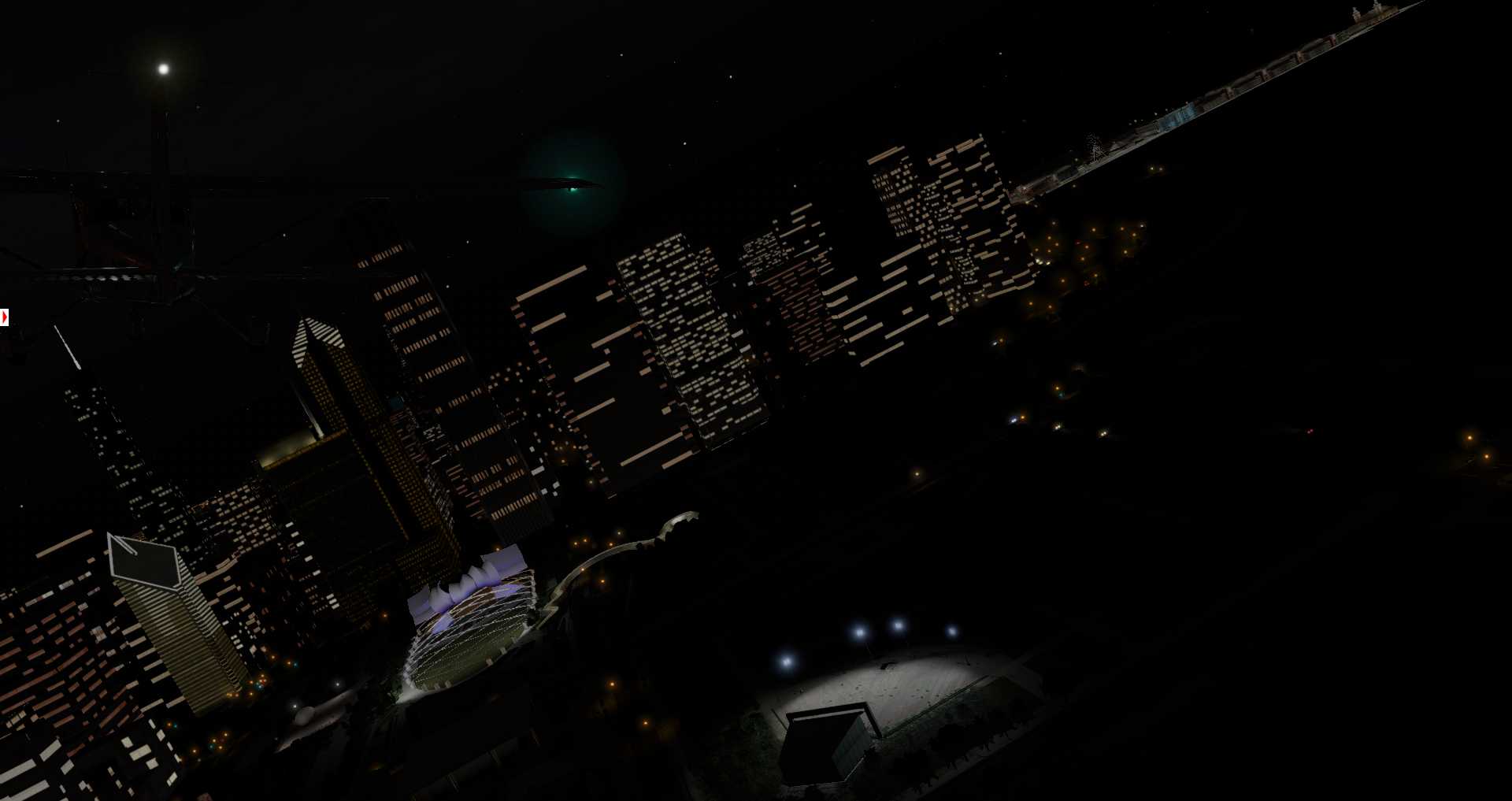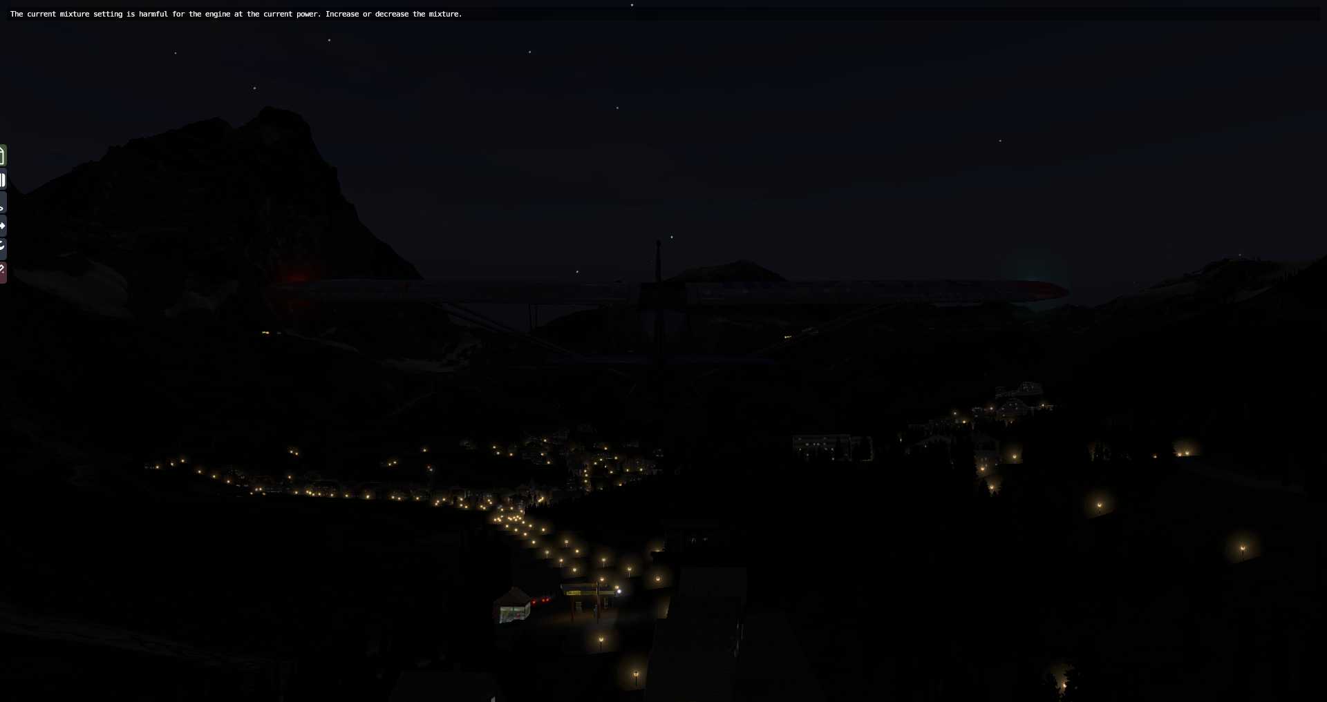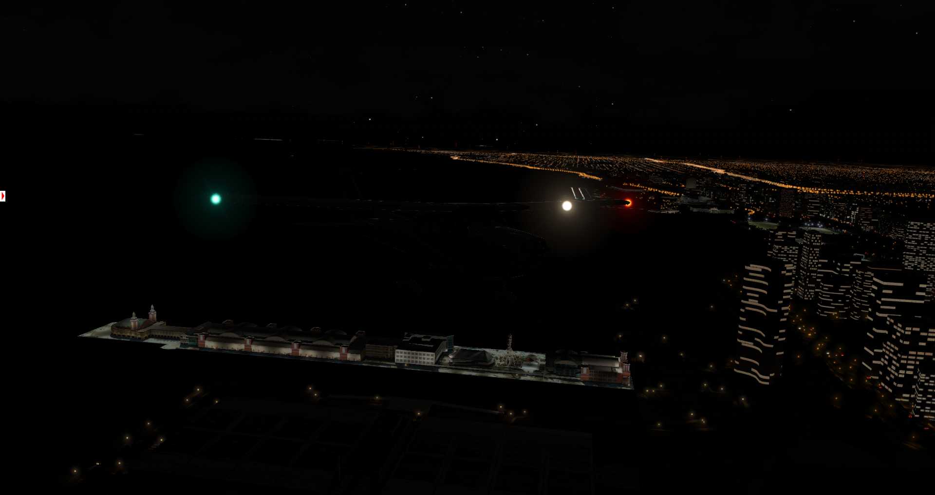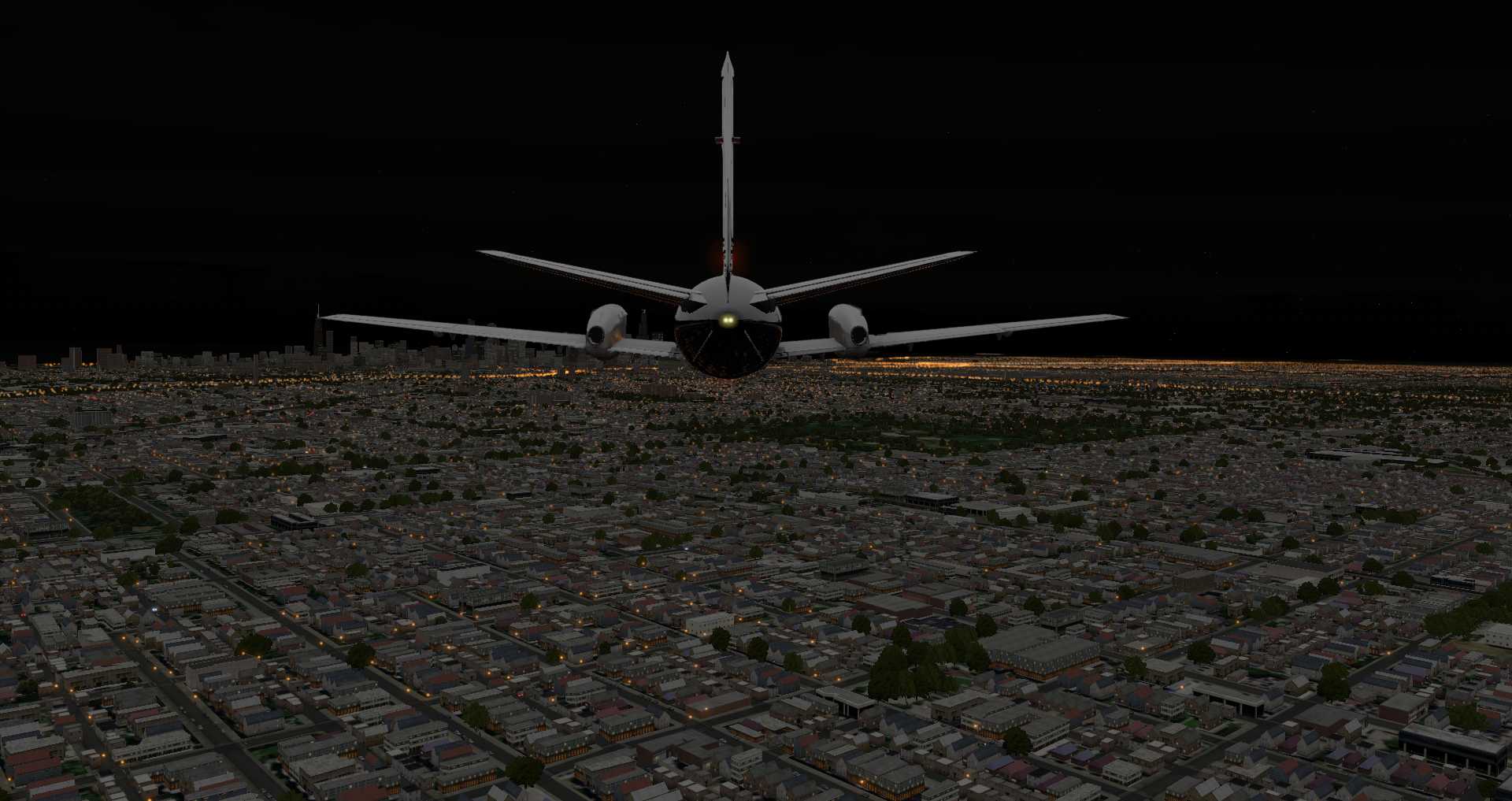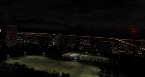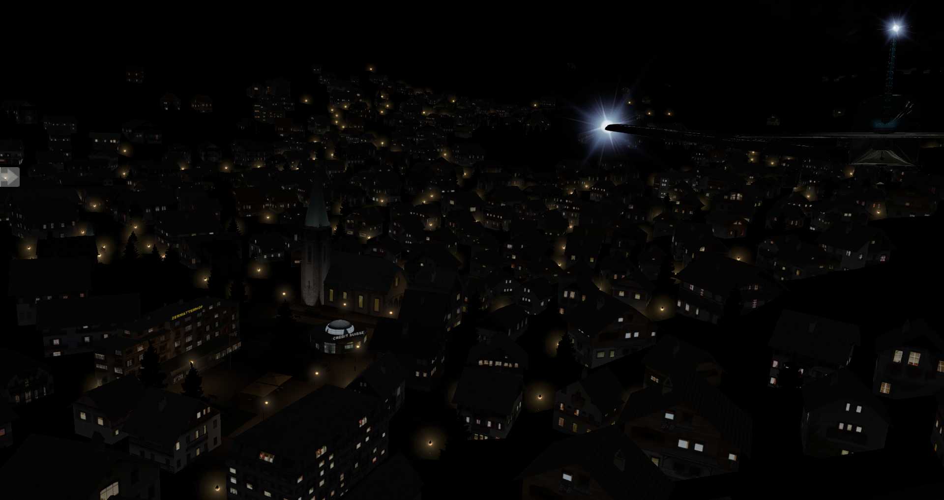Die Rechenkapazität erlaubt es nur Straßen und damit Straßenlaternen und Autos in einem gewissen Bereich zu zeichnen. Daher nutzt X-Plane für weiter entfernte Gebiete nun Nachttexturen mit etwas umstrittenen Ergebnissen, denn diese funktionieren bislang nicht wenn Fototexturen zum Einsatz kommen und in niedrigen Flughöhen ist der Eindruck nicht wirklich überzeugend.