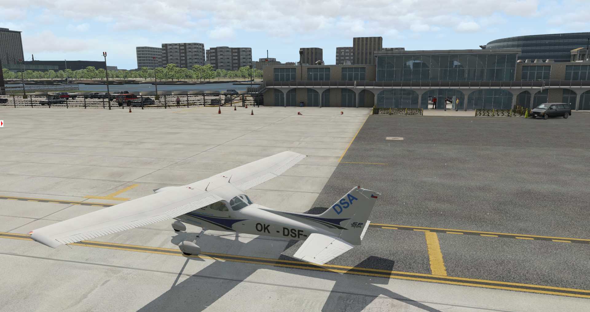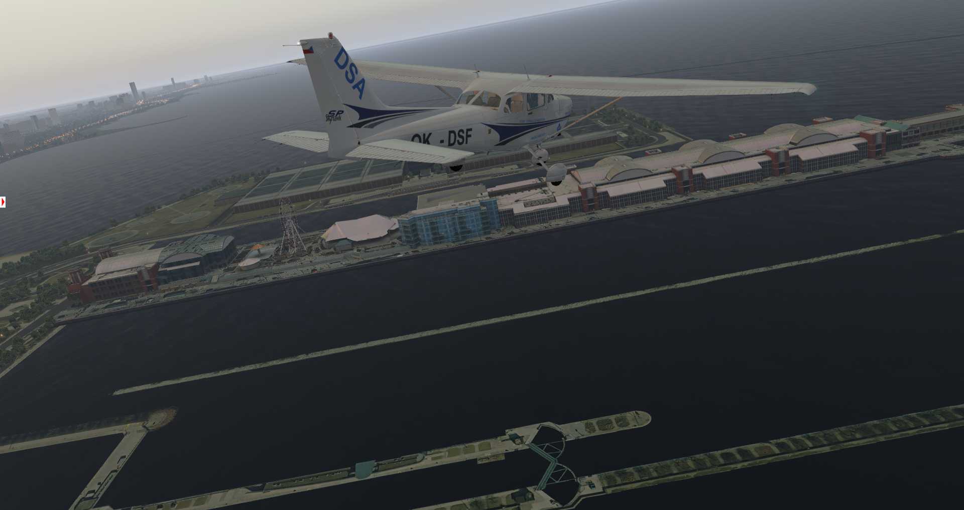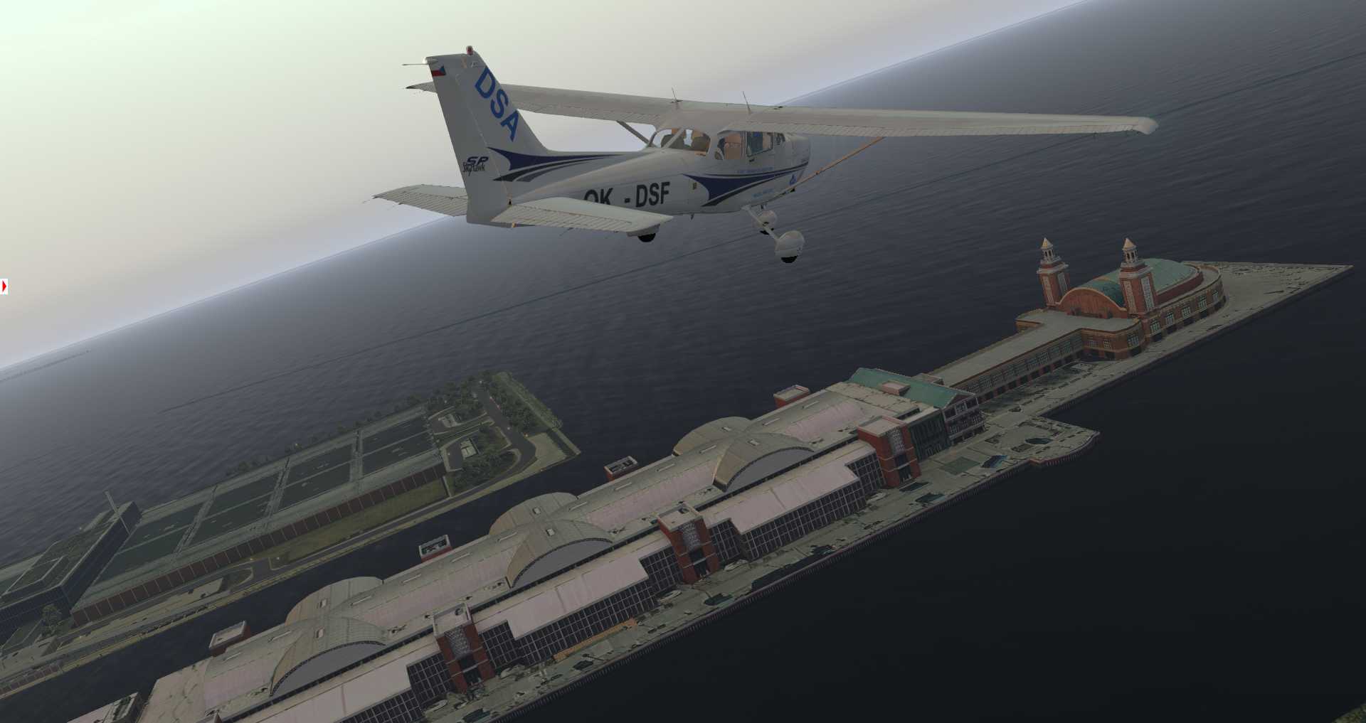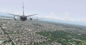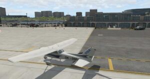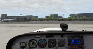 Es ist jedoch kaum zu übersehen wie groß die Schwächen der Szenerie sind. Die Gebäude entsprechen schlichtweg nicht dem heutigen Standard und man hat sich bemüht die normalen Standard-Möglichkeiten in die Szenerie hinein zu passen. Einzig die Gegend um den Flughafen selbst wurde aktualisiert, doch um das genauer zu beurteilen brauchen wir ein langsameres Flugzeug.