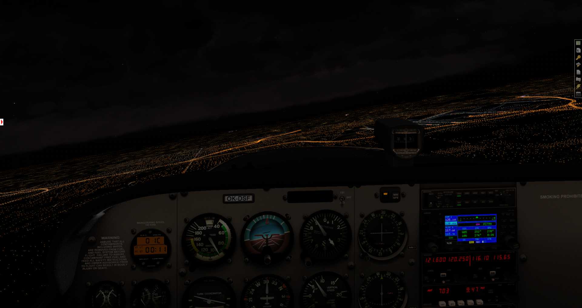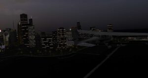 Wir passieren den Flughafen. Ein Beleuchtungscheck zeigt uns, dass wir hier nicht nur über Fototexturen fliegen, sondern X-Plane Highways. Auch ein Blick zurück zeigt uns das hier neue und alte Technik direkt nebeneinander liegen. Die alten Gebäude haben nur veraltete LIT Texturen, während wir auf der anderen Seite Dynamic Lightning im Einsatz haben.