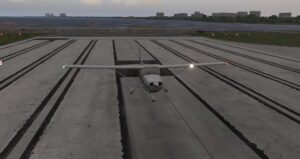 Beim Landeanflug zeigt sich recht gut, wie weit AirfoilLabs inzwischen die Soundatmosphäre verbessert hat. Fast jedes Wackeln des Flugzeugs zieht sofort ein klappern nach sich. Zum Beispiel beim schnellen Sinkflug bei etwa 4 Minuten Laufzeit. Doch bei der Landung taucht plötzlich direkt vor uns auf der Landebahn ein Flugzeug auf, was ei9ne weitere Schwachstelle der Szenerie offenbart. Dem Flughafen fehlen Taxiways, daher starten die Flugzeuge nicht im Terminal-Bereich.