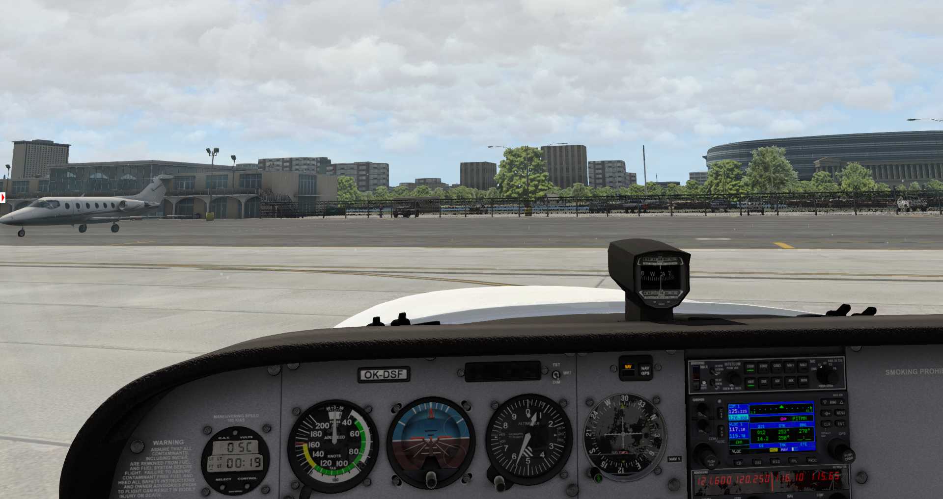 Und kaum das wir in der Luft sind, stecken wir auch schon in der OrbX Szenerie. Man kann es kaum übersehen, durch die recht einfachen, aber zumindest zahlreichen Gebäude. Und unterfüttert sind sie mit einer Fototextur, die im Overlay herumliegt, auch wenn dies nicht besonders effizient für X-Plane ist, aber das ist auch nur eine konvertierte Szenerie.