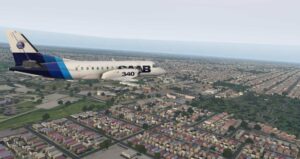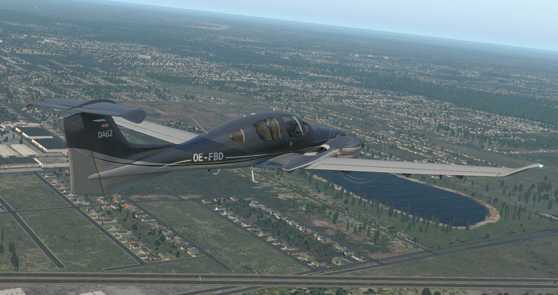 Sehr prägnant ist das erste Bild des Flugs von Aerobasks DA-62. Noch ist sie im Gebiet des Default AutoGen, kurz vor dem Übergang der OrbX Szenerie mit ihren wenig überzeugenden Gebäuden. Wenn man nicht wie die Saab 340 im Tiefflug über die Landschaft jagt, geht es durchaus. Man darf nur nicht zu nahe heran fliegen.