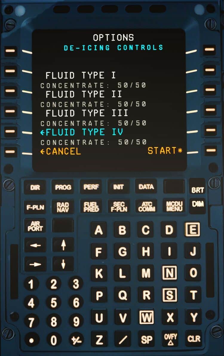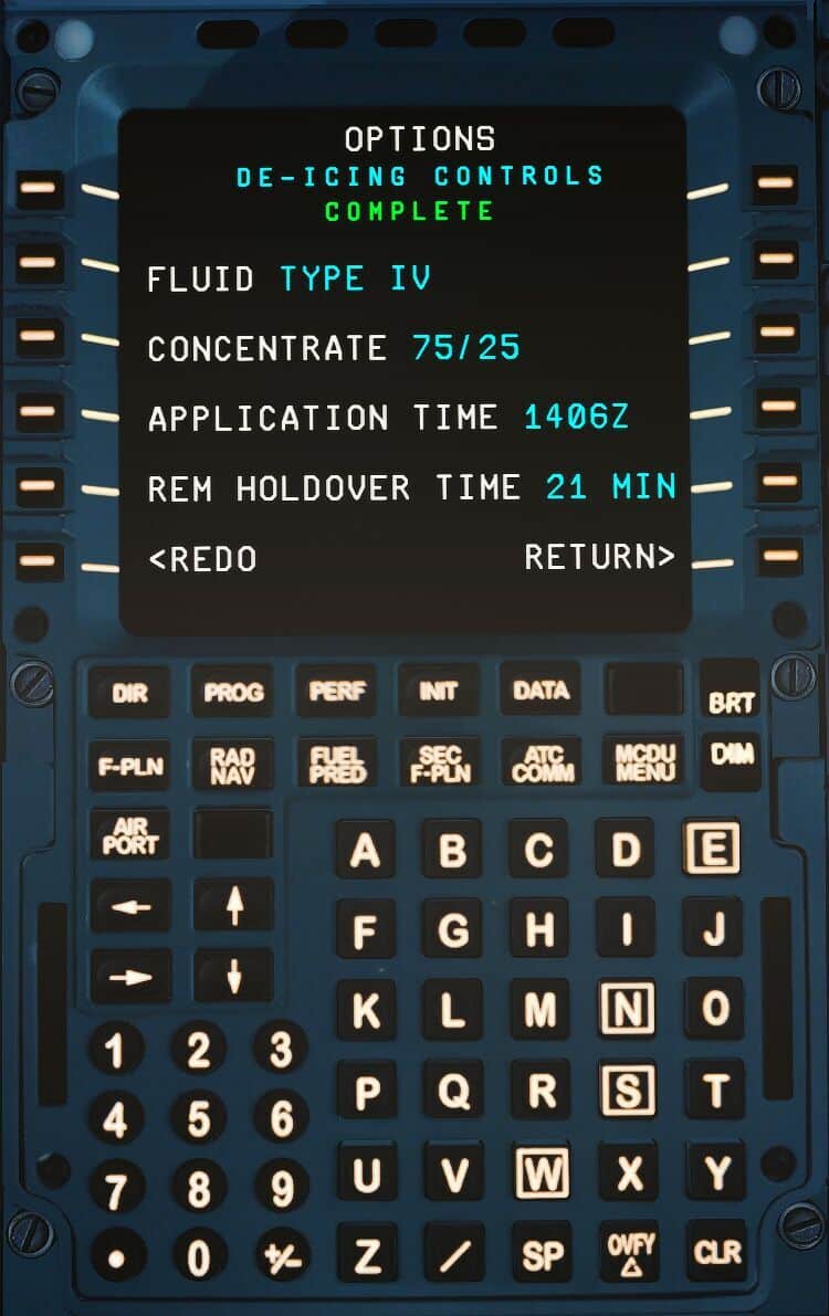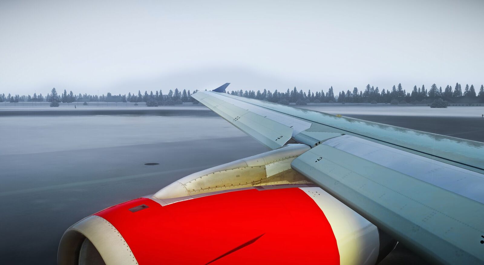 Und wo Eis ist, da sind auch die Gegenmaßnahmen nicht weit, zumindest wenn man erfolgreich in die Luft kommen möchte oder dort bleiben möchte. Immerhin sinkt der Auftrieb und steigt der Luftwiderstand schon bei gering wirkenden Vereisungsgraden sehr signifikant. FSLabs hat dem natürlich Rechnung getragen und deswegen Anti-Ice- und De-Icing-Maßnahmen realistisch umgesetzt. Beim De-Icing per Enteisungsflüssigkeit ist je nach Flüssigkeitstyp, wie in der Realität, auf Holdover-Zeiten und ähnliches zu achten. Beim Taxi-out lässt sich die mit der Enteisungsflüssigkeit benetzte Tragfläche dann auch erkennen.