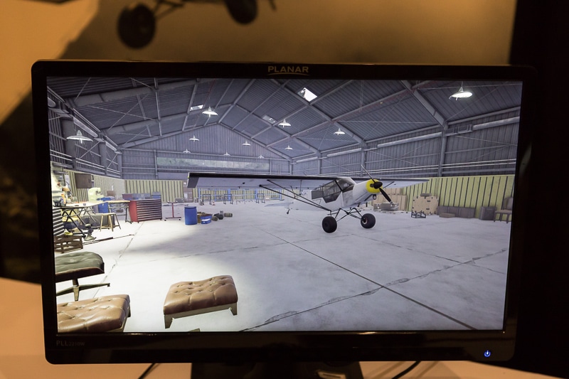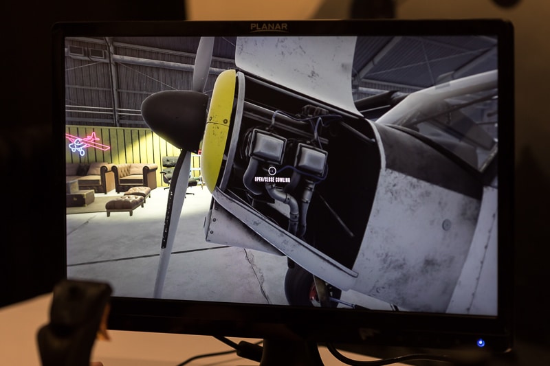 Ausgangspunkt war immer ein sehr liebevoll gestalteter Hangar. Hier kann man frei herumlaufen. Man kann das Flugzeug von allen Seiten kontrollieren, Türen und Cowling öffnen, nach dem Motor schauen. Das schafft schon mal viel Immersion.