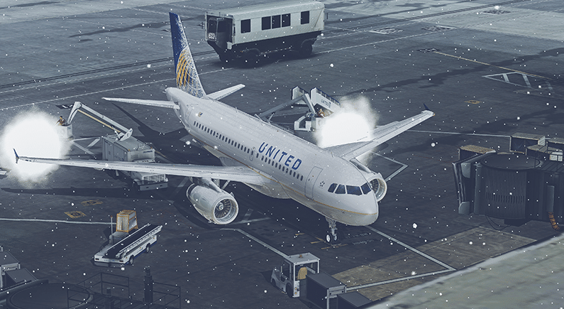 - De- and anti-icing with realistic hold-over times, fully integrated with GSX de-icing equipment and unique de-icing fluid visual effects