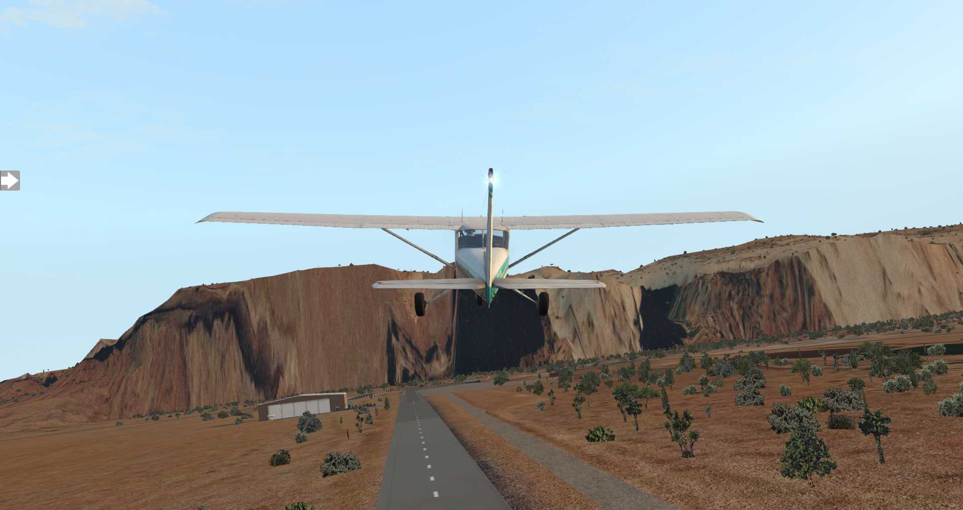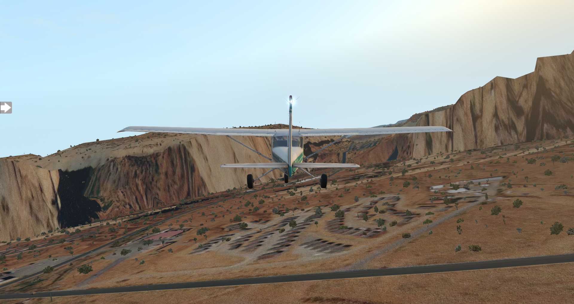 Wir starten genau in die verbotene Richtung, denn auf diesen Flughafen starte man immer vom Felsen weg. Im Vergleich zur OrbX Version fällt auf, wie stark das Höhenprofil vereinfacht und reduziert wurde. Der Einschnitt in den Felsen am Ende der Landebahn ist eindeutig falsch.