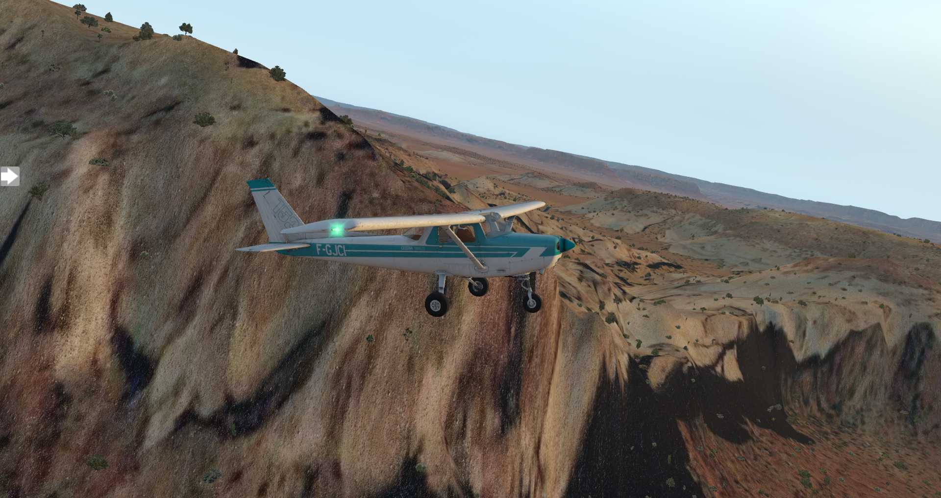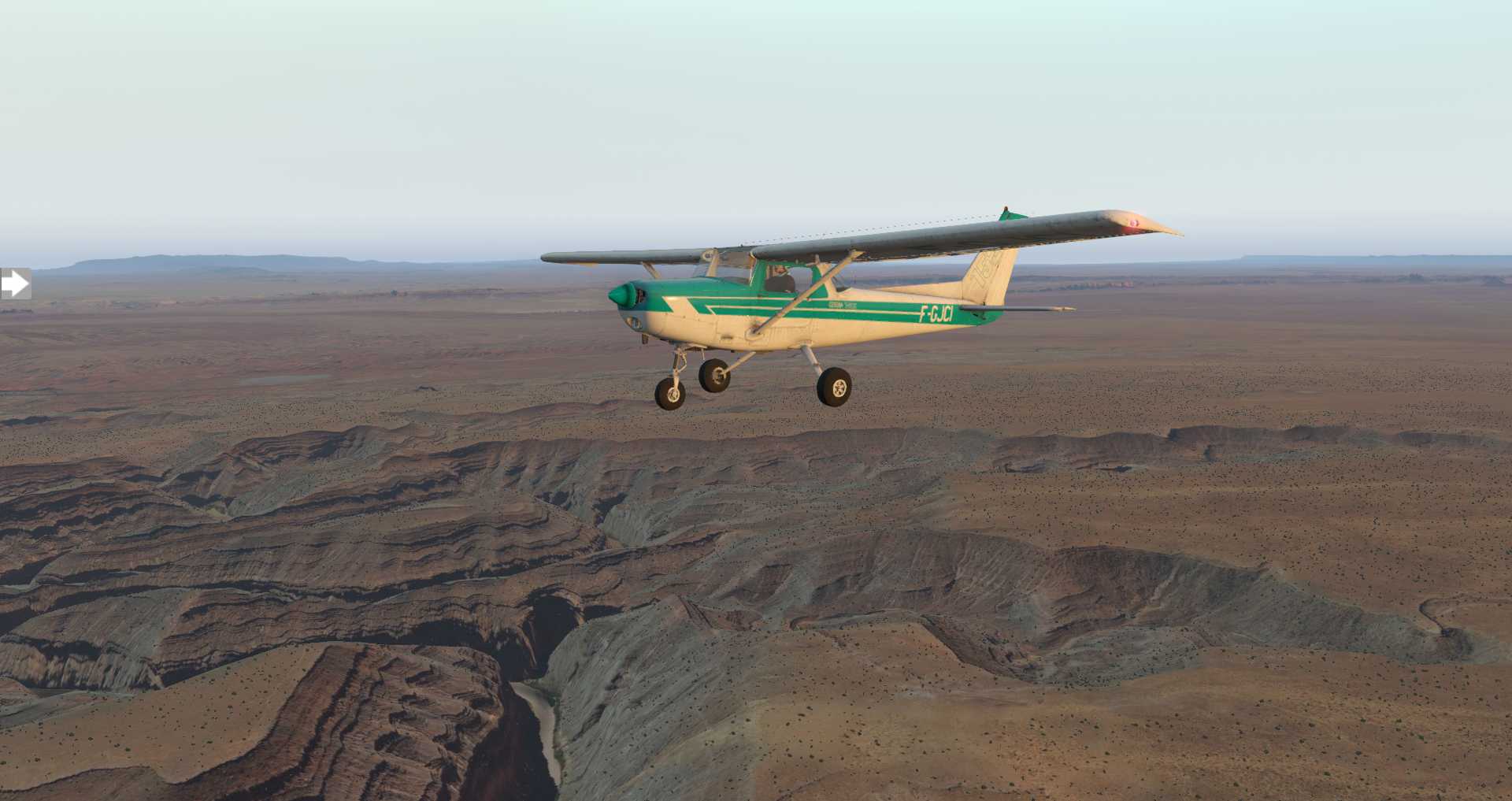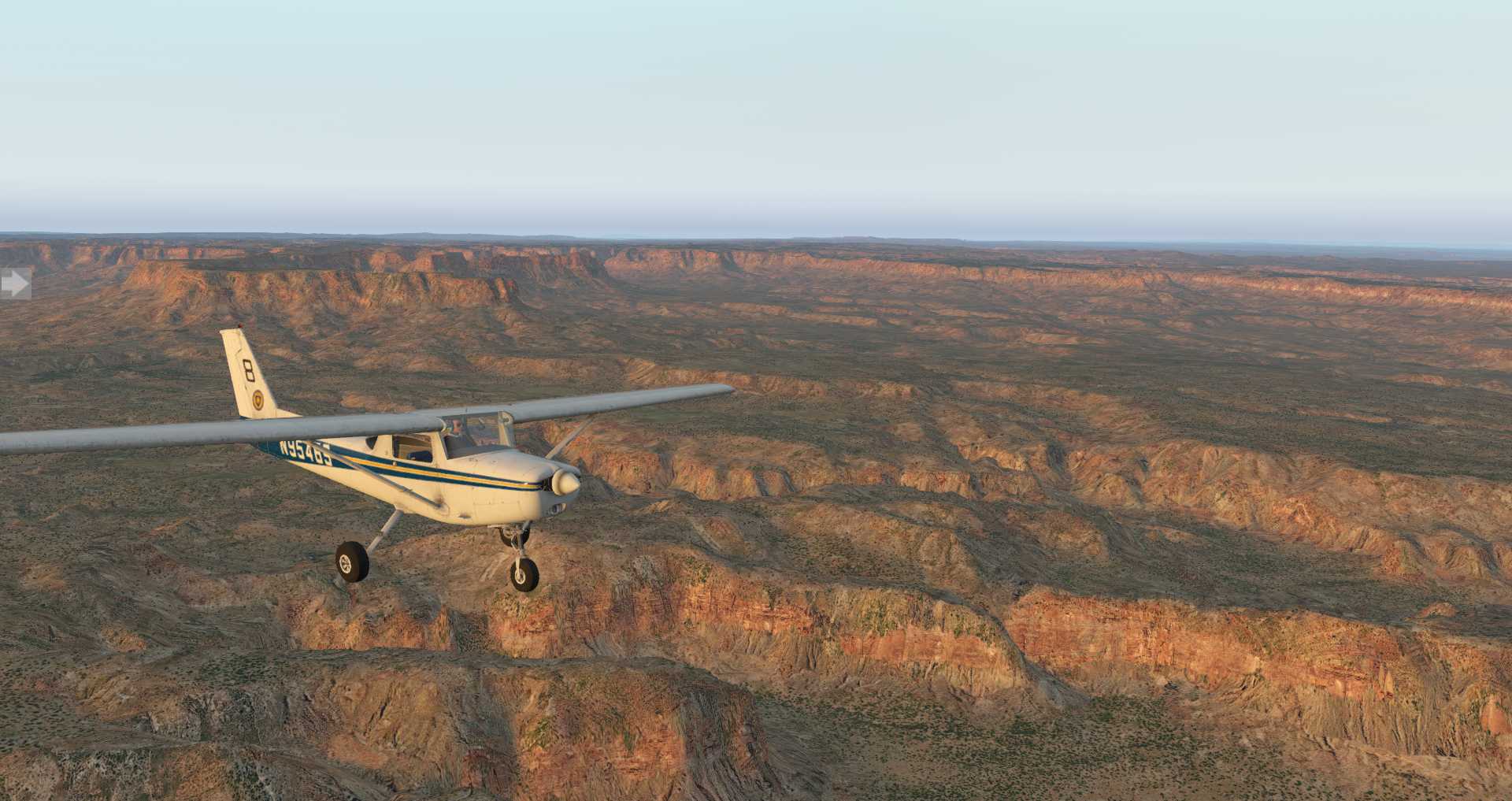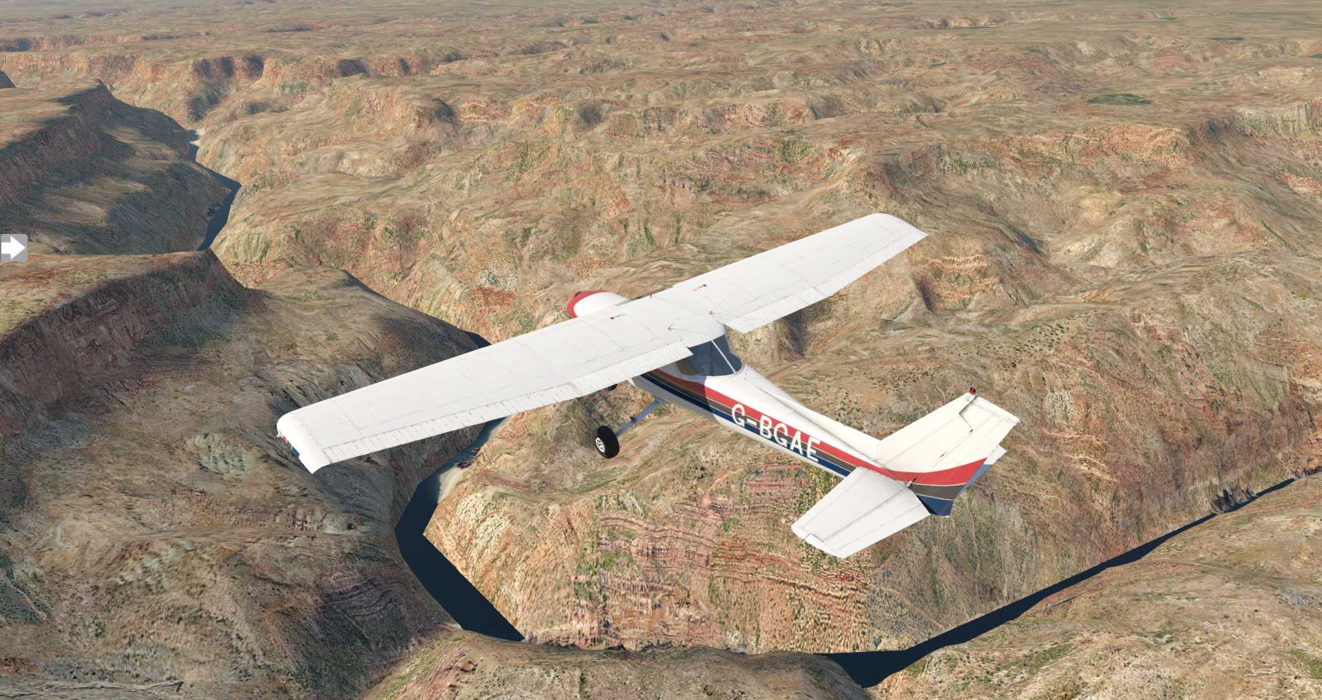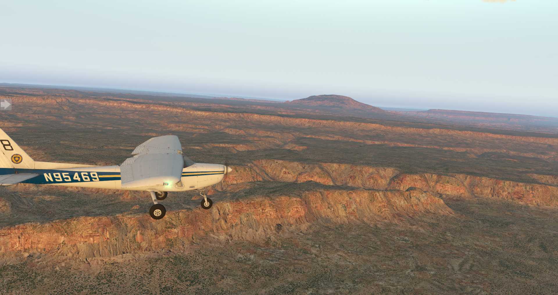 Erst hier hinten, wo wir bereits bei den Canyons zurück sind, endet die Szenerie und wir befinden uns im Standard UHD Mesh.Und wie wir sehen ist abgesehen von der Färbung der Unterschied sehr unauffällig. Mit einer schnelleren Maschine kann man ihn leicht übersehen.