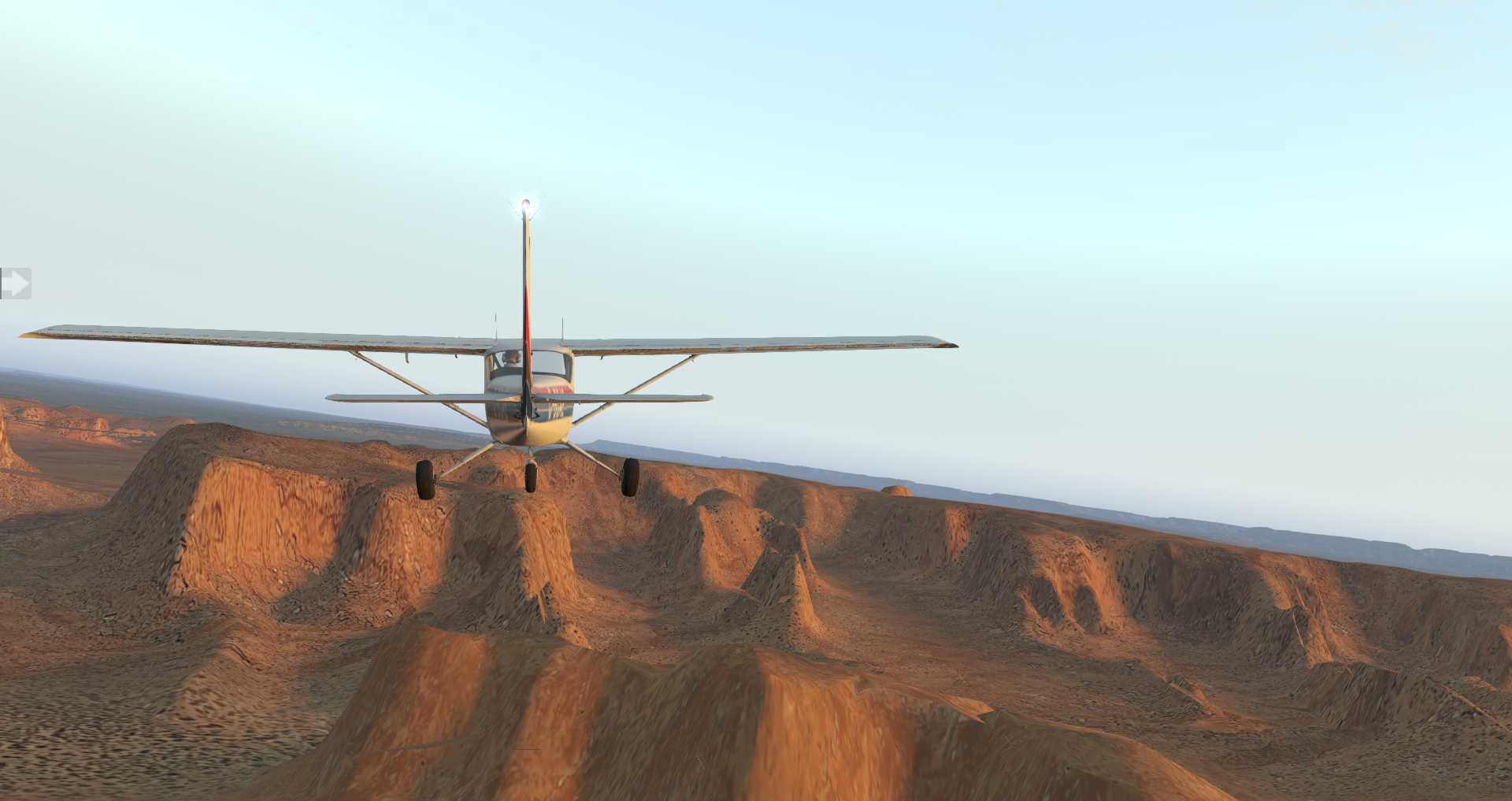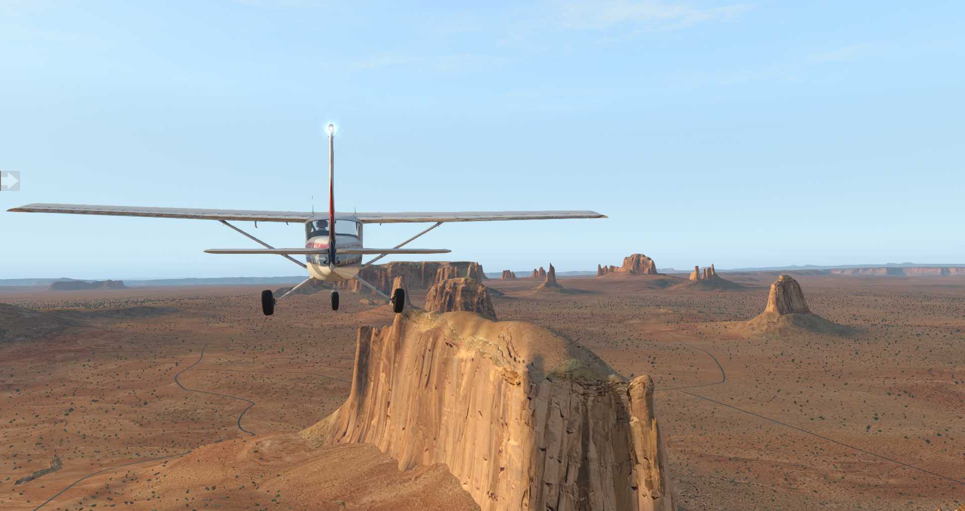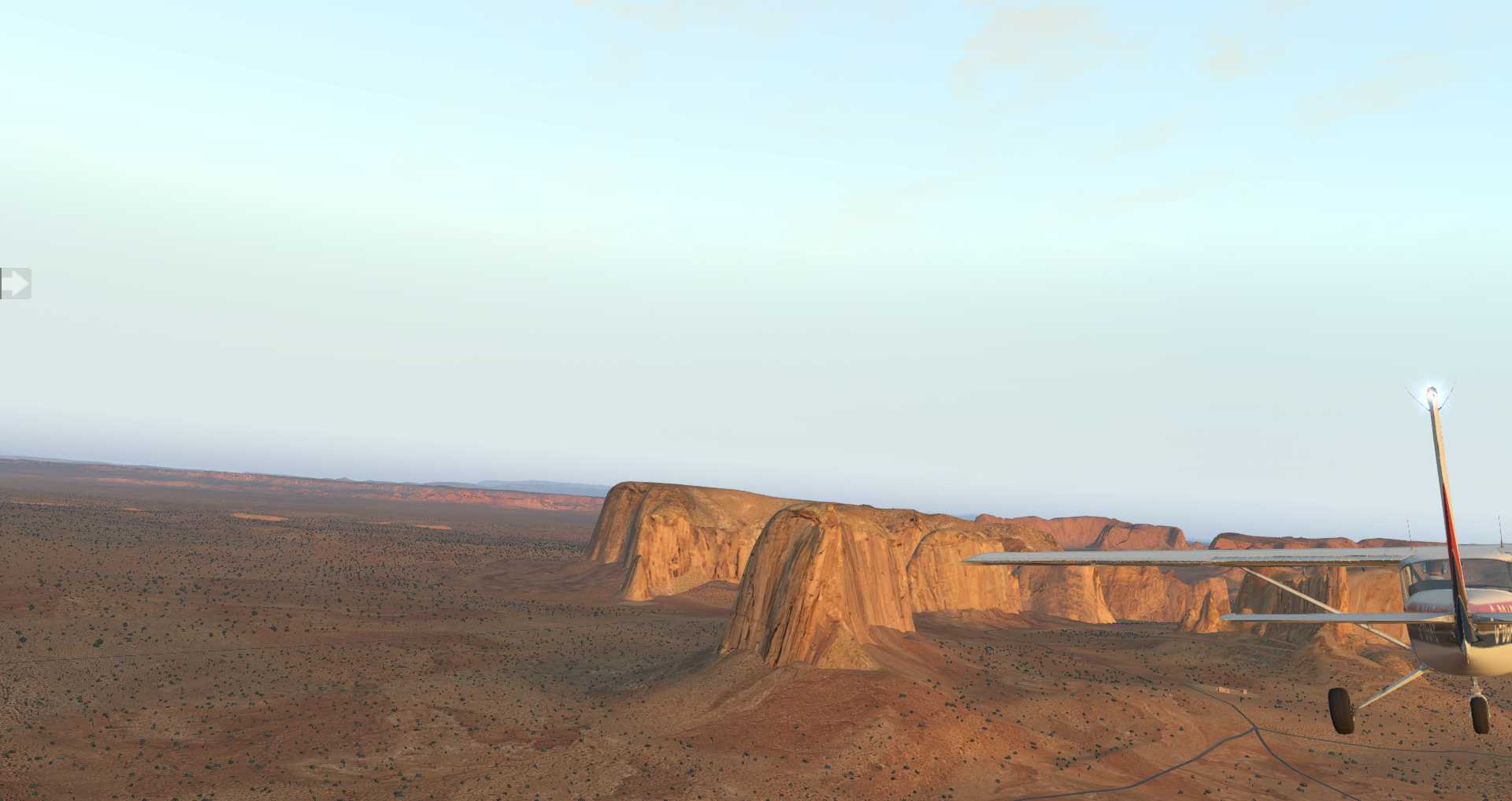 Die Windrichtung hat sich geändert, so werden wir nicht mehr derart eingenebelt, auch wenn der Rückenwind den Start deutlich verkompliziert. Doch wenn wir in der Luft sind können die Berge des Monument Valley weit besser mit dem Licht spielen, als die Fototexturen. Man merkt auch die stärkere Verwandschaft zum OrbX Monument Valley.