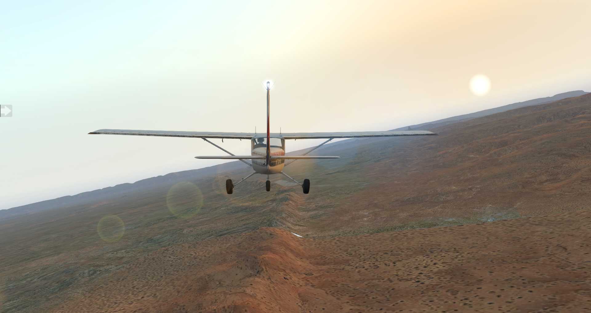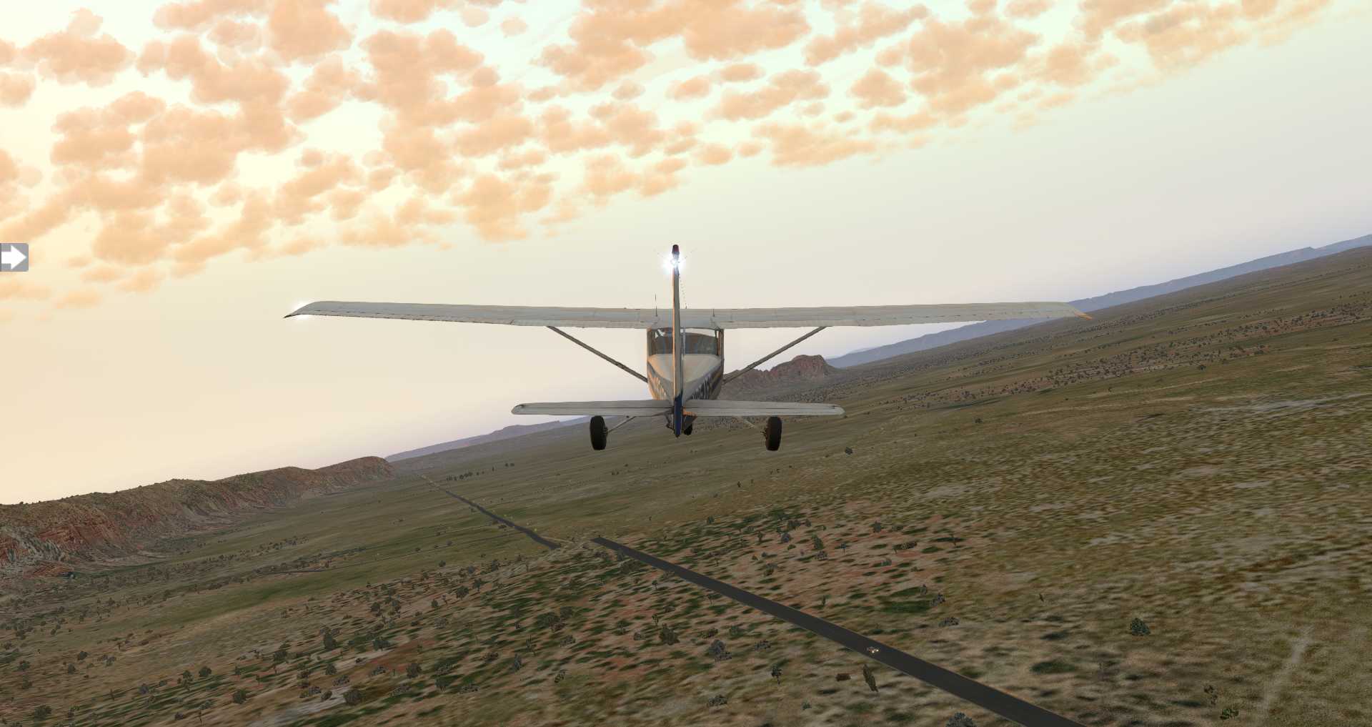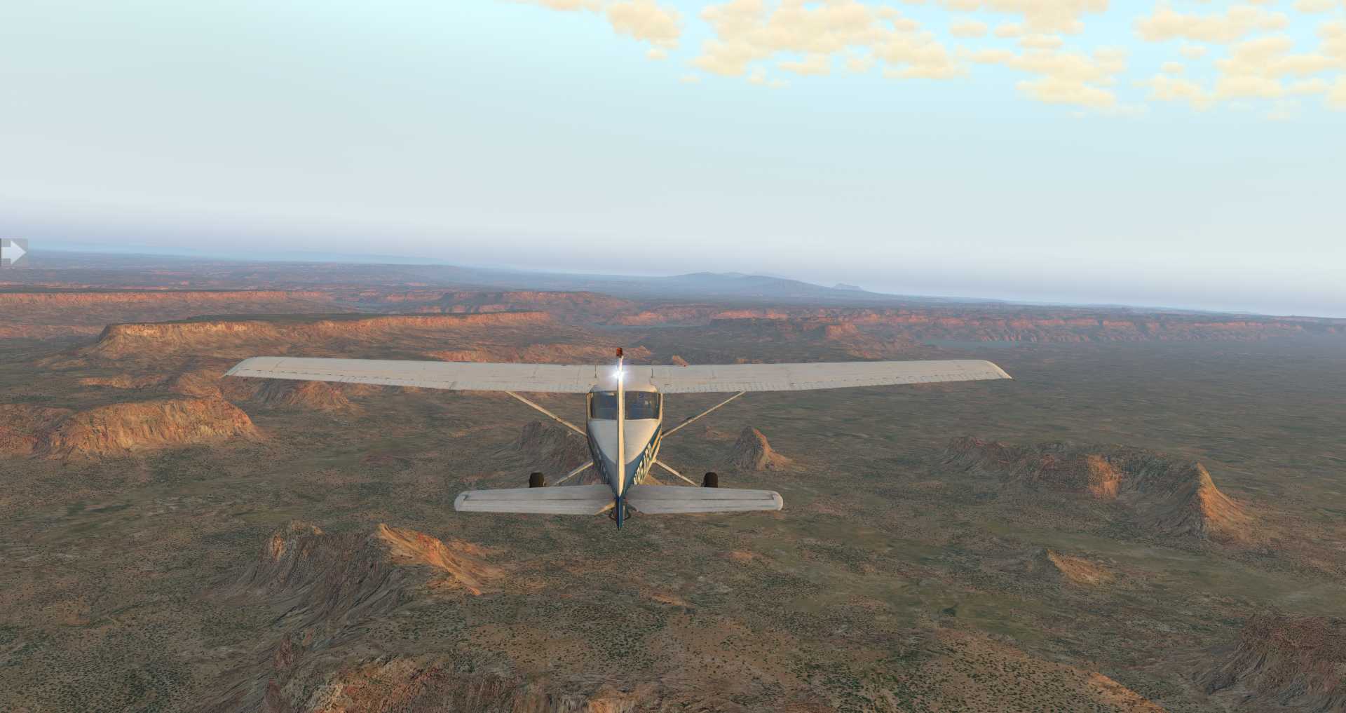 Die Windrichtung hat sich geändert, so werden wir nicht mehr derart eingenebelt, auch wenn der Rückenwind den Start deutlich verkompliziert. Doch wenn wir in der Luft sind können die Berge des Monument Valley weit besser mit dem Licht spielen, als die Fototexturen. Man merkt auch die stärkere Verwandschaft zum OrbX Monument Valley.