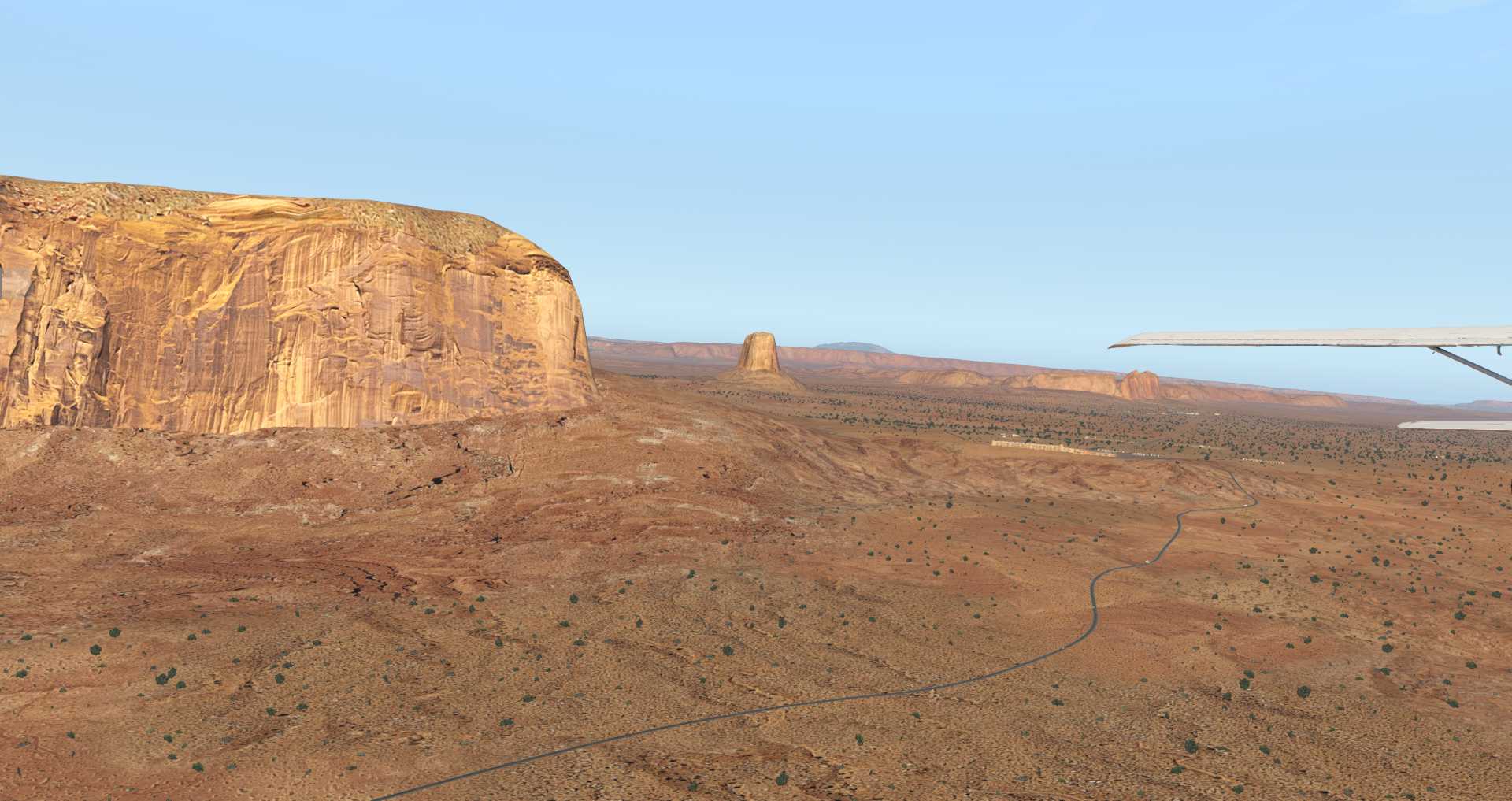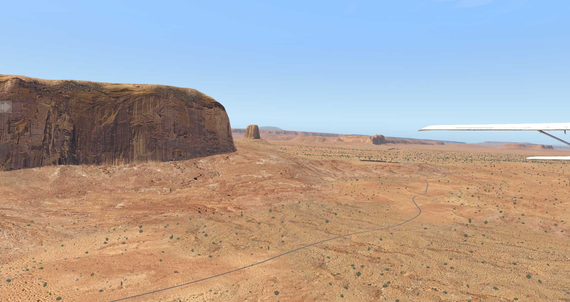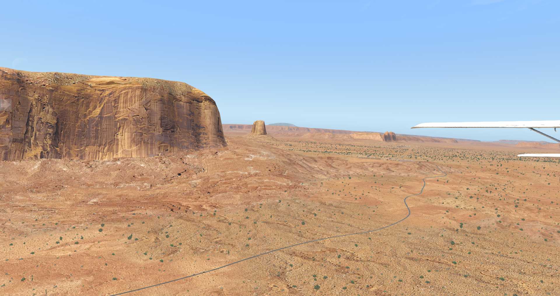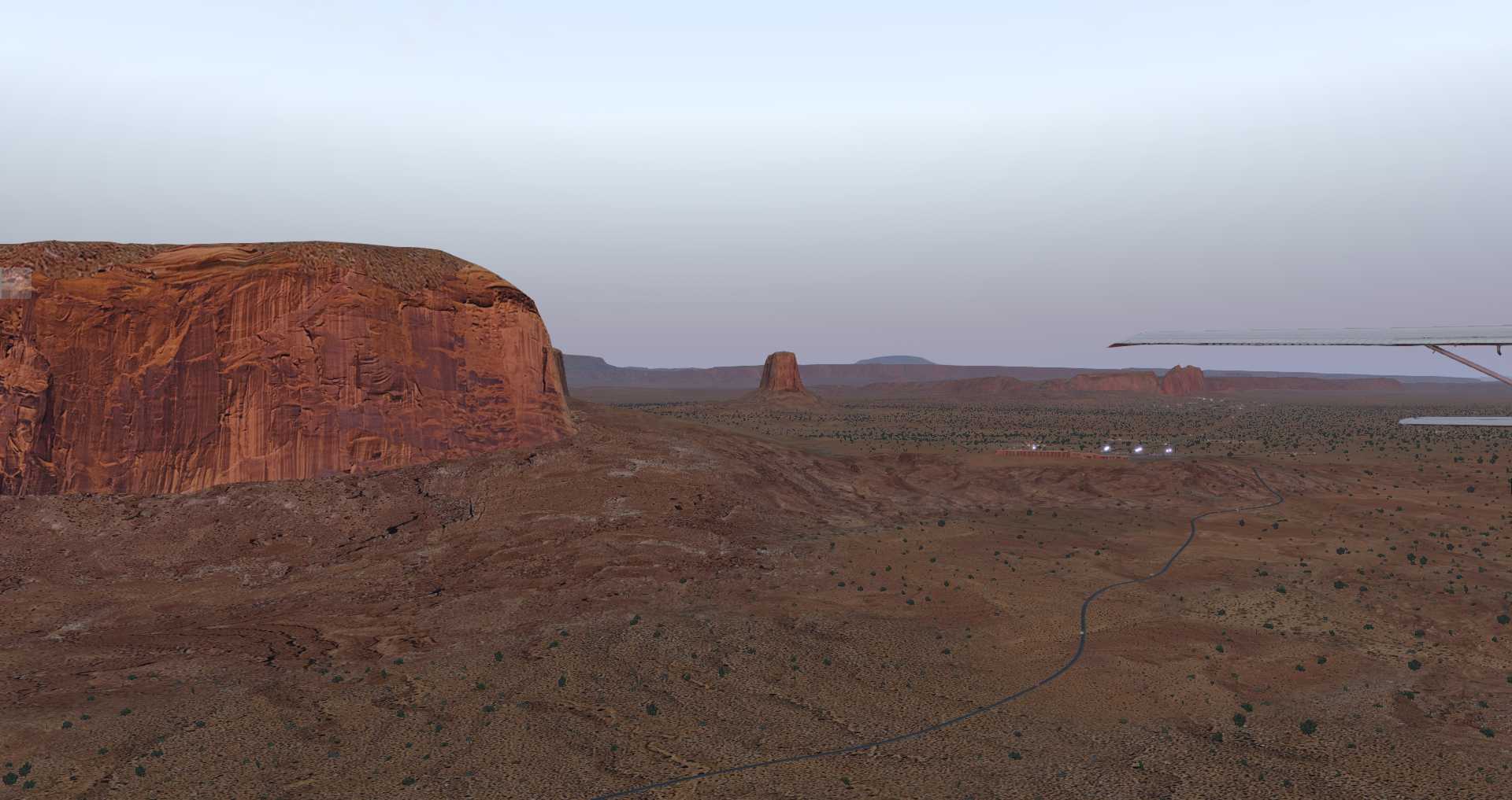 Schon muss sich das Terrainmodell nur noch um das allgemeine Geländeniveau kümmern., das Dank Fototexturen noch nicht einmal besonders detailliert vorliegen muss. Das war das eigentliche Erfolgsgeheimnis des OrbX Monument Valley für den FSX/P3D.
