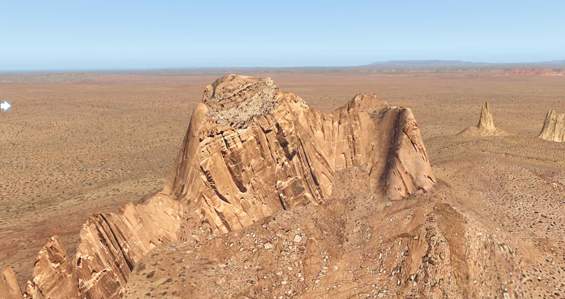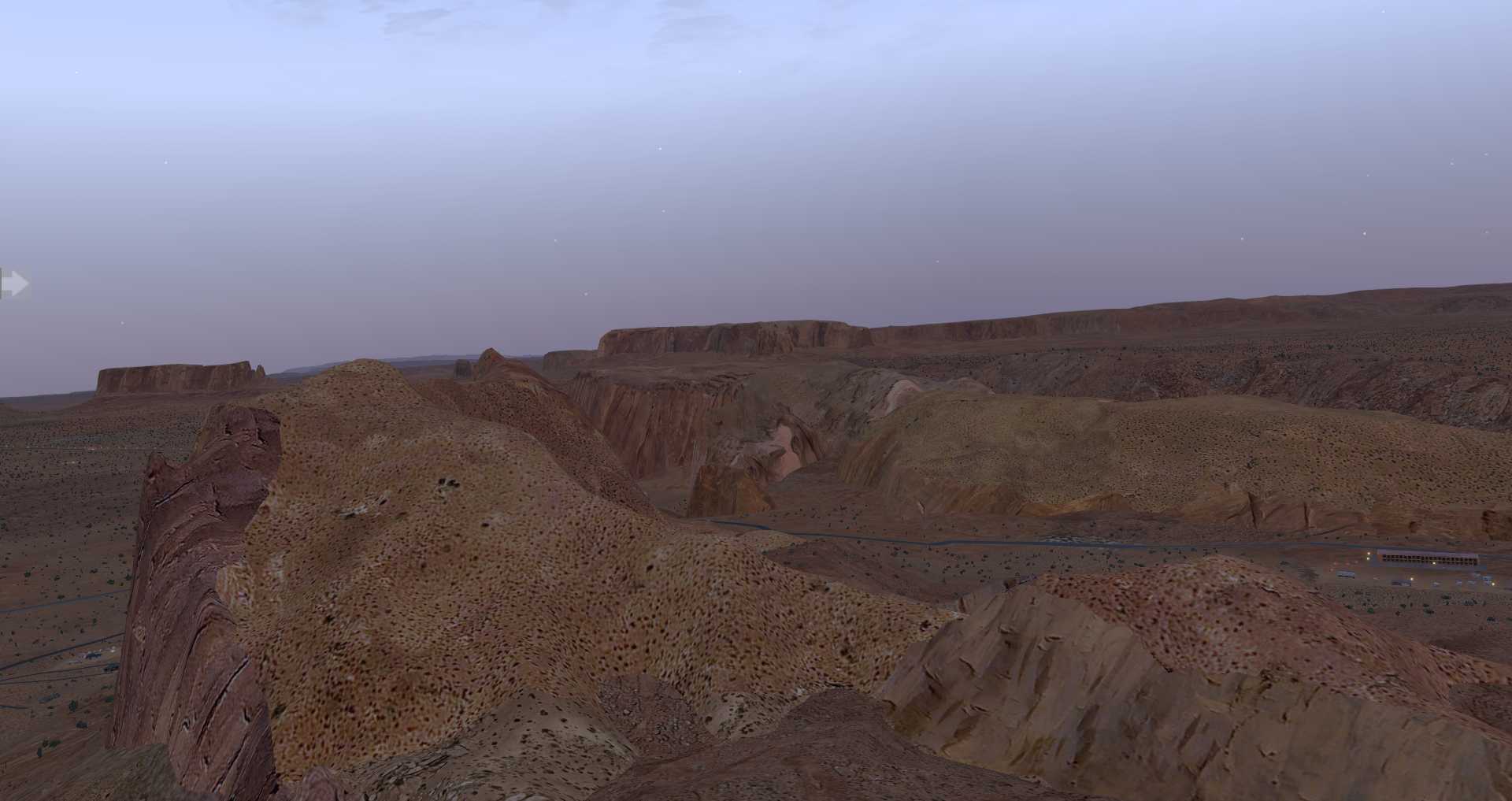 Aus der Entfernung kann man recht gut die Felsenformationen des echten Monument Valley erahnen. Außerdem zeigen sich im UHD Mesh recht gut die Auswirkungen vom unterschiedlichen Sonnenstand. Es werden jeweils ganz andere Details des Terrain überdeckt oder betont als es in einer Fototextur der Fall ist. Die Feinstruktur des Mesh kommt damit deutlich besser zur Geltung, im Vergleich zu OrbX ist das automatisch Generierte UHD Mesh jedoch kein Vergleich zur Handarbeit, die im OrbX Mesh steckt