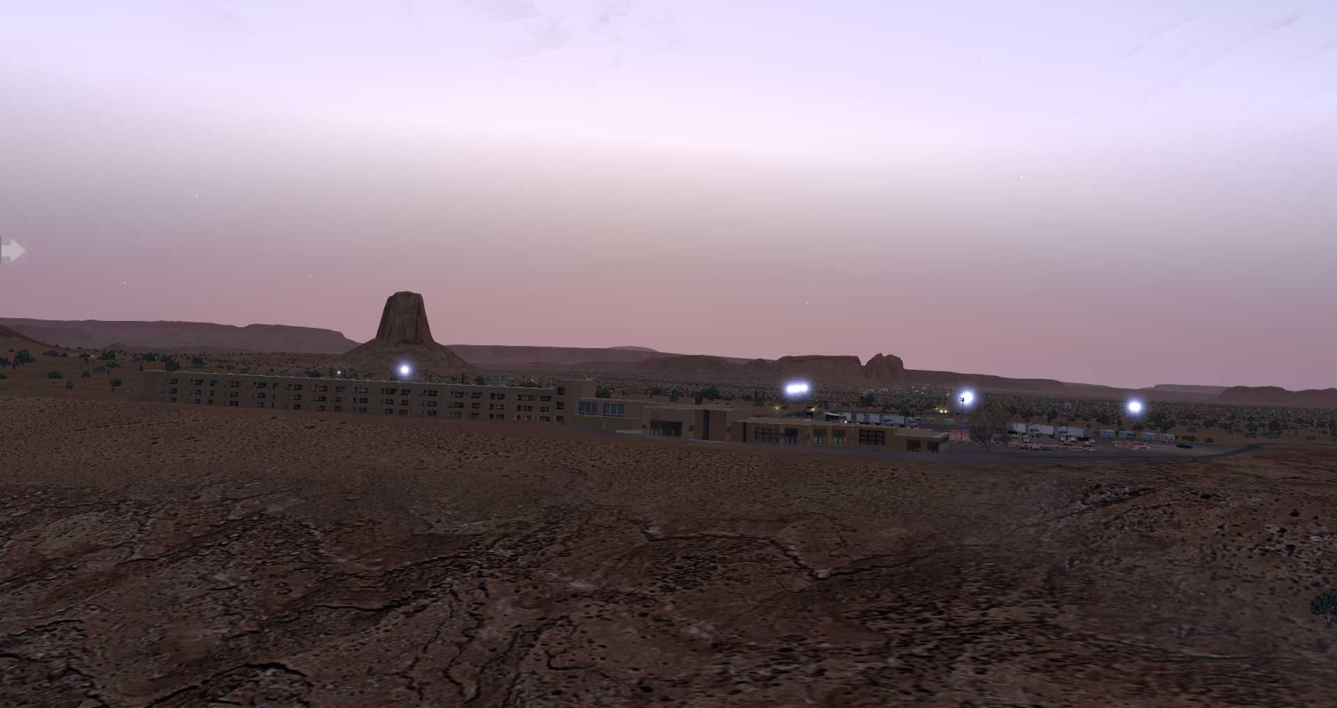Wenn wir unterschiedliche Tageszeiten durch schalten sehen wir auch die Farbwechsel, den diese Felsen am Tag durchmachen. Besser als es das UHD Mesh alleine hin bekommen kann. Typische Landclass Texturen können eben nicht auf ihre genaue Farbzusammensetzung abgestimmt werden, sondern sie repräsentieren eine Anzahl verschiedener Materialien. Doch hier hat man die Landclass Materialien genau an die Felsen anlehnen können, die im Monument Valley stehen.