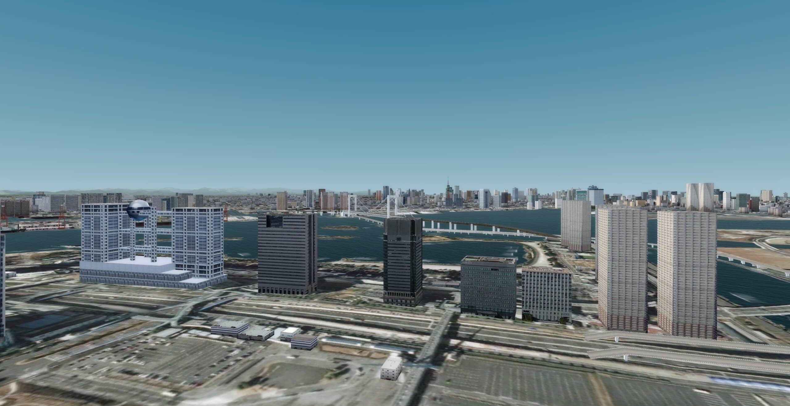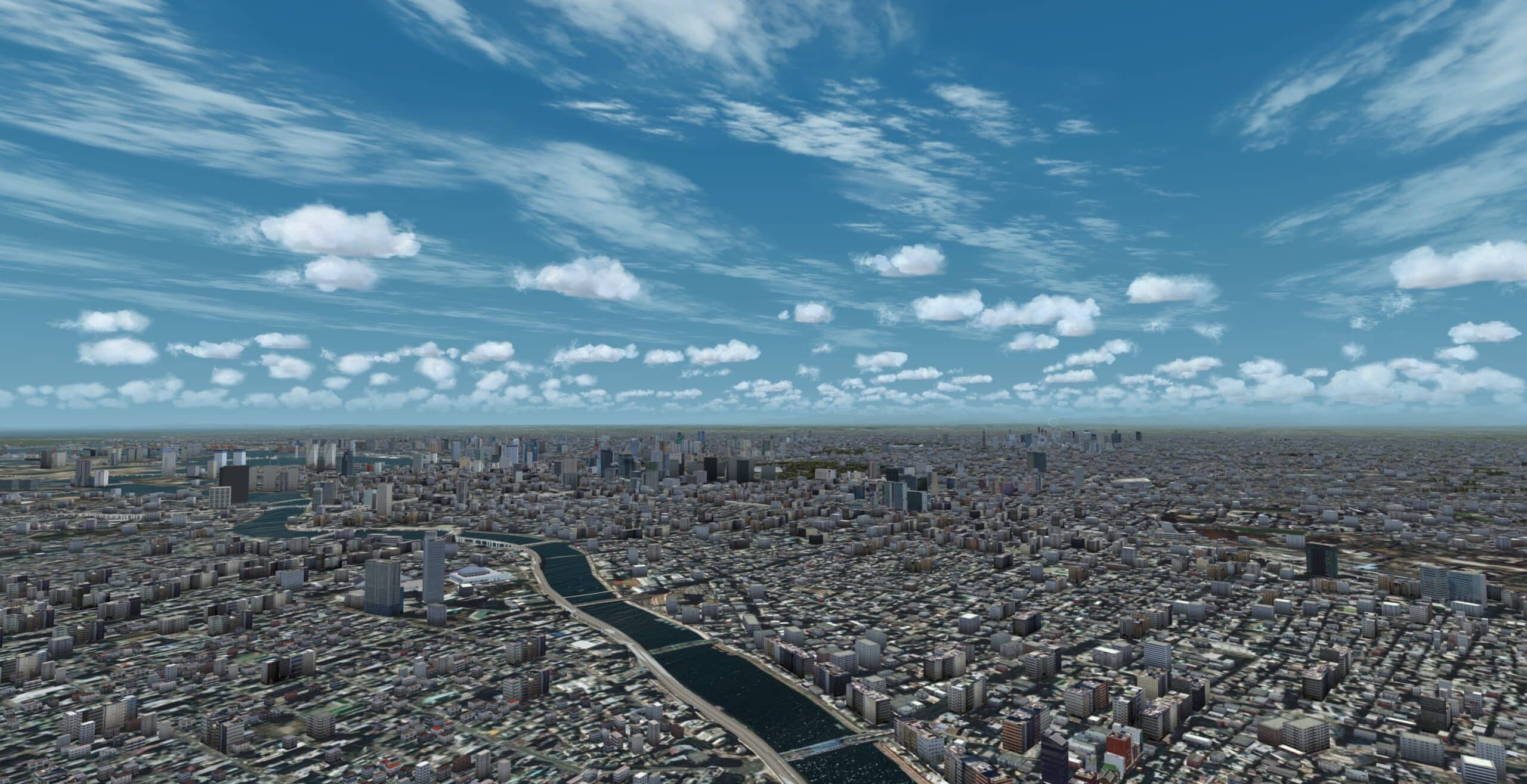 Leider habe ich keine Szenerie für Haneda und kann euch daher nur einen Anflug auf den Prepar3d-Default-Flughafen, Stand vor Neubau der Bahn 05/23 und des Tokyo International Air Terminal TIAT, anbieten. Mit PMDG’s 737 und ebenfalls extremen Gebäude-Autogen bleibt die Gegend immer fliegbar, mit Frames stets über 20, bei Darstellung in 4k. Und tatsächlich sieht die Skyline von Tokyo im Hintergrund sehr beeindruckend aus. Ein Vorteil für die Performance ist natürlich, dass Verkehrsflugzeuge in der Regel entlang der Küsten der Bucht an- und abfliegen. Die anspruchsvollen Gegenden in der Nähe der modellierten Zentren sind dann weit weg.