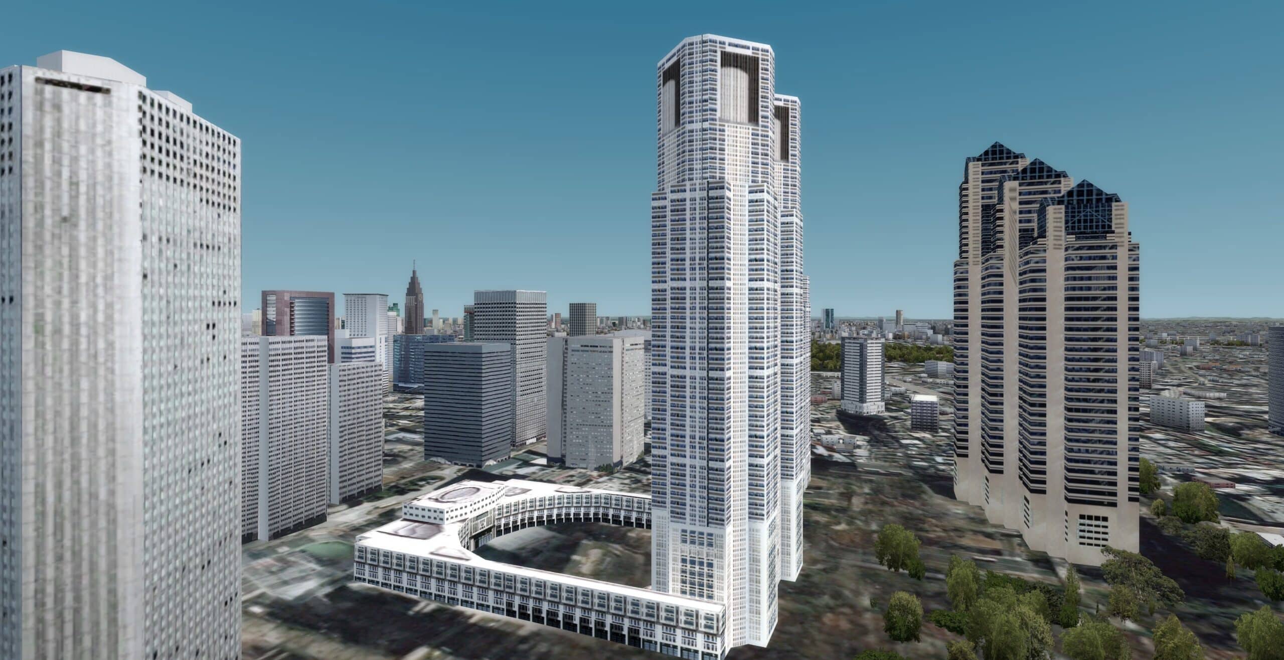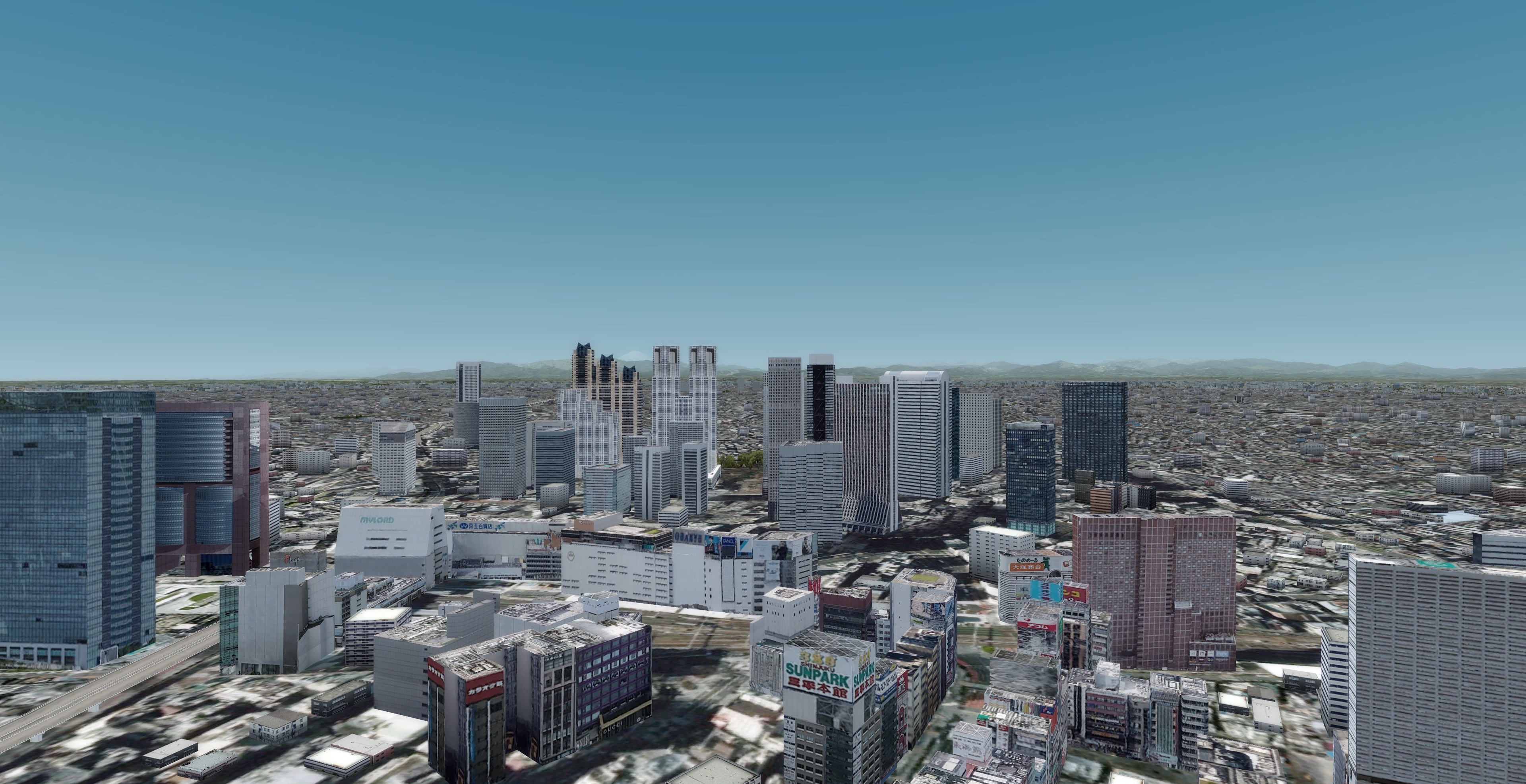 Als Beispiel für die detaillierteren Stadtviertel soll uns wieder Shinjuku dienen. Im Hintergrund ist das Hochhausviertel zu sehen, vorne die Kaufhäuser um den Bahnhof. Die bahnhofsnahen Gebäude sind mit realistischen Fototexturen beklebt und sehen ganz gut aus – dafür geht in diesem Bereich eben die Performance runter.