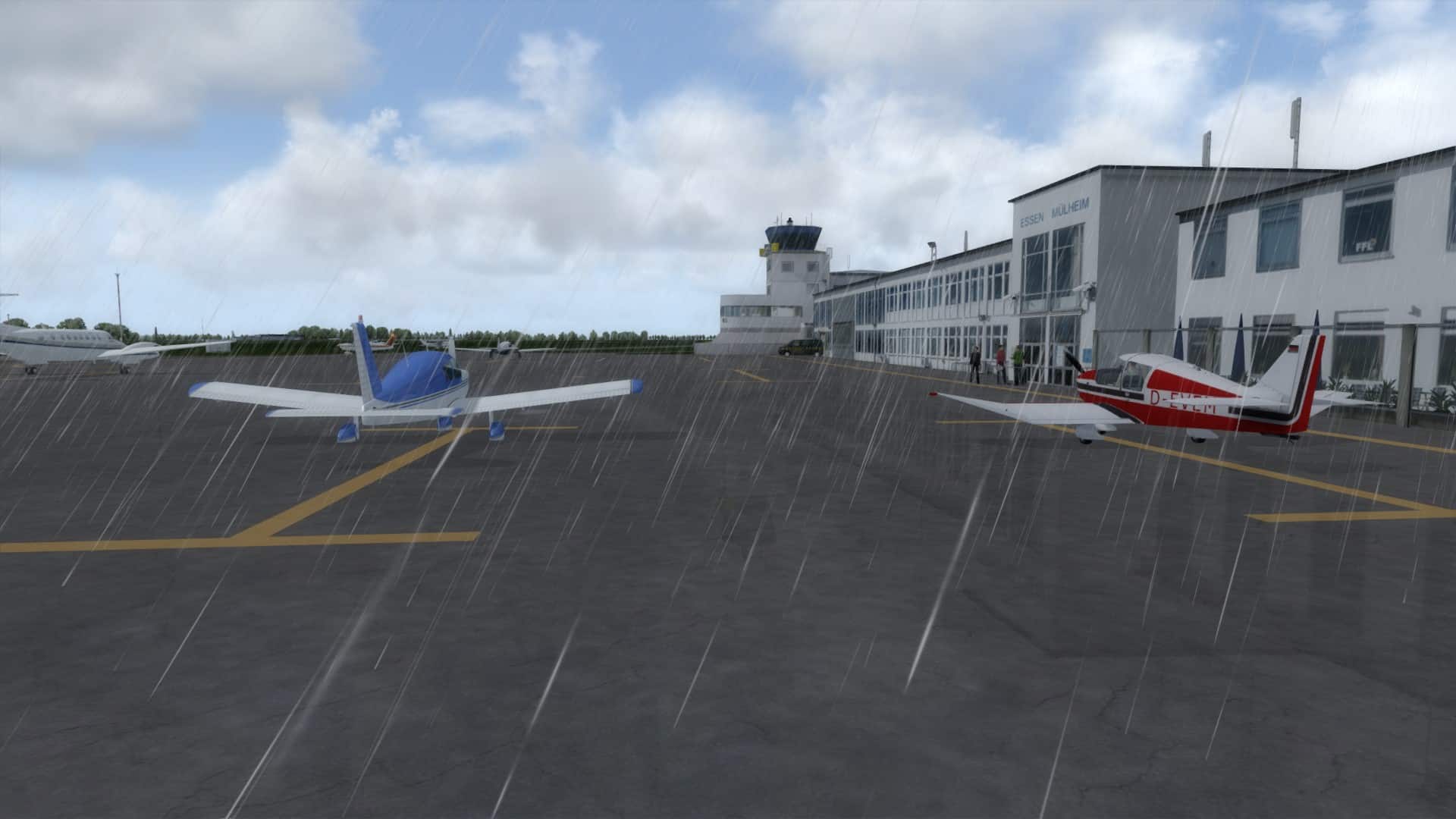 Die Gesamtanzahl der Texturen wurde nun verringert um damit den Textur-Load zu verringern. Das Update enthält nun aber auch ein neues Flughafenlayout mit differenzierten Materialeigenschaften bei denen die verschiedenen Materialien unterschiedlich auf Sonnenreflektionen reagieren. Dabei reflektieren die weißen Markierungen das Sonnenlicht anderes als die gelben Markierungen und die Asphaltoberfläche reagiert noch mal etwas anderes auf die Sonneneinstrahlung als die gelben und die weißen Bodenmarkierungen. Zusätzlich spiegelt die Asphaltoberfläche bei Regenwetter die Umgebung. Dabei tritt der Effekt stärker in Kraft, je mehr stärker es regnet. Der Spiegeleffekt ist also abhängig von der Stärke des Regen.