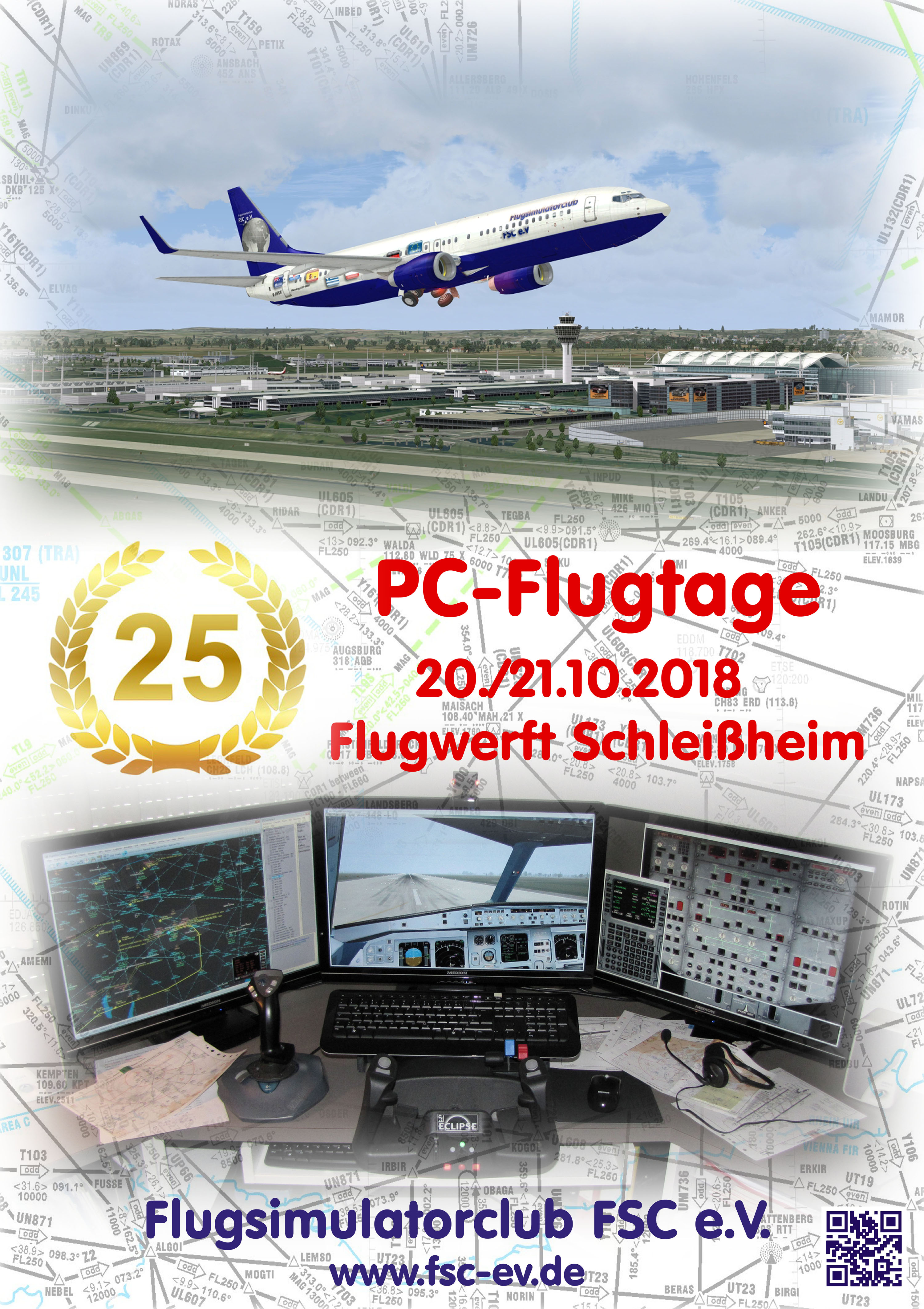 Der Flugsimulatorclub FSC e.V. (www.fsc-ev.de) lädt am 20. und 21. Oktober 2018 wieder alle Flugsimulationsinteressierte in die Flugwerft Schleißheim des Deutschen Museums München ein. Die Veranstaltung soll einen Einblick in das schöne und spannende Hobby der PC-Flugsimulation vermitteln, und sie dient auch dem gegenseitigen Austausch unter bereits aktiven virtuellen Piloten und Controllern.