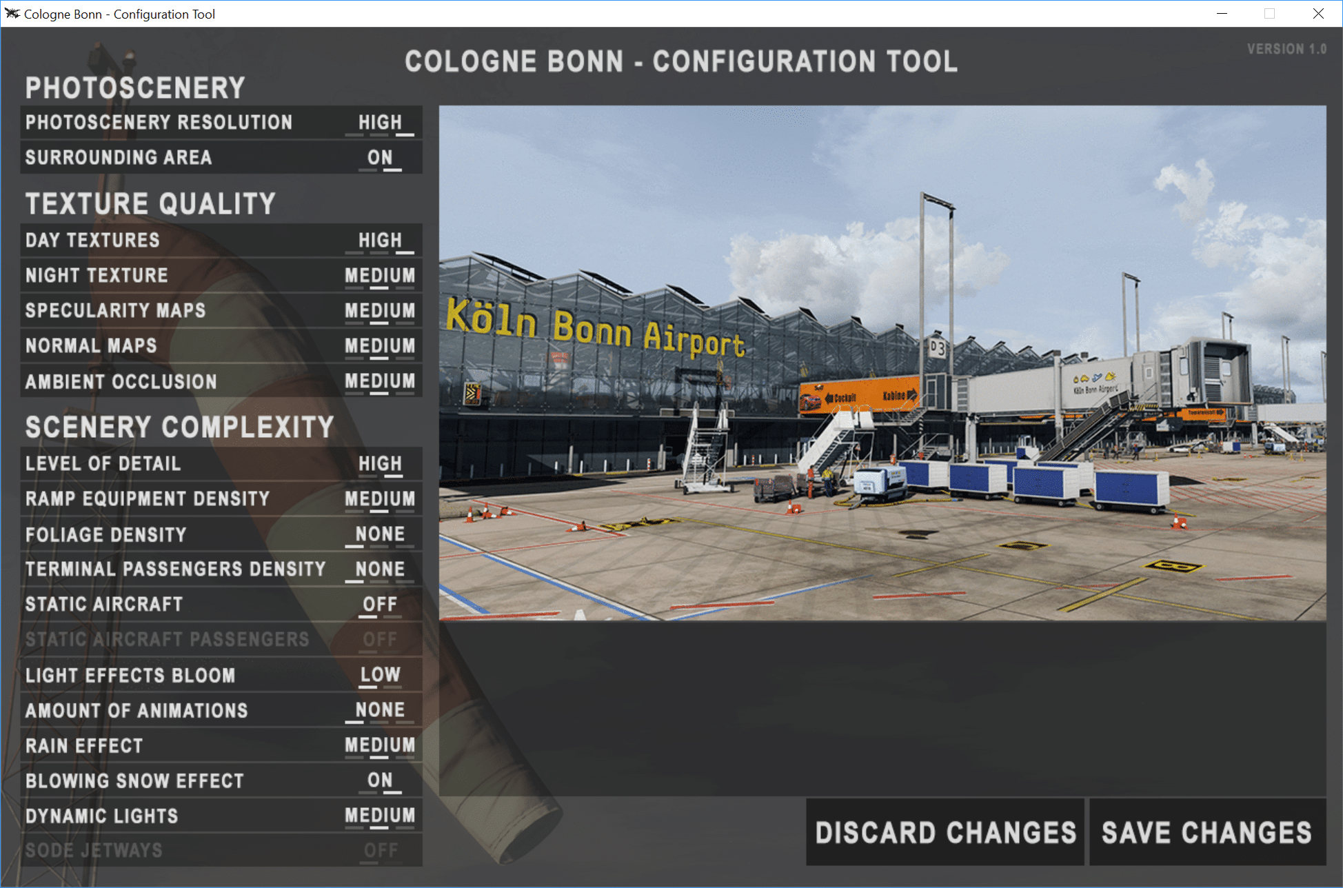 Der Hersteller verspricht einiges. In Summe einen extrem detaillierten Flughafen mit Fotoszenerie-Abdeckung der weiteren Umgebung (Köln, Bonn, Leverkusen), mit animierten Passagieren im Terminal und draußen beim Boarden der statischen Flugzeuge, die es auch nach langer Zeit mal wieder in einem Flughafen-Addon gibt. Es gibt auch Wintertexturen mit Schneeeffekten (ich komme mit scharfem Nachdenken schon auf 2-3 Tage Schnee pro Winter), vollmetrisches Gras, und extrem detaillierte Bodentexturen.