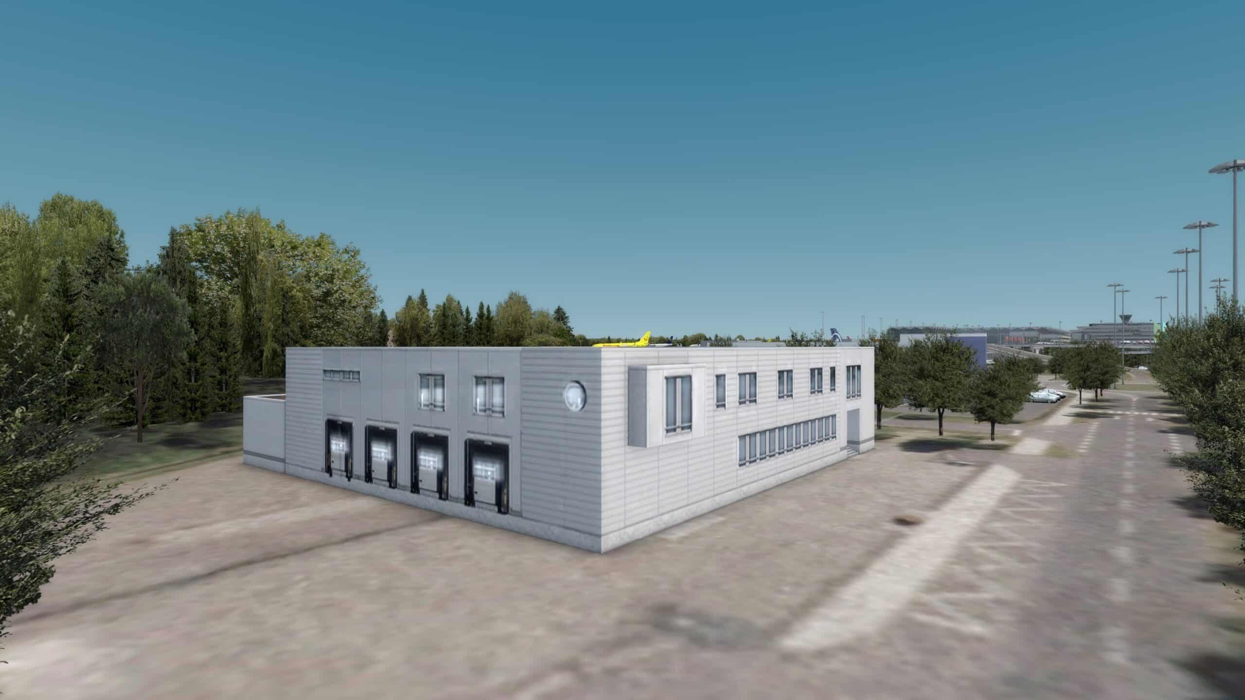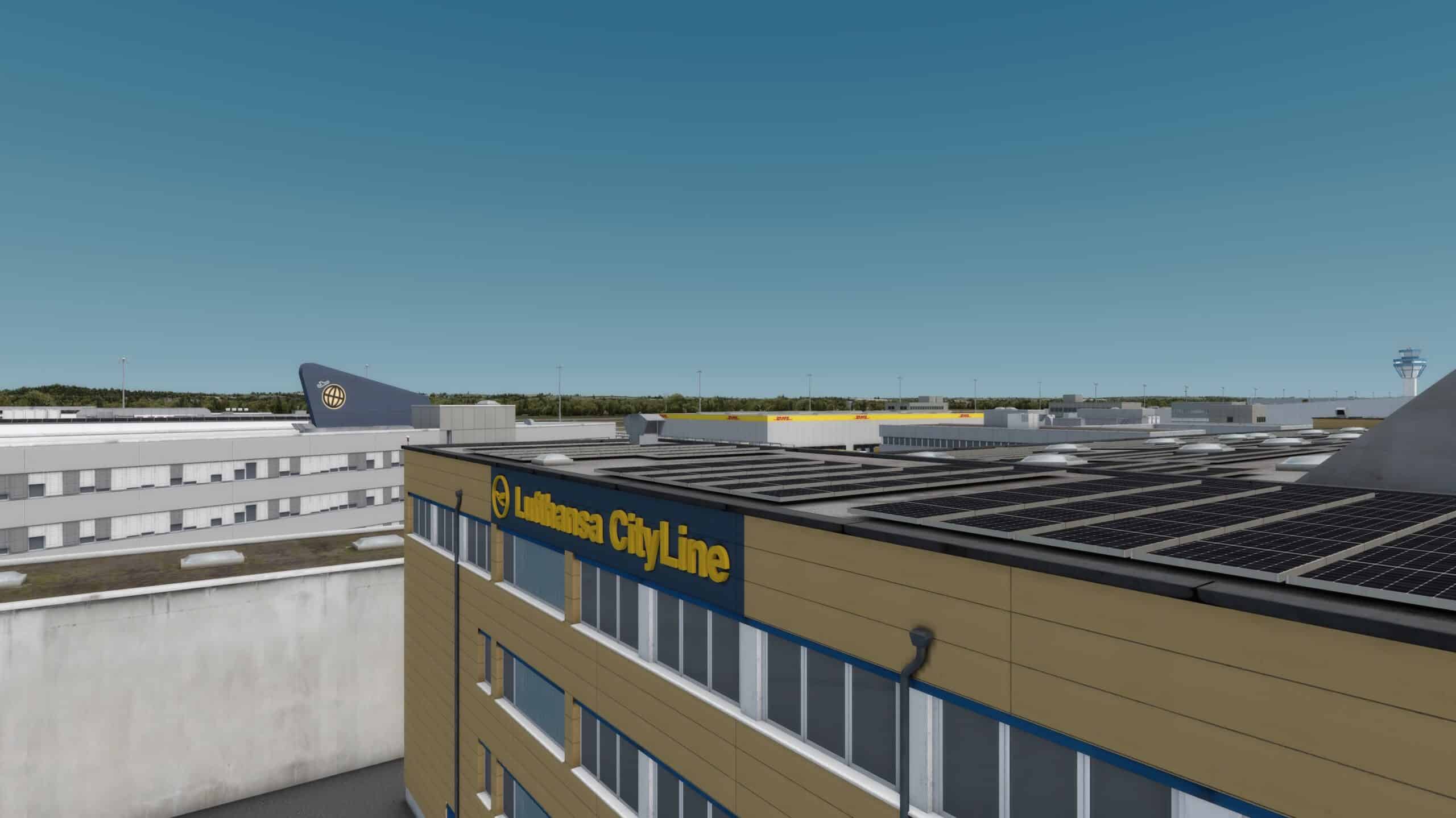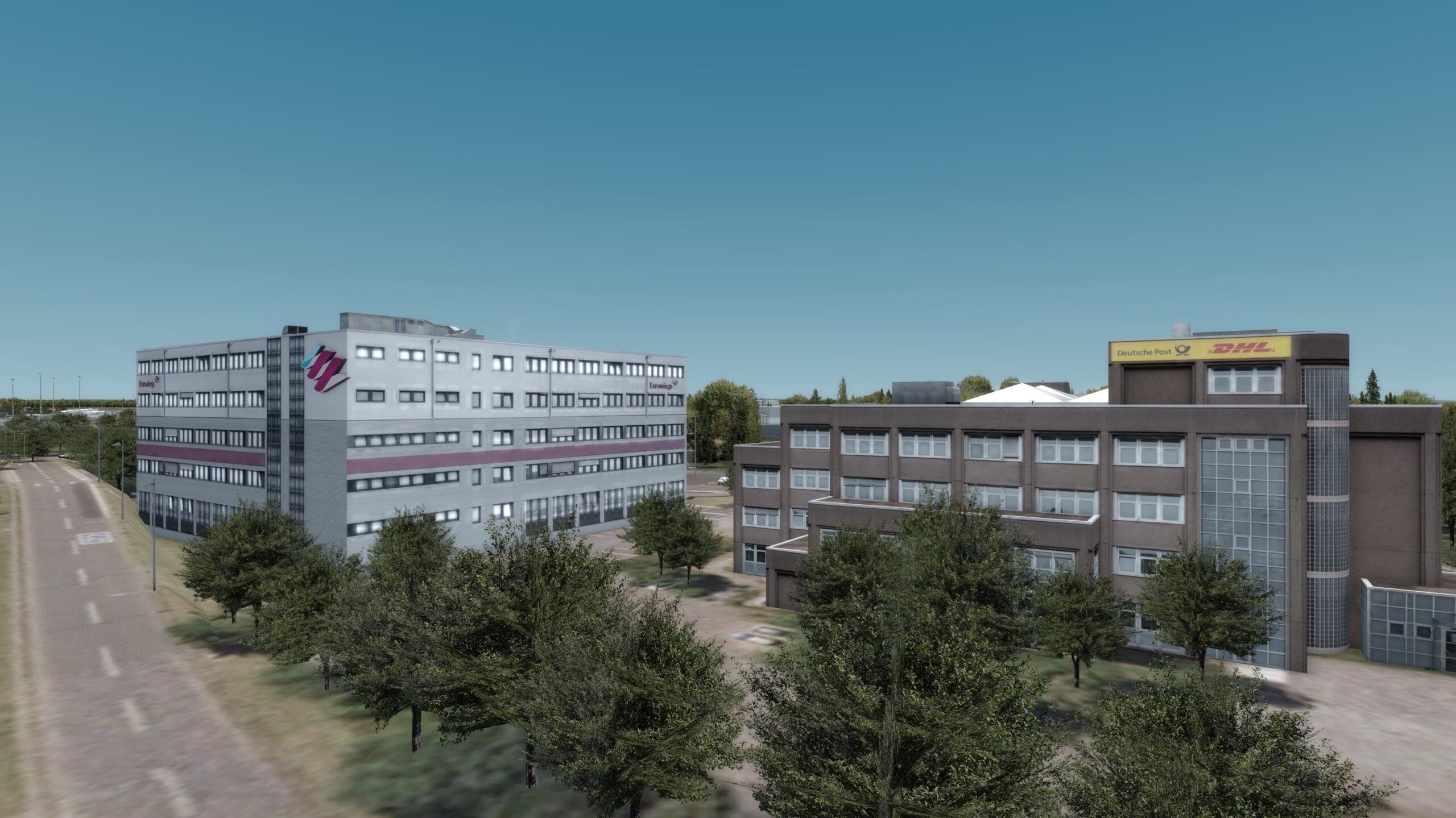 Neben der Airside des Frachtbereichs ist auch die Landseite exzellent dargestellt. Als ich hier mit dem Avatar für die Bildschirmfotos unterwegs war habe ich das erste Mal überlegt, ob Jo Erlend Sund vielleicht vollständigen Zugang zum Flugplatz hatte; hier sind Geländeteile extrem scharf umgesetzt, die eher schwierig zugänglich sind. Besonders schön finde ich den 3D-Schriftzug auf dem Cityline-Gebäude.