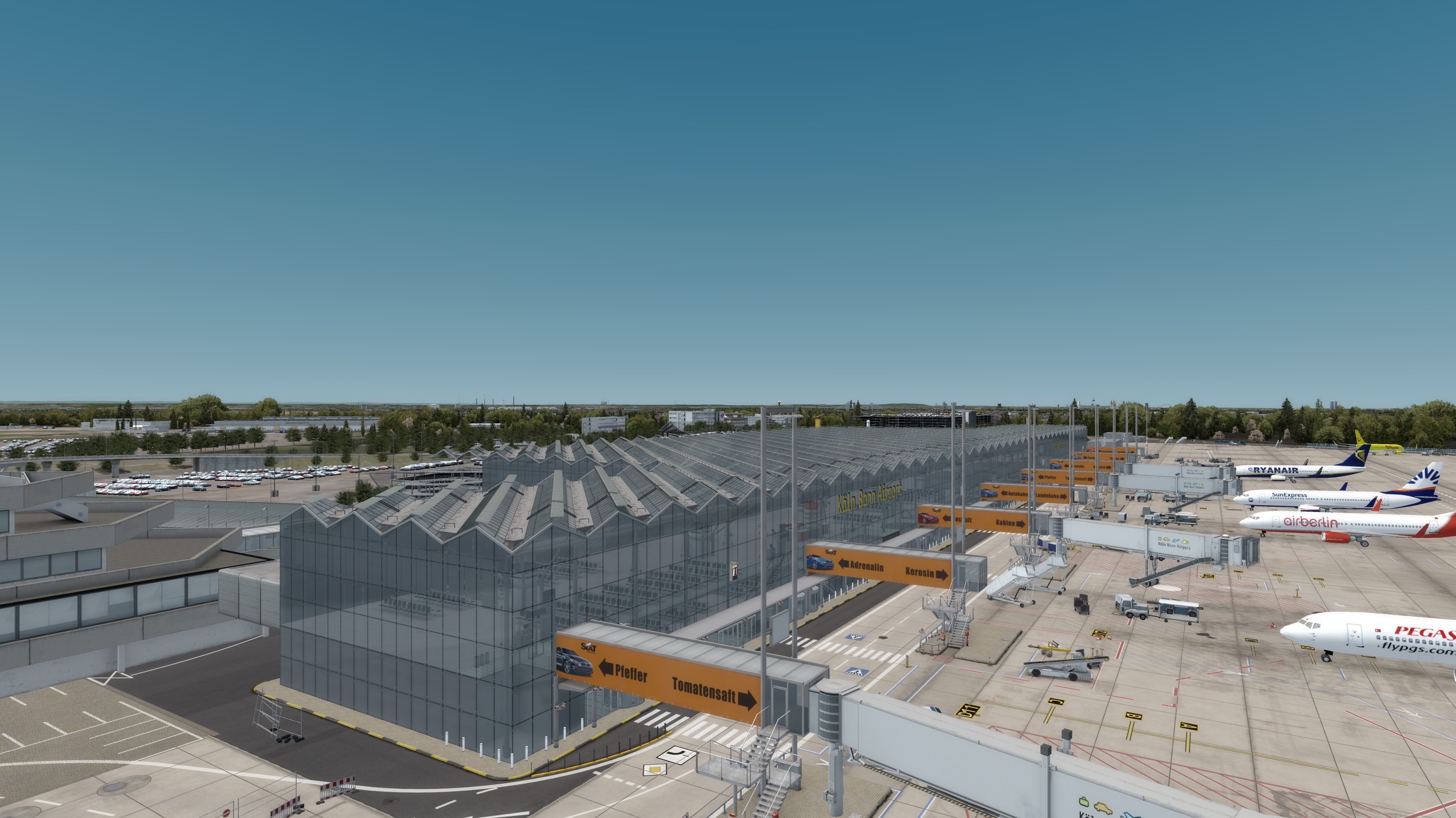 Auf dem Bild sind die statischen Flugzeuge deaktiviert; alle Flugzeuge, die zu sehen sind, sind von MyTraffic hingezaubert. Die Zuordnung der Fluglinien zu Gates passt grob: GermanWings und Lufthansa an Terminal 1, AirBerlin (ja, die fliegen bei MyTraffic 6 noch!) und Ferienflieger an Terminal 2.