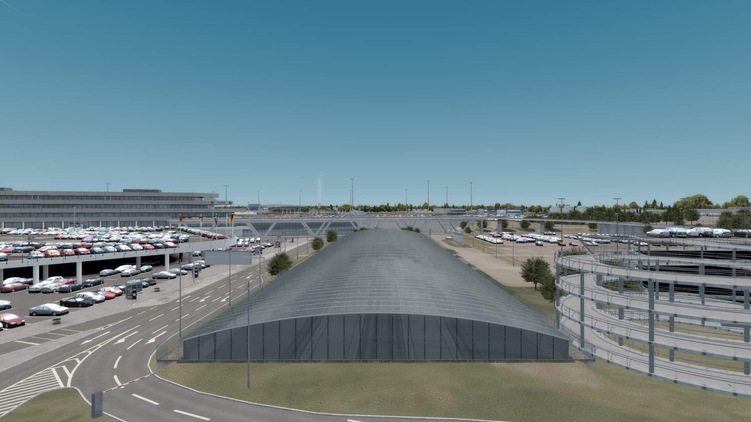An Terminal 1 schließt sich der Glasbau des Terminals 2 an, dem gegenüber Parkhaus 2 liegt. Parkhaus 3 ist im rechten Bildrand zu erkennen.
