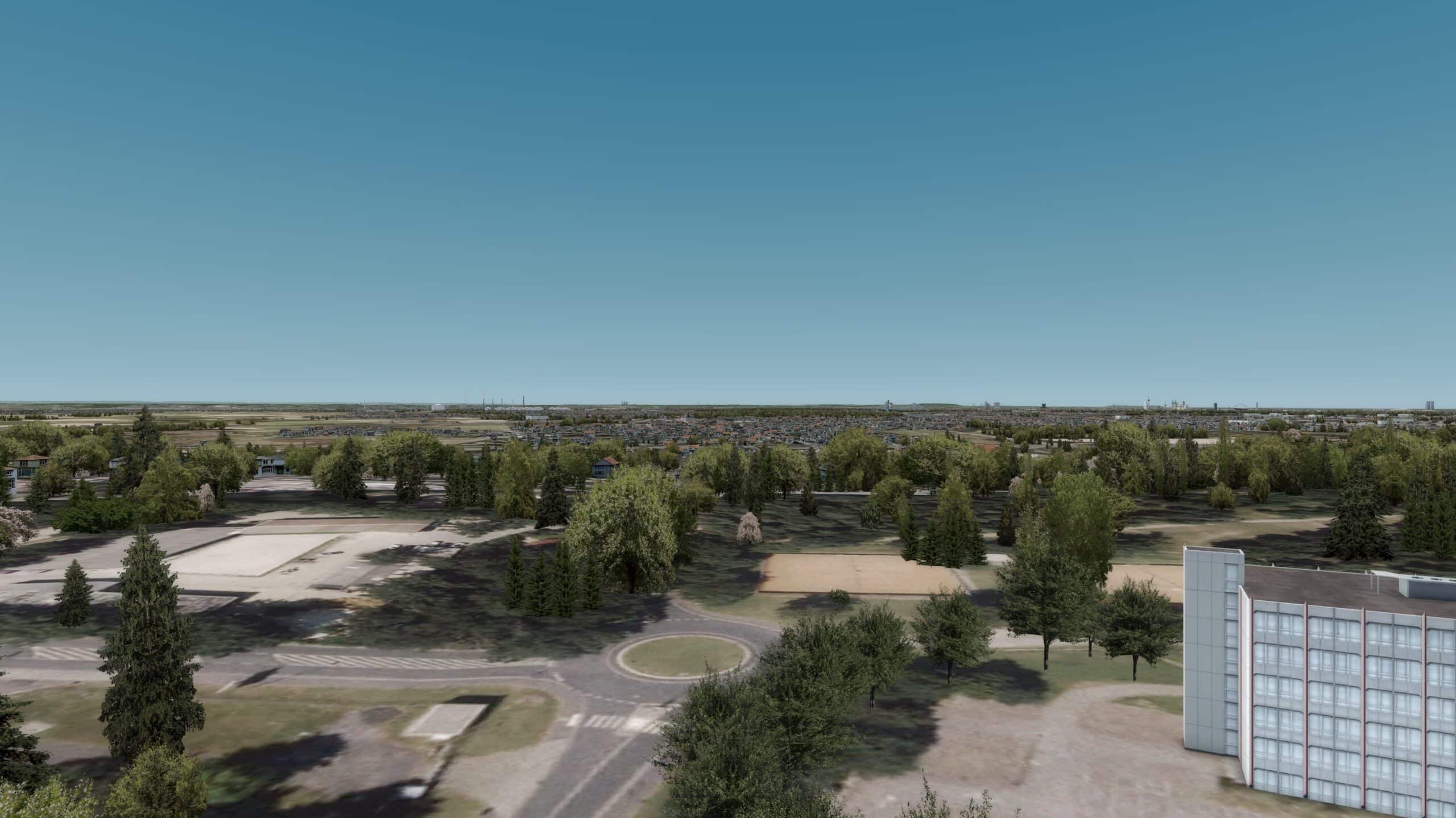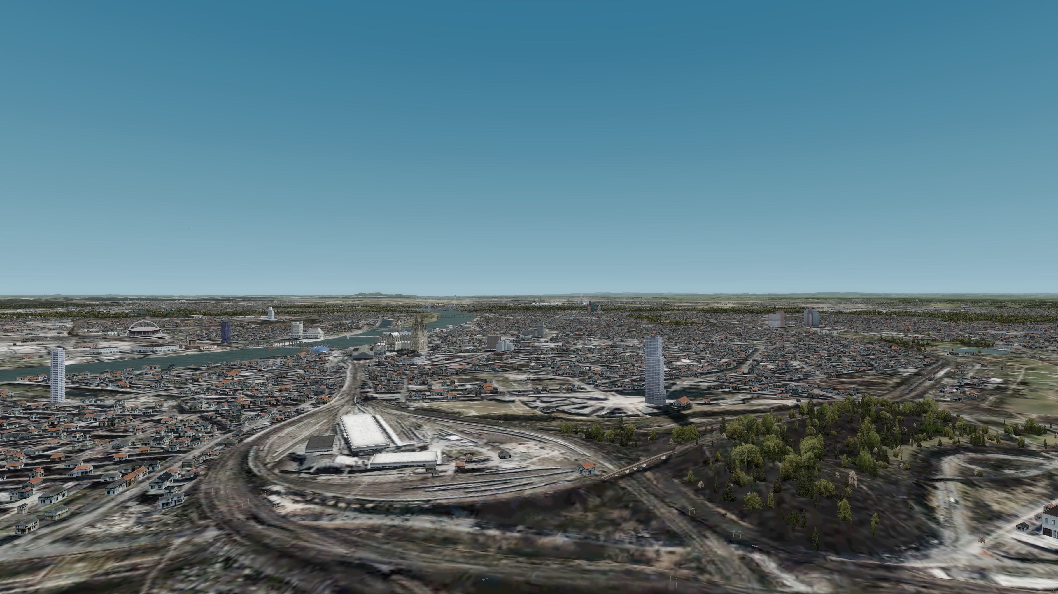 Hier noch ein Beispiel der Abdeckung im Kölner Stadtgebiet: Bahnbetriebswerk, Herkulesberg und Mediapark, im Hintergrund Rhein und Innenstadt. Die Abdeckung mit Autogen-Bäumen passt gut; Autogen-Gebäude hatte ich aus Performance-Gründen eingespart. Da wo sie zu sehen sind passen sie zur Fototextur.