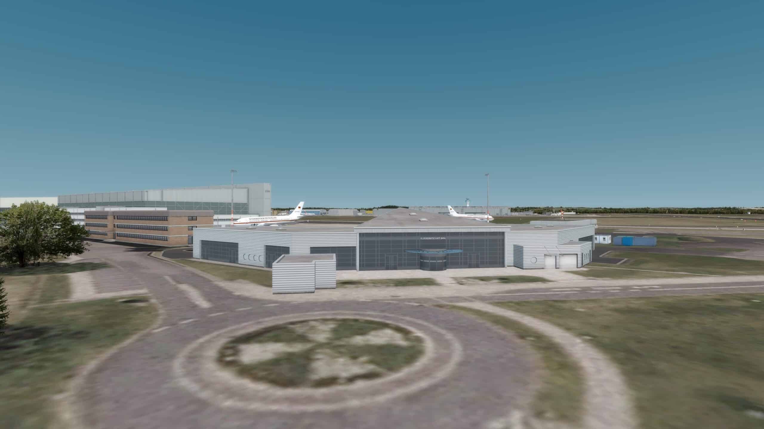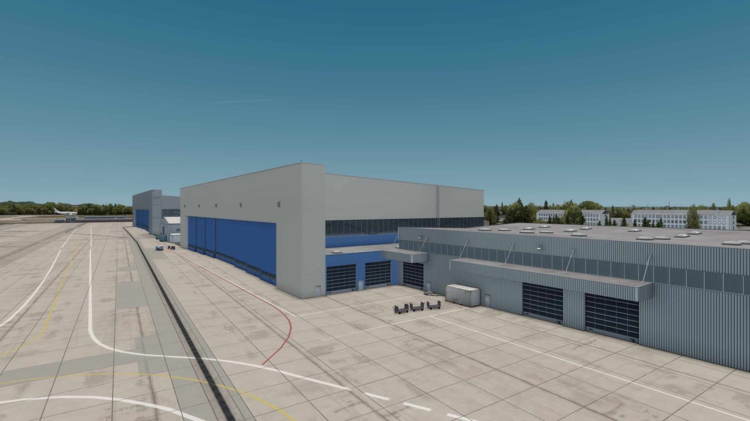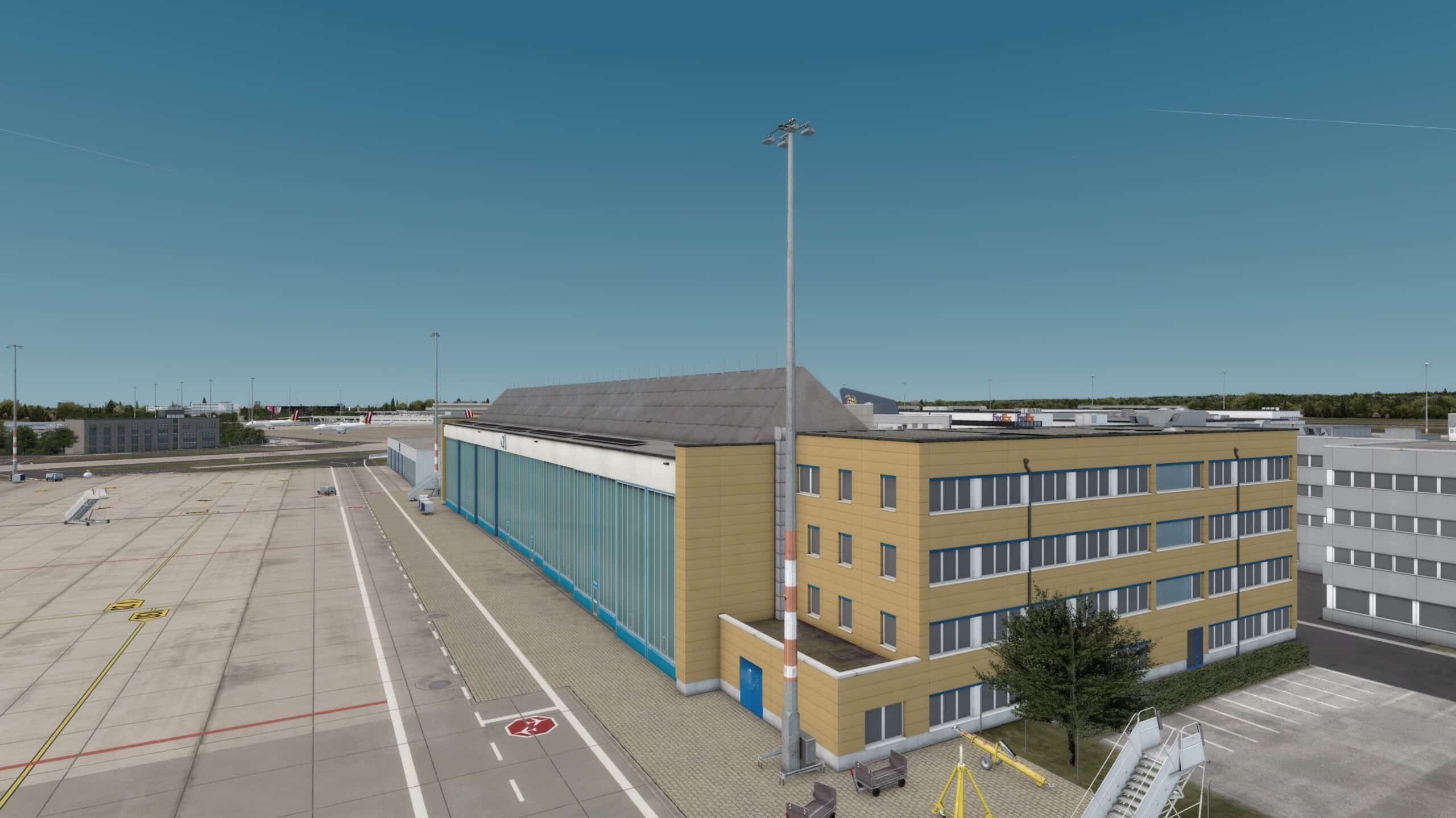 Schön auch der militärische Teil. Der ist nicht ganz so spektakulär, es gibt ein paar Hallen und ein Gebäude, aber alleine die Umsetzung dieses sehr weit vom Geschehen entfernten Empfangsgebäudes finde ich schon toll. Die abgebildeten Flugzeuge sind von MyTraffic; statische Flugzeuge stehen hier hinten nicht.