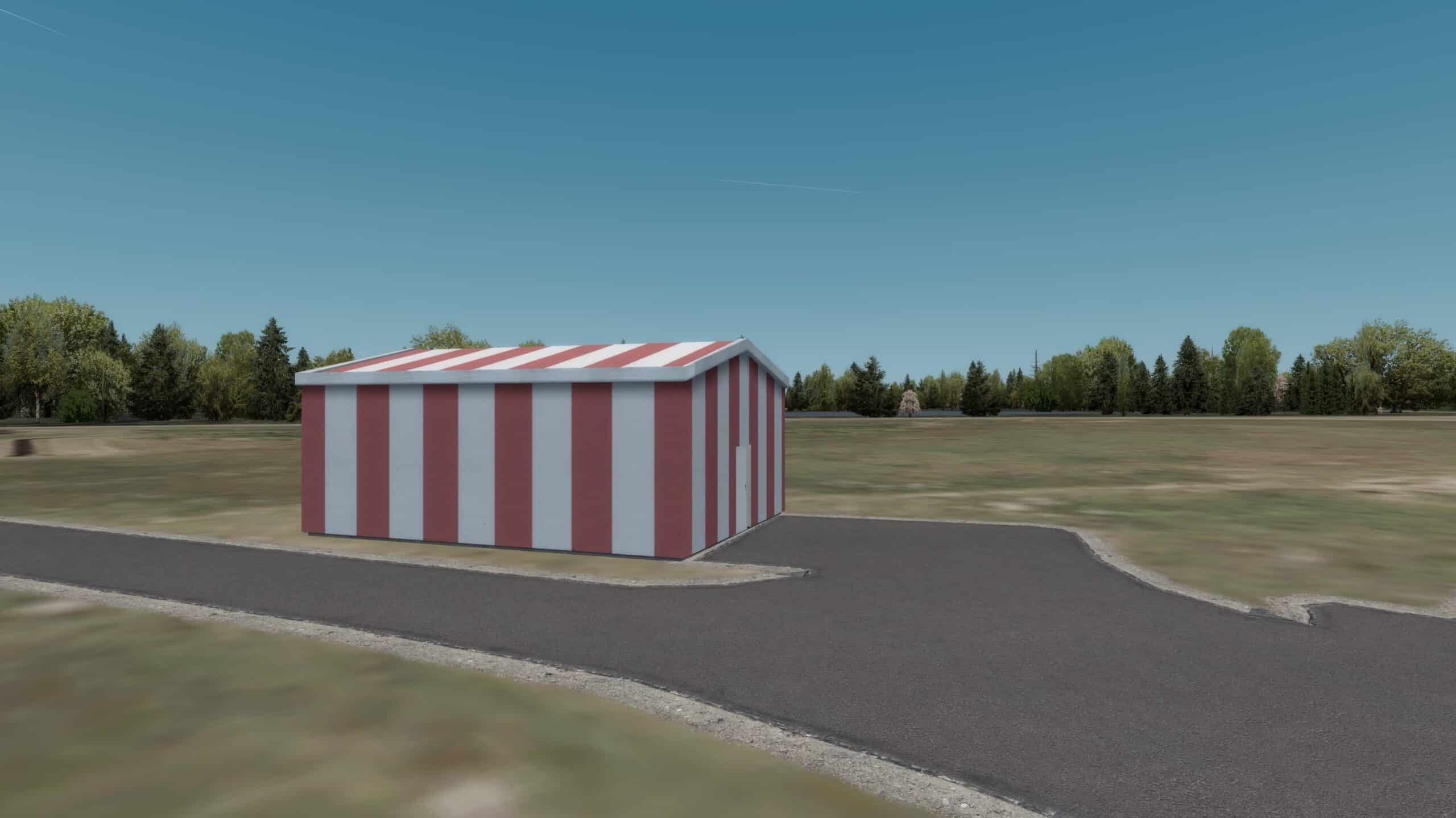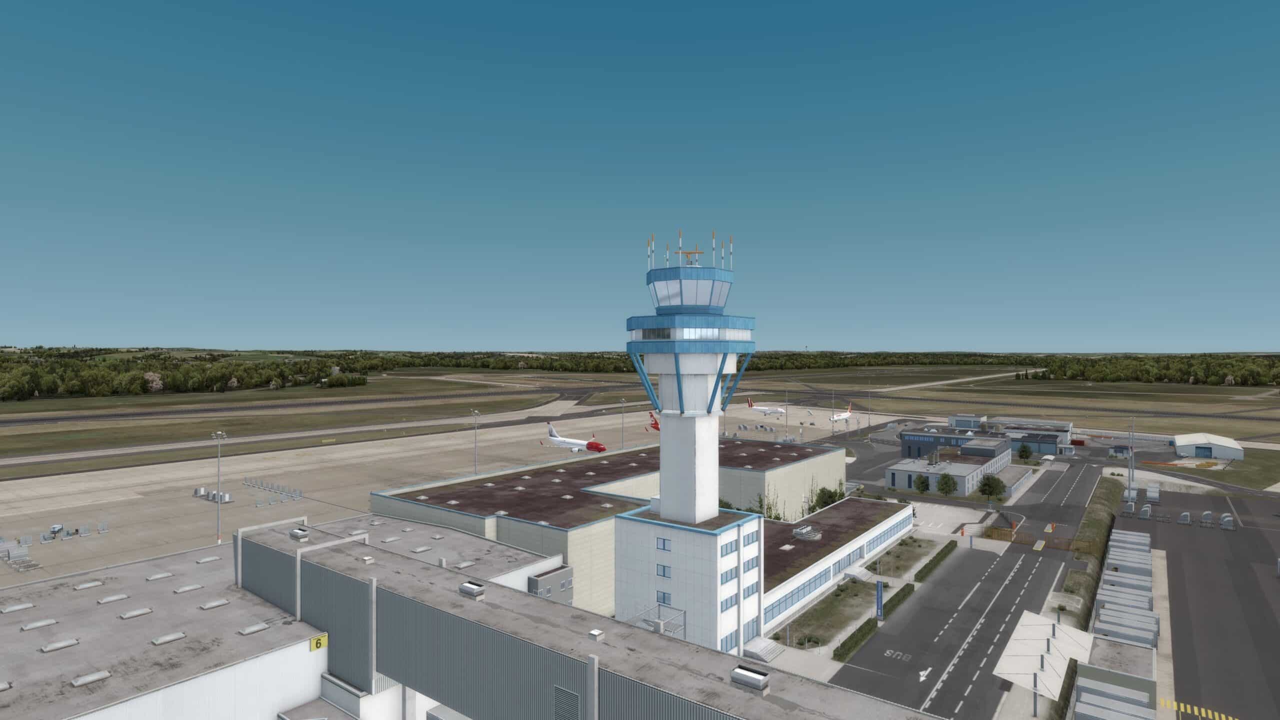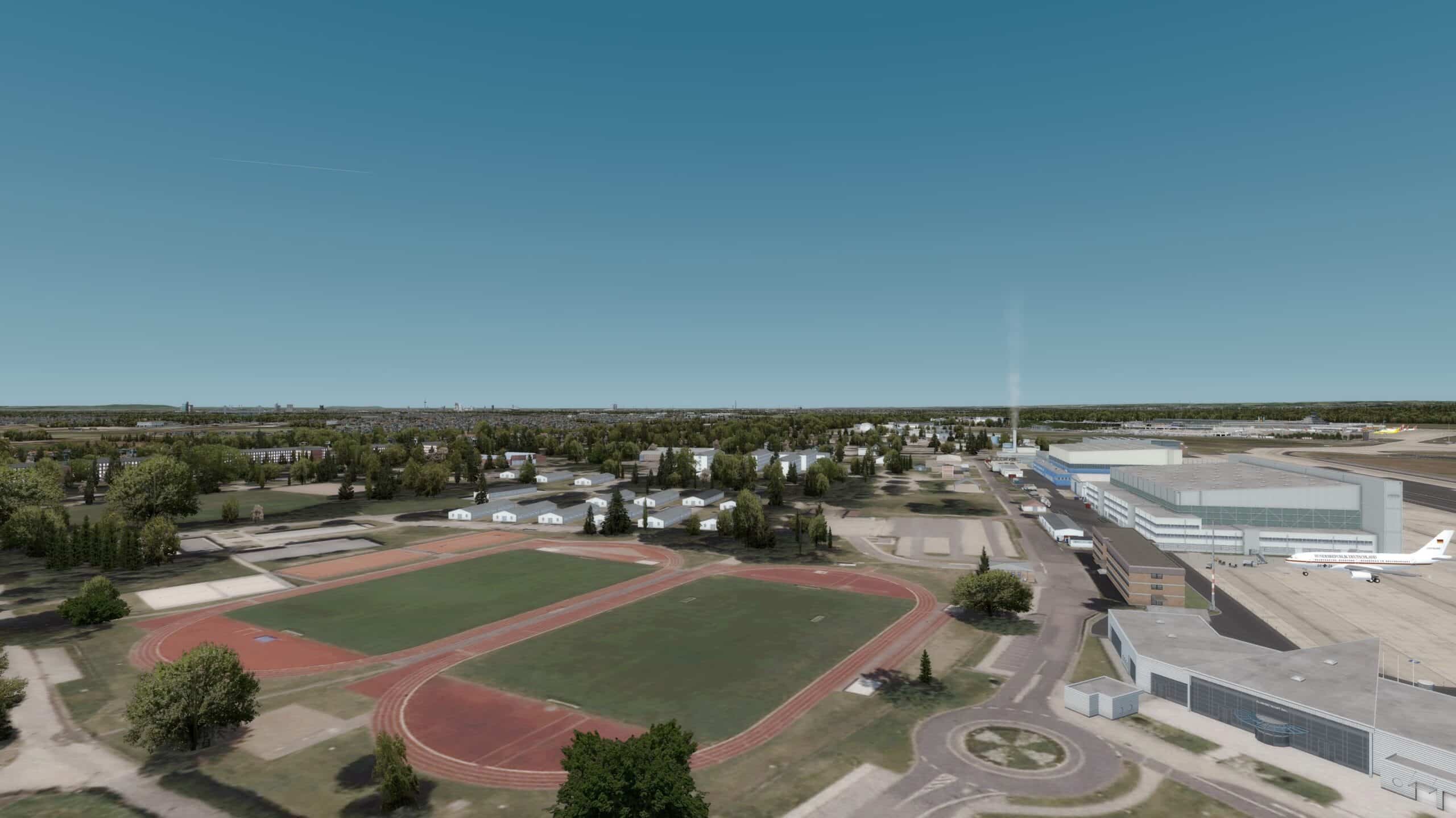 Schön auch der militärische Teil. Der ist nicht ganz so spektakulär, es gibt ein paar Hallen und ein Gebäude, aber alleine die Umsetzung dieses sehr weit vom Geschehen entfernten Empfangsgebäudes finde ich schon toll. Die abgebildeten Flugzeuge sind von MyTraffic; statische Flugzeuge stehen hier hinten nicht.