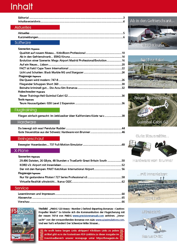 Der X-Plane 11 kommt auch in dieser Ausgabe groß heraus: Mit TrueEarth Great Britain South, KORD v3, dem „Airport mit Innenleben“ dem Rüdiger von Oehsen persönlich kennt. Mario Donick hat Ketchikan besucht, den „Airport mit den Rampen“. Hans-Joachim Marks bewertet die 727 Pro Series v3 als für gestandene Piloten geeignet. Last and least stellt er die Ikarus C42C vor, das Ultraleicht für die virtuelle Realität.