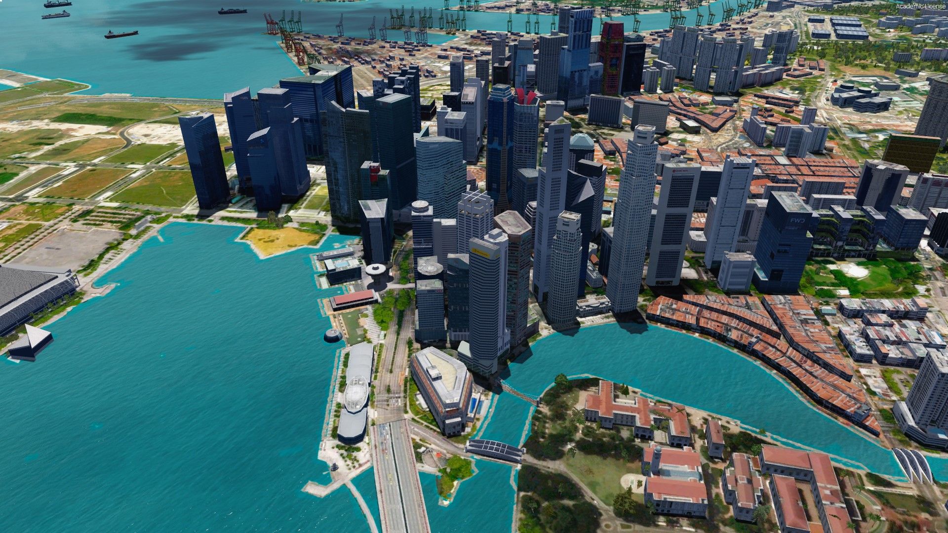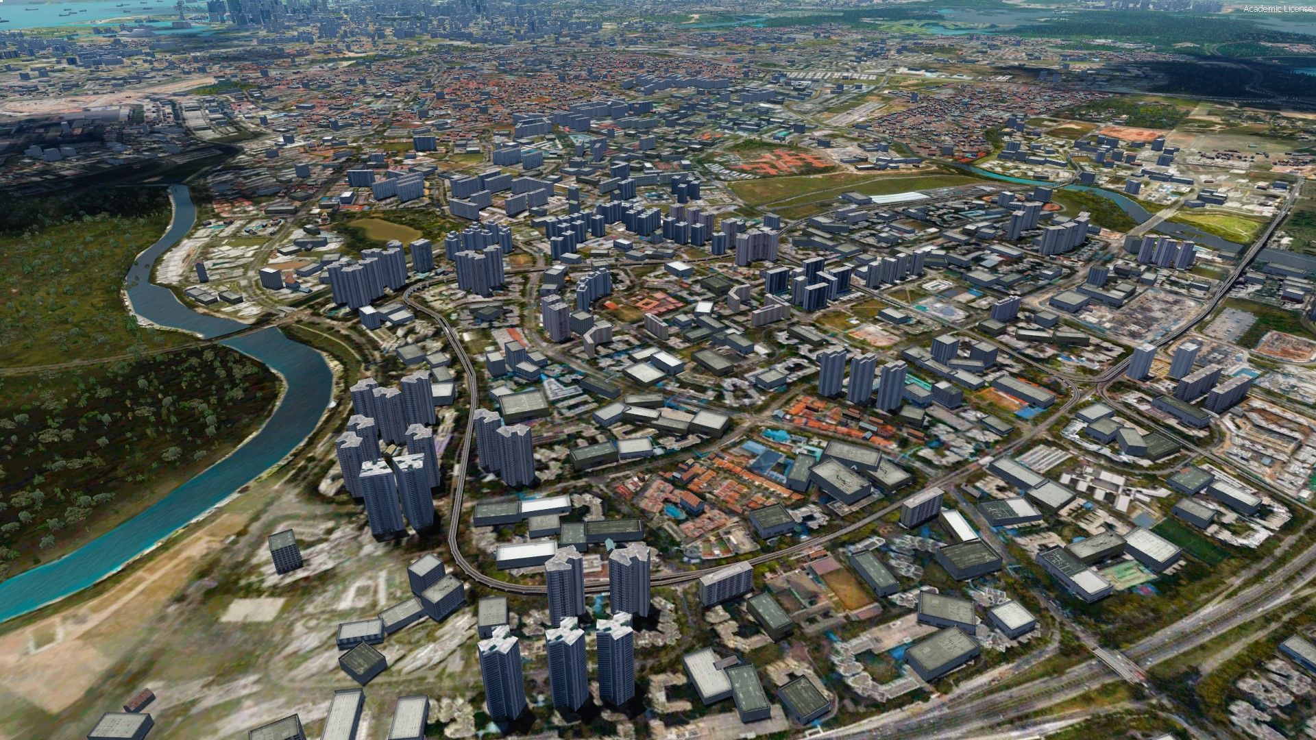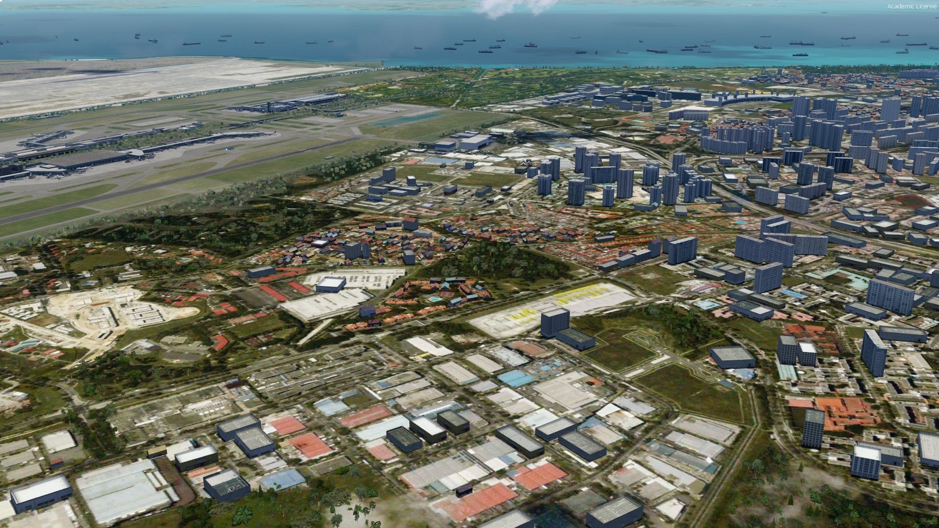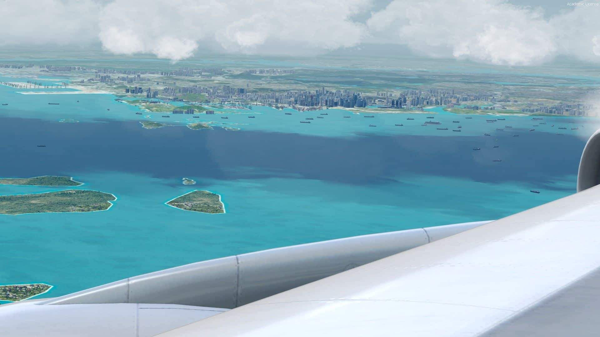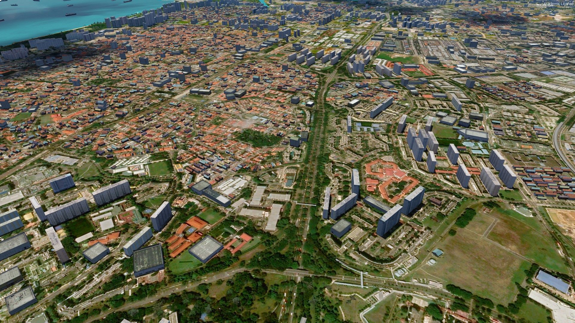 Ähnlich wie auch an der Küste nimmt auch die Qualität der Szenerie an Land in Richtung Westen ab. Zwar fehlen hier nicht so viele Objekte wie in den Häfen, man erkennt allerdings schon merklich, dass der Fokus der Entwickler näher am Flughafen liegt. Im Vorbeiflug, beispielsweise aus Europa kommend, von Norden aus den Flughafen Changi anfliegend, macht die Stadt (aus einer gewissen Höhe) aber einen recht netten Eindruck. Im Vergleich zu Orbx Global ist das schon eine deutliche Aufwertung und ein ganz anderes „Feeling“.